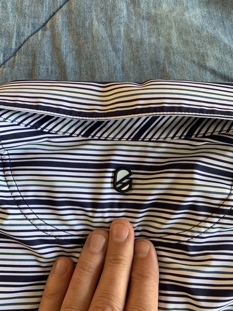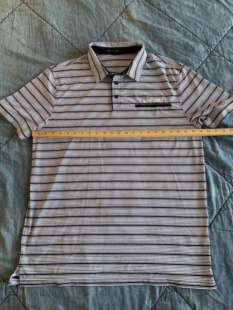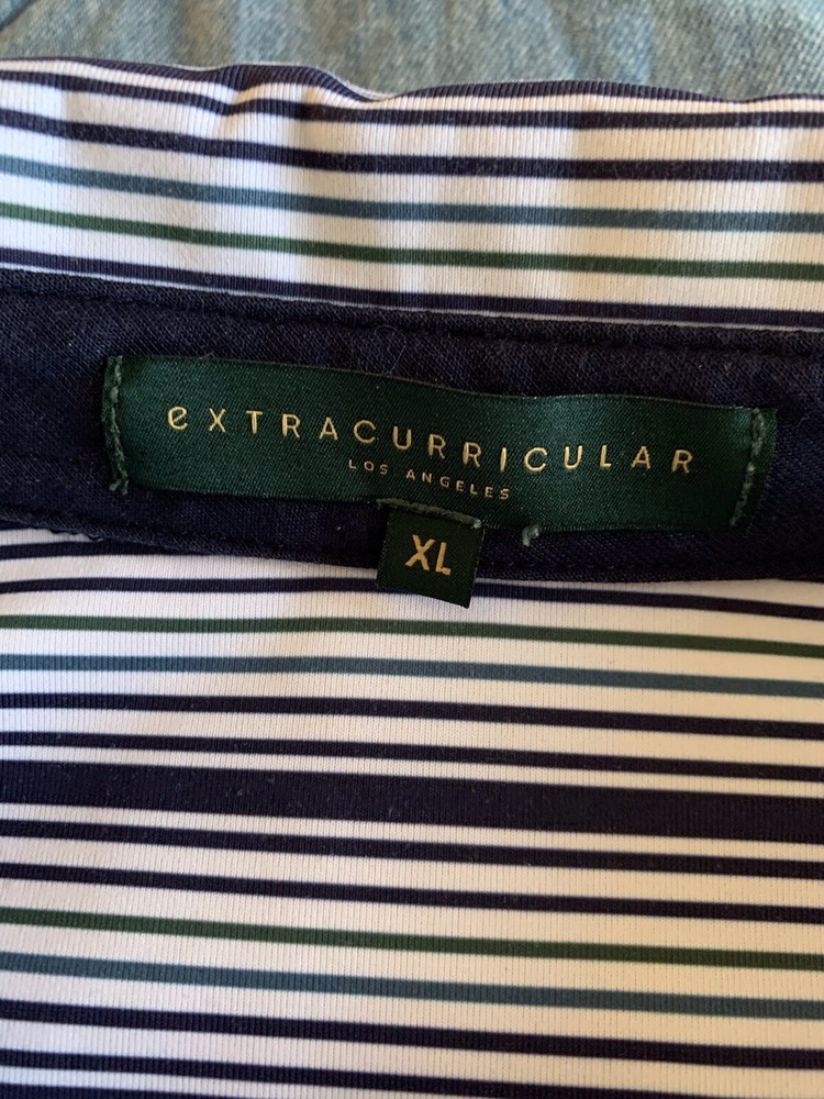 The Extracurricular LA LIV GOLF Polo Shirt for men is a stylish and comfortable option for those who enjoy playing golf. This short sleeve polo features a blue and green striped pattern, collared neckline, and button accents with a logo detail. Made from a blend of polyester and spandex, this shirt offers a stretch fit for maximum comfort on the golf course. Designed with a regular fit in size XL, this polo is a practical and fashionable choice for any golfer looking to elevate their wardrobe with a touch of style.