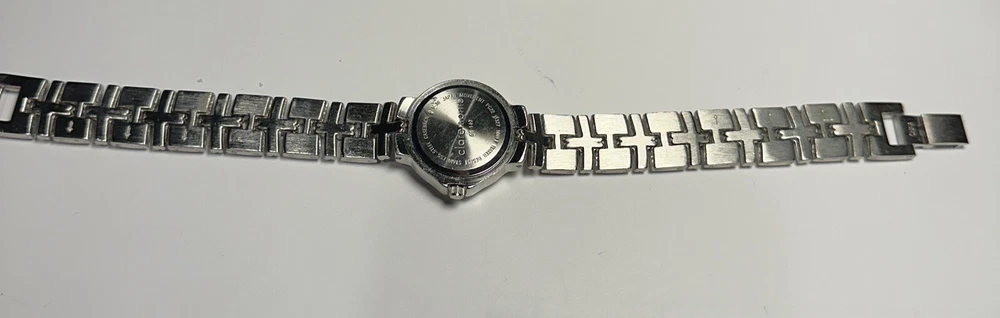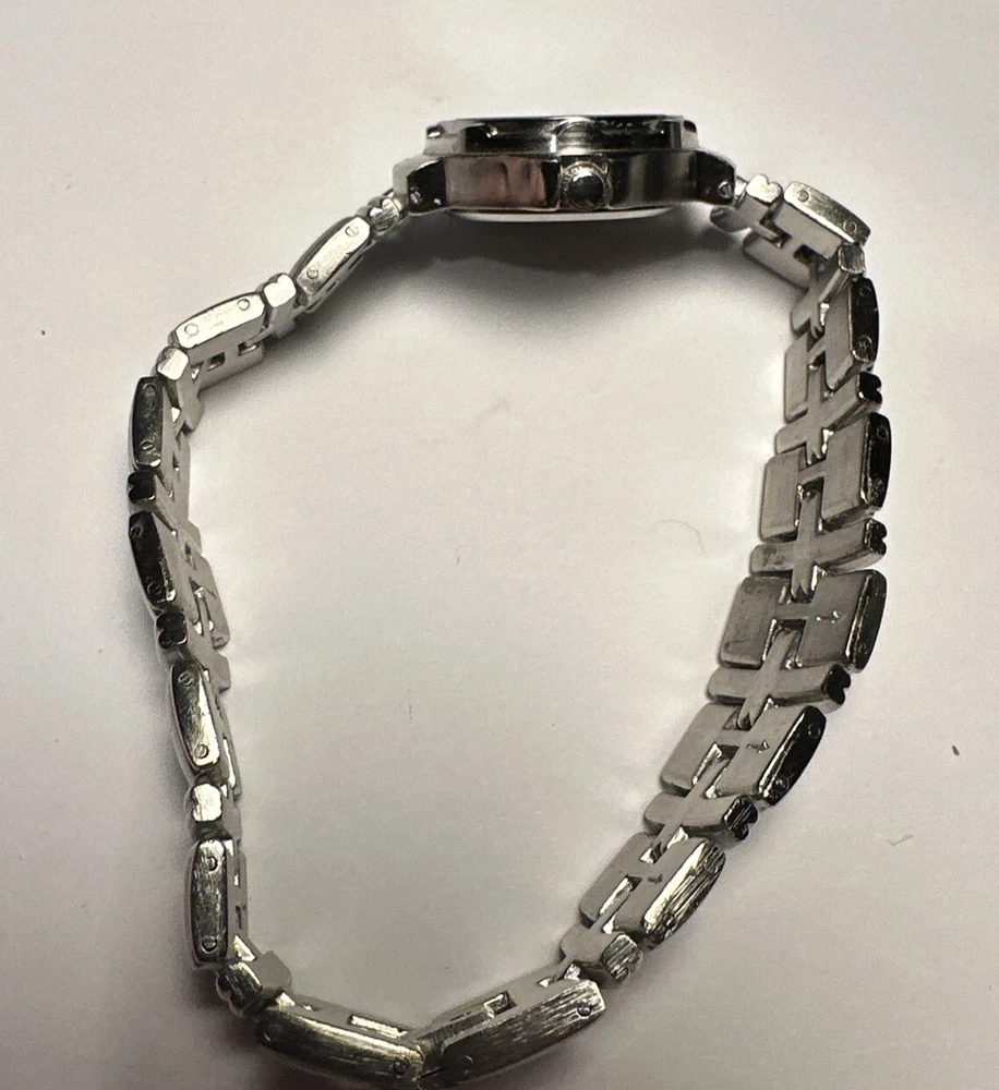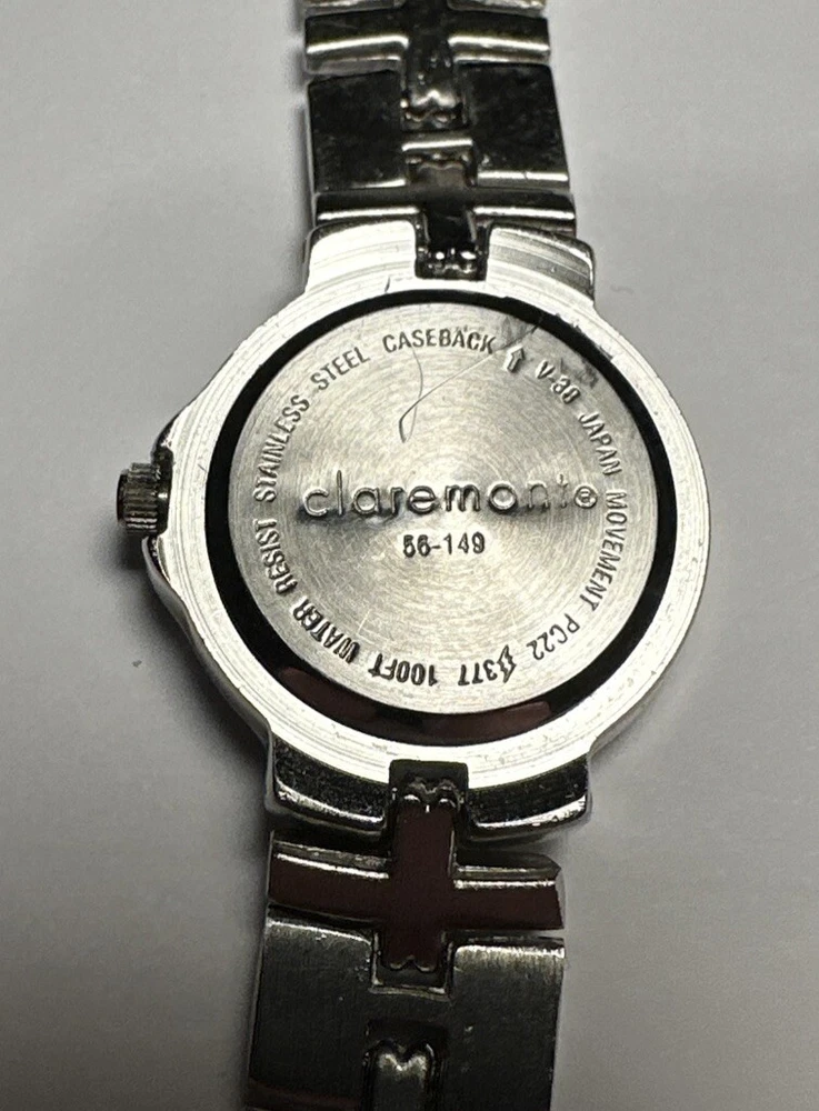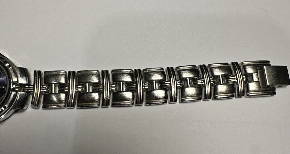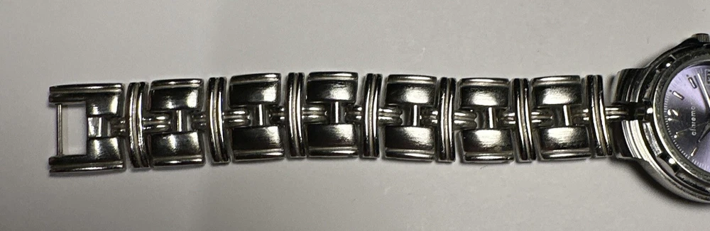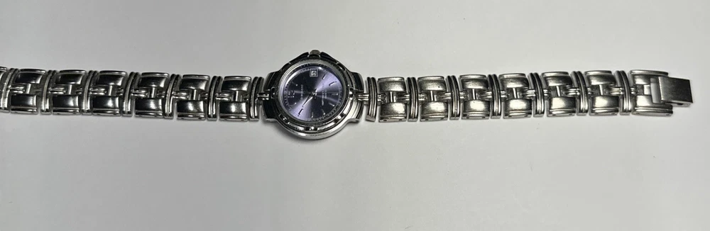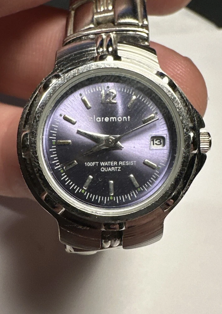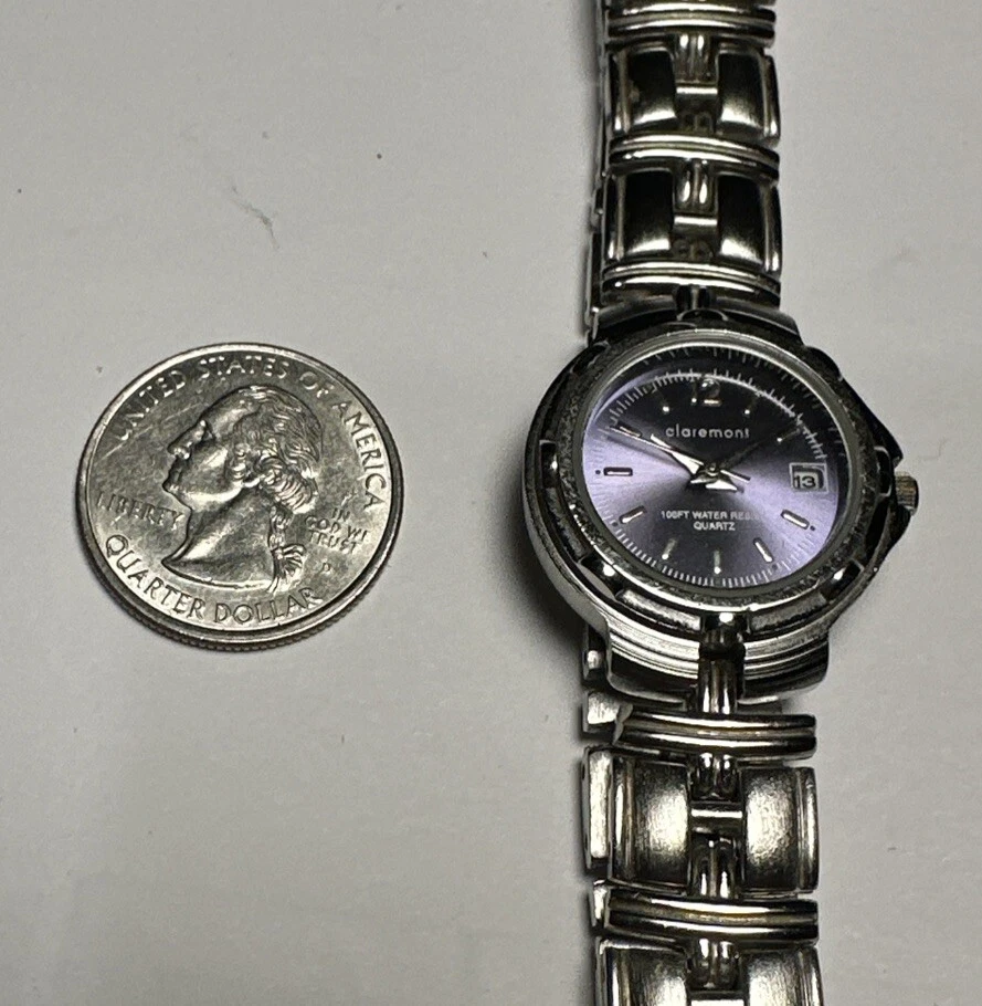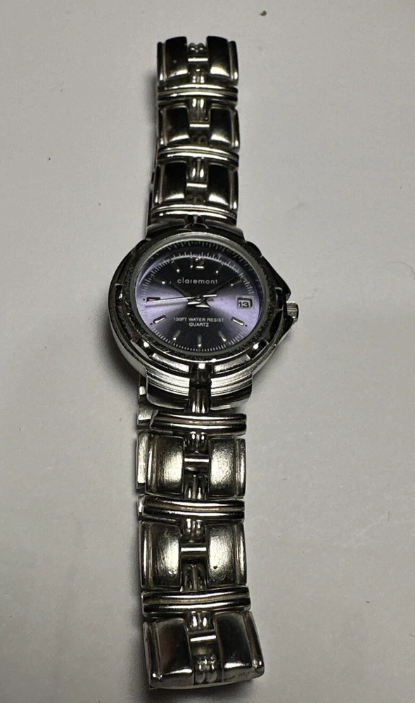 This ladies Claremont wristwatch features a light purple dial with non-numeric hour marks and a 12-hour dial, as well as a date indicator and central second. The watch has a silver colored case and bezel, and a 25mm case size. The band is made of stainless steel alloy and measures 8 inches in length. The watch is powered by a quartz battery movement and has a water resistance of up to 100ft. Overall good condition Minor scratches on bezel New Battery- tested and running