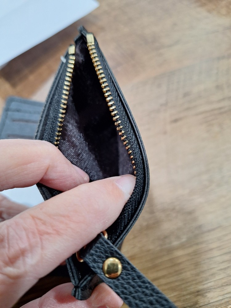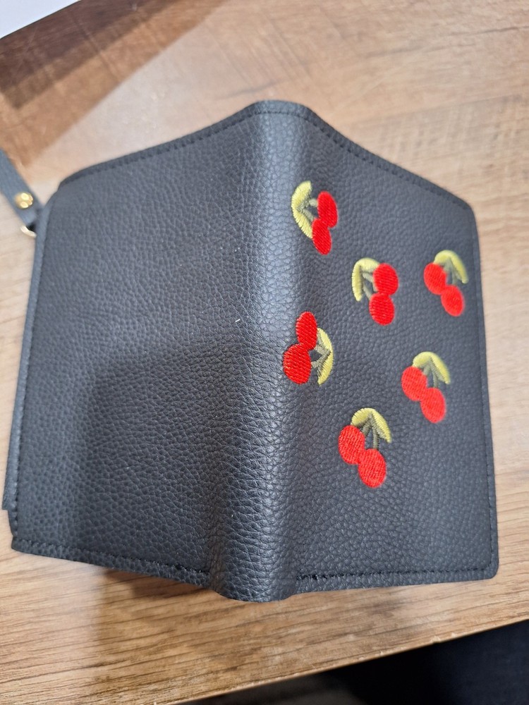 This wallet is a stylish accessory for women, featuring a black color with an embroidered cherry design. Made of faux leather with a canvas fabric type, it offers a zip-around style with credit card slots for convenient organization. The compact size of 5 x 3.5 x 1 makes it easy to carry around, adding a touch of elegance to any outfit. Perfect for everyday use, this wallet is both practical and fashionable for the modern woman.