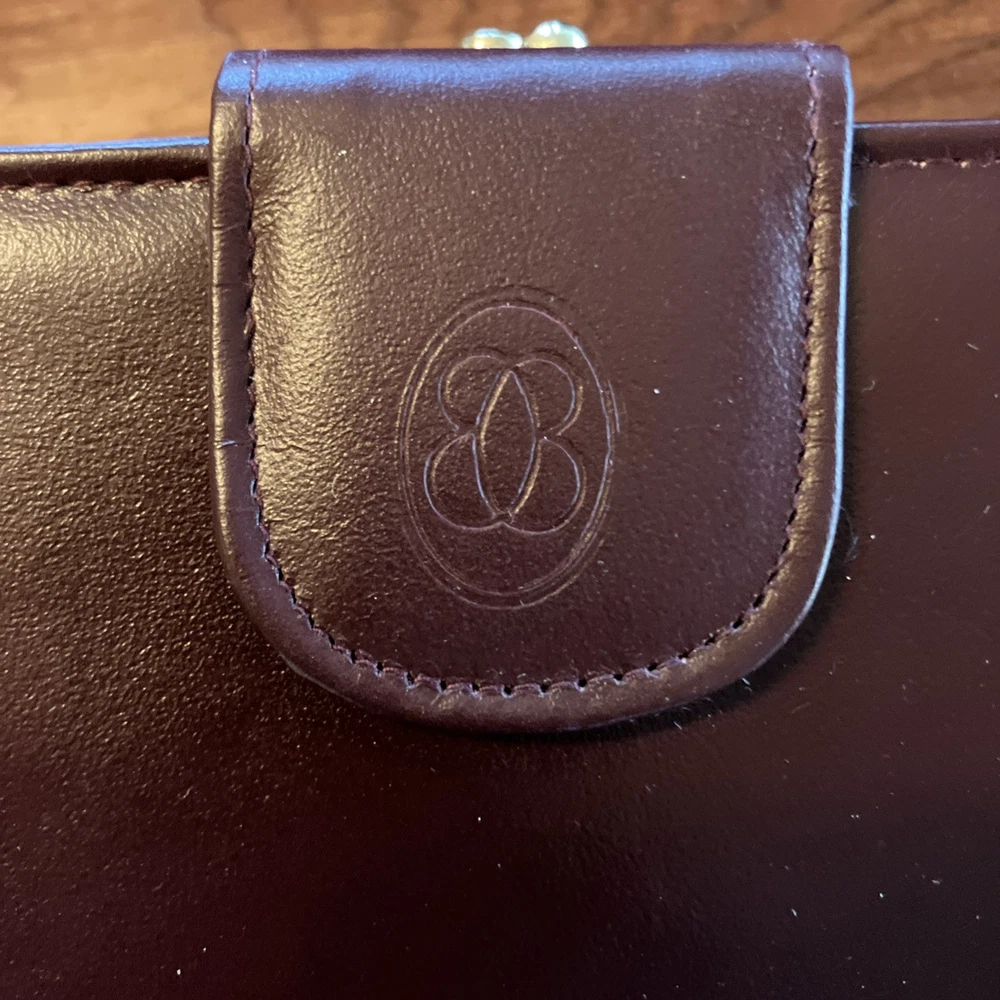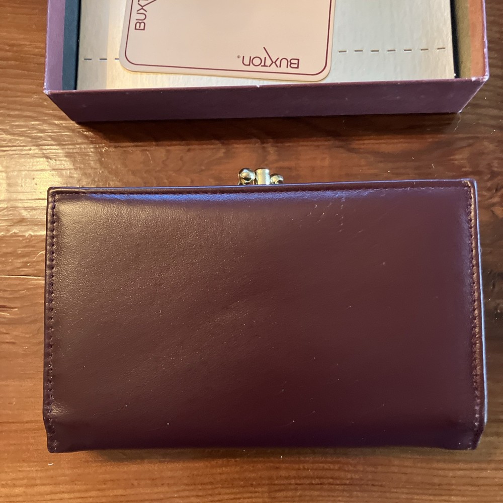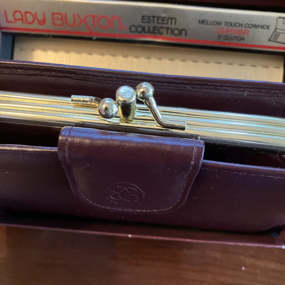 The Lady Buxton Wallet from the Esteem Collection is a luxurious leather clutch in a mellow touch cowhide maroon color. This vintage-inspired wallet features a solid pattern with a unique triple frame design, making it a stylish accessory for women. Made with high-quality leather, this one-size wallet from the United States is a fashionable and functional choice for everyday use.