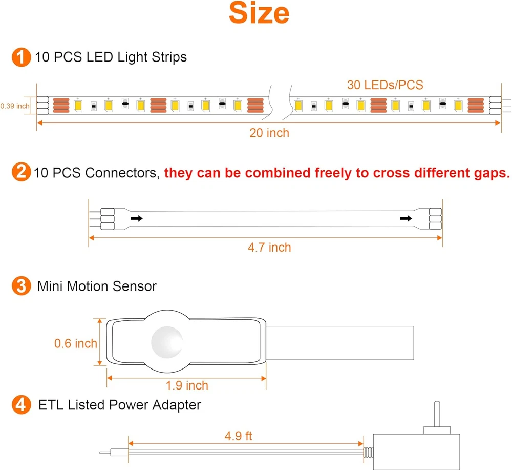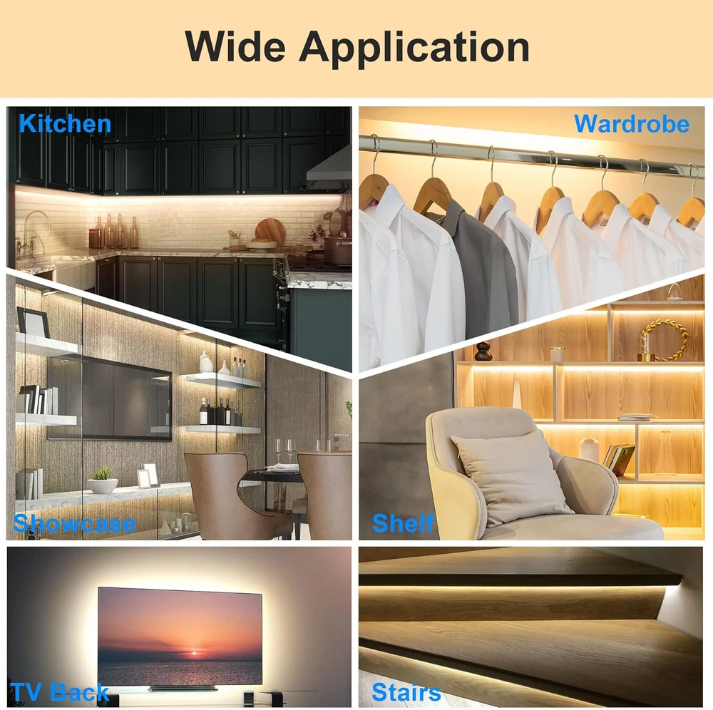 Store New Arrivals Add to Favorite View Feedback Contact LAFULIT 10 PCS under Cabinet Lights Kit, Motion Sensor LED Strip Lights with Remote, Dimmable and Timer Warm White Counter Lights for Kitchen Cabinets, Cupboards, Closets, Stairs, Shelf, Desk, and Bed Description Light Source Type LED Style Modern Number of Items 10 Power Source Corded Electric Number of Light Sources 10 Control Method Remote Switch Style Remote Light Direction Adjustable Theme Indoor Batteries Included? No Controller Type Remote Control Batteries Required? No Bulb Shape Size FC10 Brand LAFULIT Package Dimensions 5.87 x 5.75 x 1.69 inches Included Components Remote Indoor/Outdoor Usage Indoor Light Color Warm White Water Resistance Level Not Water Resistant Item Weight 6.7 ounces Connectivity Technology Infrared Special Features Motion Sensor Special Feature Motion Sensor Switch Installation Type Under Cabinet,Surface Shade Color White Color Temperature 2700 Kelvin Certification etl Color Warm White Wattage 1 watts Voltage 12 Volts Plug Format A- US style Manufacturer LAFULIT Size 16.4FT 【Motion Sensor & Always on Modes 】With our functional remote, make it posssible to meet your multiple lighting needs. Motion sensor mode for brief night lighting, and always on modes for continuous lighting. 【Super Bright & Dimmable】With 300 high quality LEDs and 10 levels of brightness allow you to dim or brighten your under cabinet lighting kit to the desired level. 2700k and Ra > 80 soft warm white cabinet lights reducing the eyestrain, illuminate with improved color quality. 【Linkable & Detachable 】10 pcs 20inches pre-cut light strips, total 16.4ft, if it's too long for you, you can choose to use fewer light strips, and 9 pcs 4.7inches connectors available, connectors can be combined freely to cross different gaps. 【Easy to Install & Safe to Use】Backed with strong adhesive tape, simply stick the strip light to a dry, clean surface for use. Works with a 12V ETL listed power adapter, the LED strips emits low heat and is incredibly safe and touchable for users. 【Widely Used & Premium Support】Suitable for light up your kitchen, cabinet, cupboard, closet, counter, shelf, desk, TV back, showcase, stair, bed, display etc. Any question please tell us, we will answer your question within 24 hours. Product Description Newest Version Plug In Under Cabinet Lights, Say Goodbye to Frequent Battery Changes/Charging ! 10PCS 20 Inches Plug In Motion Sensor Strip Lights, Suitable for Light Up Stairs, Bed, Cabinet, Cupboard, Bookshelf, Pantry, etc. Mini Motion Sensor Controller Flexible DIY Connection Safe to Touch ABOUT US We offer the best prices around on high quality products. Our E-store includes media such as books, movies, music and games while offering electronics, toys, sporting apparel, clothing, tools, general home, garden items and more. SHIPPING We are always working hard to ensure your package arrives as soon as possible. Please understand that some factors like weather, high postal traffic, and the performance of shipping companies are outside of our control. We offer free shipping to the lower 48 states and ship within 2 business days of payment, usually sooner. We do not accept P.O. Boxes. Please provide a physical address. RETURNS We offer a 30-Day Return Policy on items which you are not completely satisfied with. You have the option for a full-refund or an exchange of the item. No returns are available on items shipped outside of the USA. PAYMENT We accept PayPal. CONTACT US This page content is yet to come Please ad us to your favorite seller and visit again later Thank You CUSTOMER SATISFACTION We try our very best to make sure every customer is completely satisfied. If there's a problem, message us! We're happy to help.