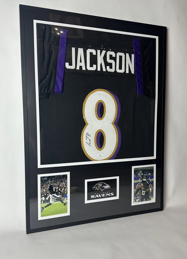 Own a piece of Baltimore Ravens history with this autographed custom jersey signed by Lamar Jackson. This authentic jersey comes framed and ready to display, with a JSA Certificate of Authenticity to ensure its validity. The signature is located on the front of the jersey, making it a must-have for any true football fan. This original piece is perfect for collectors or fans looking to add a unique touch to their sports memorabilia collection. Represent your team with pride and show off your love for Lamar Jackson with this signed jersey. The frame is 32”x24” in size.
