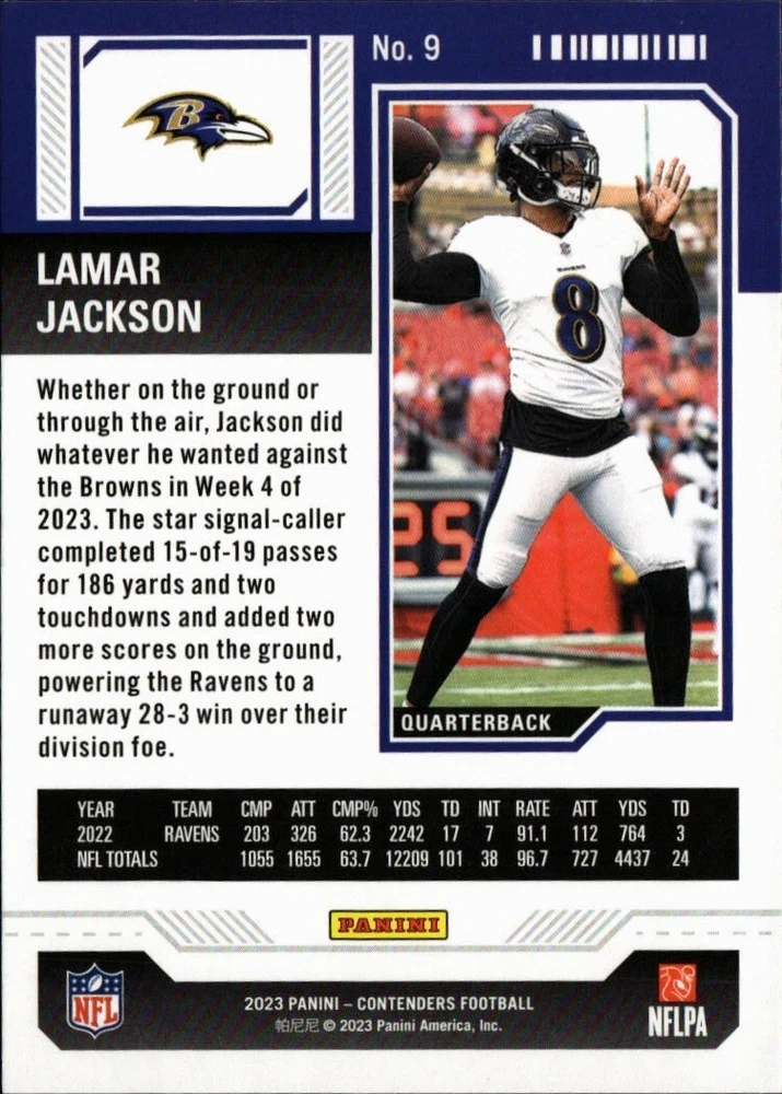 Player/Athlete: Lamar Jackson Parallel/Variety: Red League: National Football League (NFL) Manufacturer: Panini Type: Sports Trading Card Features: Parallel/Variety Year Manufactured: 2023 Team: Baltimore Ravens Season: 2023 Sport: Football Autograph Authentication Number: 202 PANINI CONTENDERS FOOTBALL SEASON TICKET Card Number: 9 Set: 2023 Panini Contenders