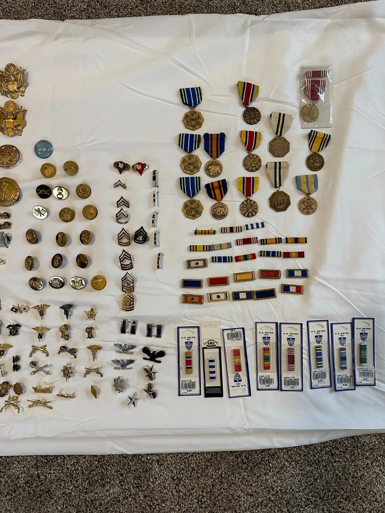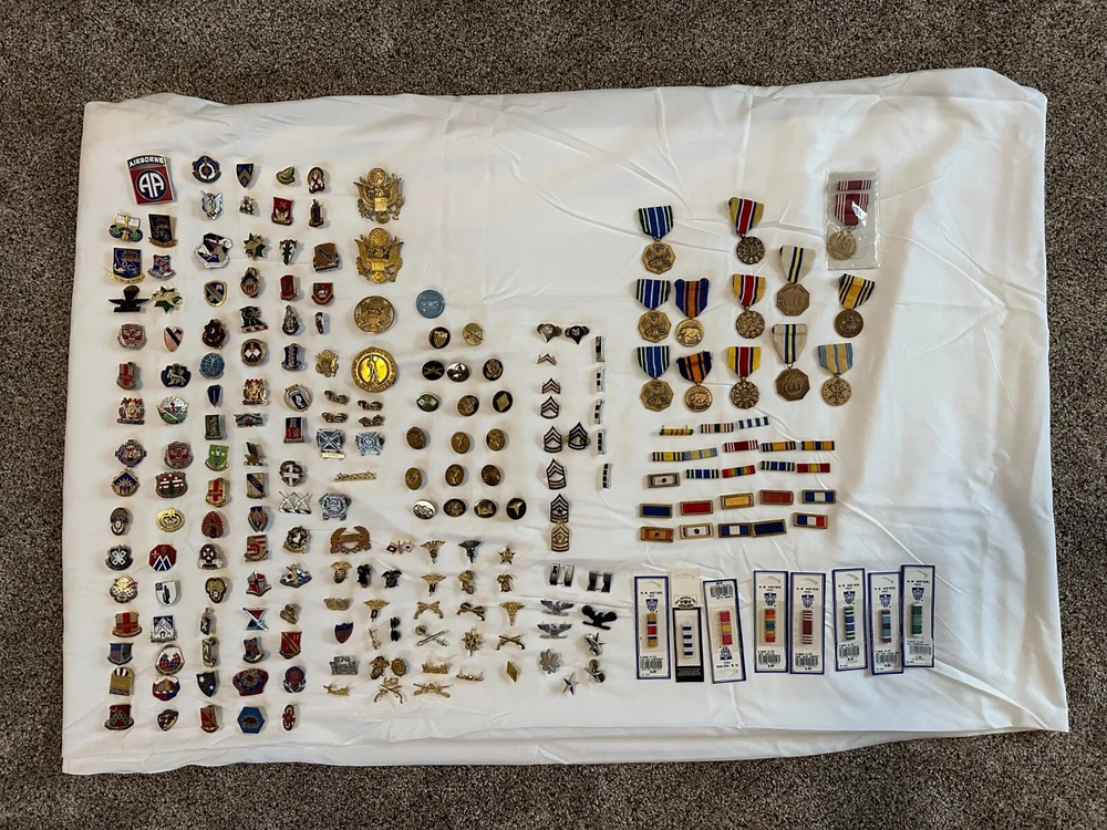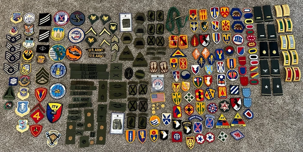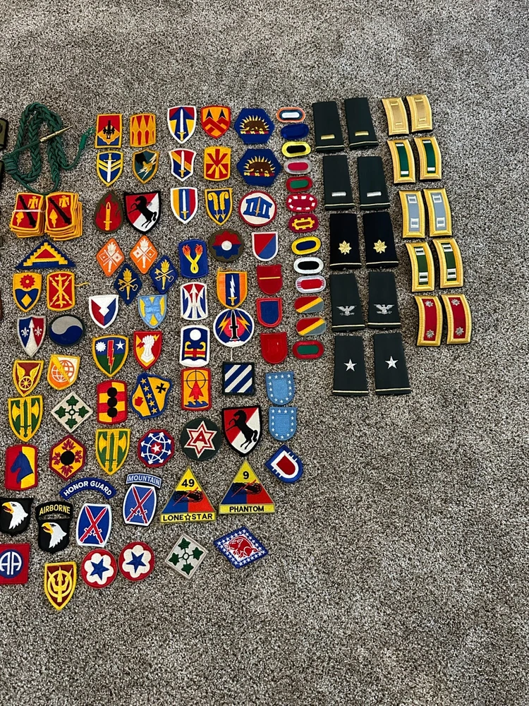 I have collected patches and insigniafor over 40 years, and I am restructuring my collection, and this representsitems that are duplicates or that I no longer collect. There are over 400 itemsincluded and there are few duplicates. Much of this has been in a footlockerfor the last 20-30 years. Most people in my family, including myself, served inthe Army and a some of these came directly from our uniforms over the years (allthe officer rank dress epaulets were worn by myself, my brotheror father) - I just have so many duplicates. Perfect for collectorof militaria or dealers. Included in the lot are shoulder sleeve insignia (SSI),distinctive unit insignia (DUI), Class A uniform office rank epaulets, dressblue uniform office rank epaulets, enlisted & officer branch insignia, hatand collar insignia, etc. Don't miss this opportunity to get so much history in oneplace.