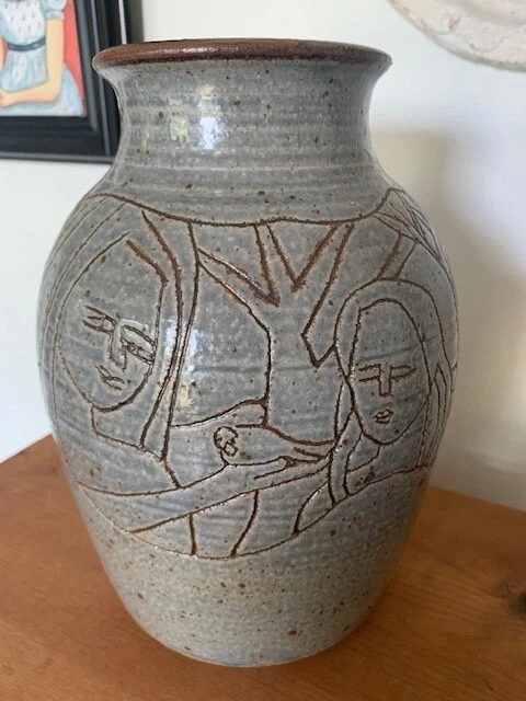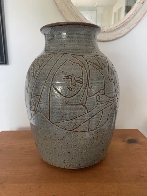 Sankaat is pleased to present for your consideration this large hand made sgraffito art pottery vase by North Carolina artist Kathy Whitley! Beautifully potted and decorated with a carved decoration on the natural toned gray glaze- the scenic pattern depicts two women holding a bird amidst trees. A beautiful Arts and Crafts example styling- reminiscent of Newcomb, Rookwood, and Van Briggle, this piece is sure to become an heirloom for the future. measures approx 9.75 inches tall and free of damage.