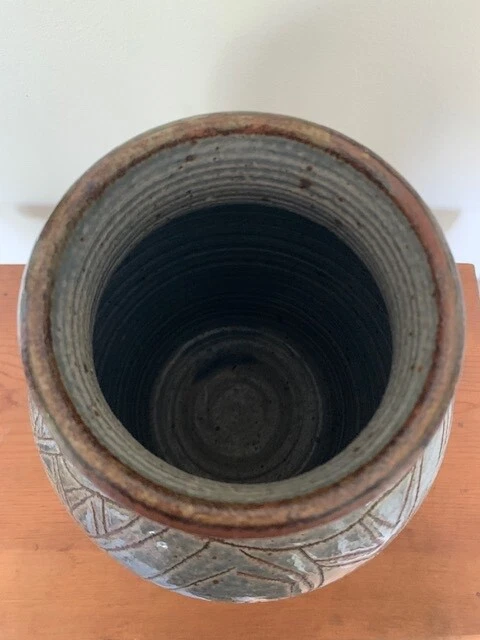 Brand: Kathy Whitley Features: Carvings Origin: North Carolina Theme: Birds Subject: Women Production Technique: Studio Crafted Color: Gray Material: Stoneware Type: Vase Production Style: Art Pottery