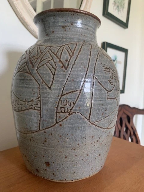 LARGE North Carolina Art Pottery Scenic Stoneware Vase! "Kathy Whitley" ! NR