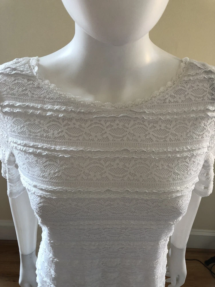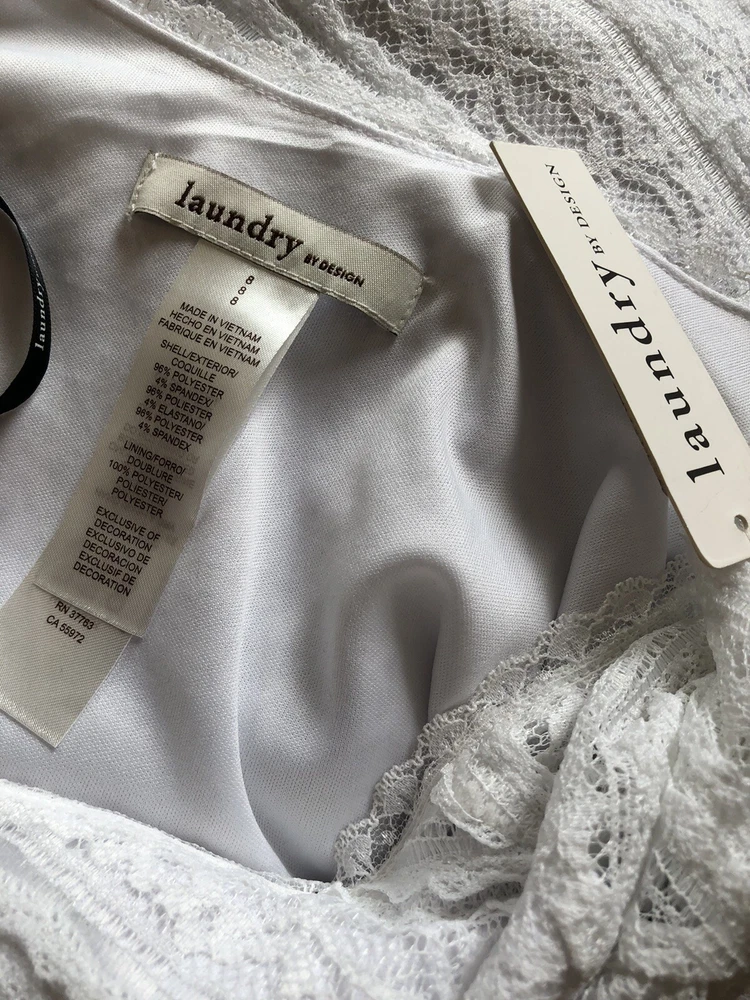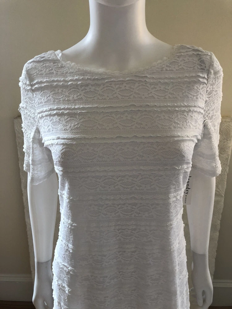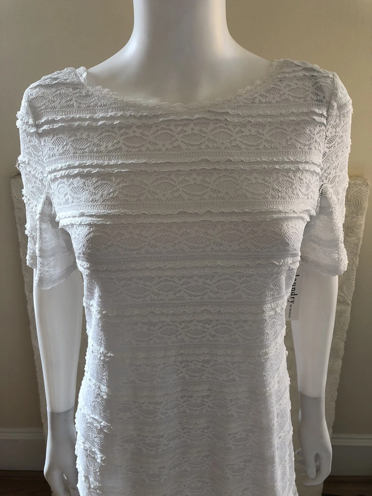 NWT Laundry by Design White Lace Pencil Dress 8 item details: shaped fit, scoop back, elbow sleeves, lined, stretch size: Women 8 shoulder: 14 chest\underarm to underarm, doubled): 36 sleeve\seam to sleeve edge: 12 waist\seam to seam across waist, doubled: 34 hip: 39 length/collar seam to hem bottom:35 condition: NWT Condition; No Flaws to Note condition rating: 1 Condition Rankings: NWT = Brand New, tags still attached, never used. Mint Condition = Item may have been used, but shows no signs of wear. Excellent Condition: Used, but with minimal signs of wear. Very Good Condition: Used and shows moderate signs of wear, may need repairs, and is sold As Is. Fair Condition: Item is showing significant signs of wear, may need repairs, and is sold As Is. PLEASE NOTE: Most of our items are pre-owned or vintage. Items will not be in new condition, unless otherwise noted. We carefully inspect each item for flaws prior to listing and will note flaws as needed. Condition Ratings: 1 = New/Unused Condition; 2 = Pre-Loved/No Flaws to Note; 3 = Pre-Loved/Mild Signs of Wear; 4 = Pre-Loved/Needs Repairs or Shows Significant Wear/Flaws *Measurements Taken in Inches