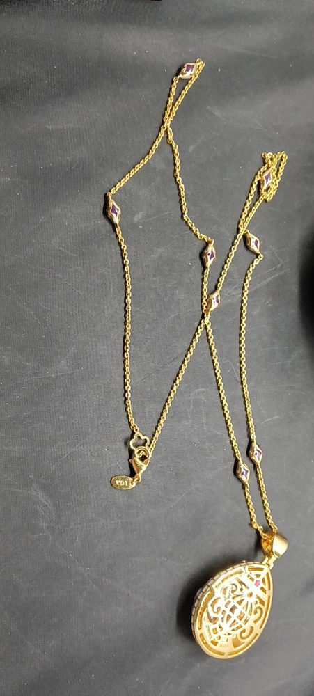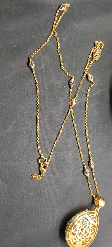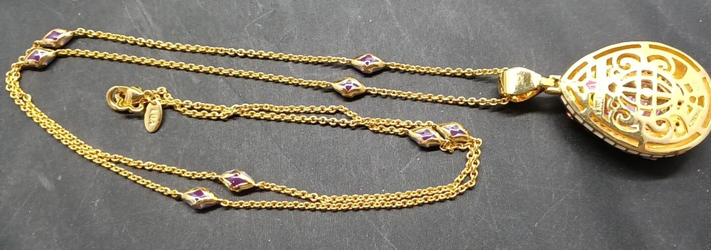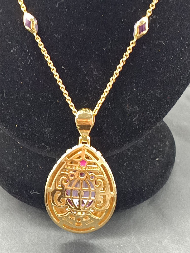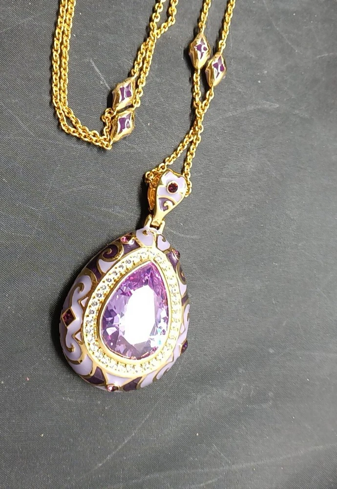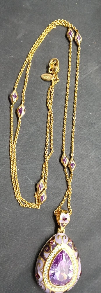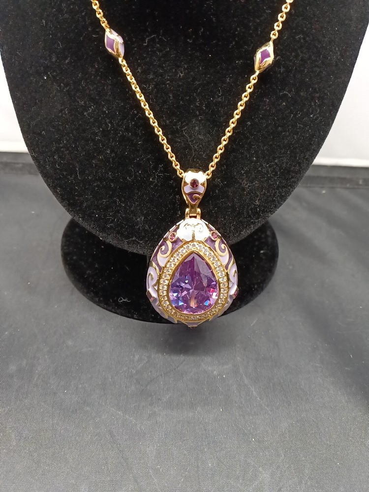 Add a touch of elegance to your outfit with this stunning Lauren G Adams oval pendant. Made with gold-tone, enamel, and 11.8mm crystal, this amulet pendant is perfect for anyone who loves vintage pieces. The pendant features a pear-shaped crystal in white/colorless and is designed in the US but made in China. The pendant is ideal for those who love beauty and want to add a unique touch to their jewelry collection. It comes from a trusted brand and is sure to become a beloved piece in your jewelry box. Part of the Elegant Drops collection, this pendant necklace is crafted of a solid brass base and plated with 18k gold. It features finely hand painted Purple enamel and cubic zirconia accents for a classic look.