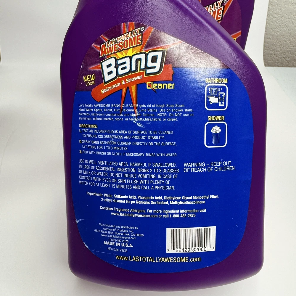 Keep your bathroom and shower clean and fresh with LA's Totally Awesome Bang Bathroom & Shower Spray. This all-purpose cleaner comes in a 32 oz bottle and is designed to effectively remove dirt and grime. The spray features a fresh scent and is alcohol-free, making it safe for use around children and pets. This 2-pack set includes two 32 oz bottles of cleaning substance that are EPA Safer Choice certified. The spray is easy to use and is perfect for use on all types of bathroom surfaces. Keep your bathroom and shower clean and fresh with LA's Totally Awesome Bang Bathroom & Shower Spray.