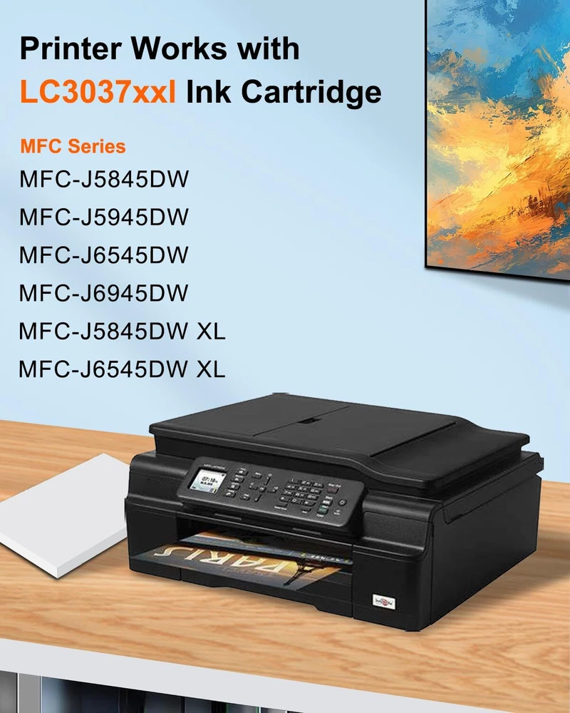 Latest Chip: The LC3037 XXL BK/C/M/Y Ink Cartridges features the latest smart chip to ensure compatibility with your printer Package Contents: LC3037 XXL Ink, includes 1 Black LC3037BK Cartridge, 1 Cyan LC3037C Cartridge, 1 Yellow LC3037Y Cartridge, 1 Magenta LC3037M Cartridge Compatible Printers: The LC3037 XXL Ink Cartridges for compatible Brother MFC-J5845DW, MFC-J5845DW XL, MFC-J5945DW, MFC-J6545DW, MFC-J6545DW XL and MFC-J6945DW printers High Yield: LC3037XXL black ink cartridge prints 3000 pages per cartridge, LC3037XXL C/M/Y ink cartridges prints 1500 pages per cartridge High Yield Cartridges (Letter/A4, 5% coverage) Delivers Superopr Inkjet Print quality: LC3037 XXL Ink Cartridges for provides sharper images and high quality output, long time non fading, fast printing speed and high page yield. The ink flows smoothly and consistently, ensuring hassle-free printing without any smudges or streaks