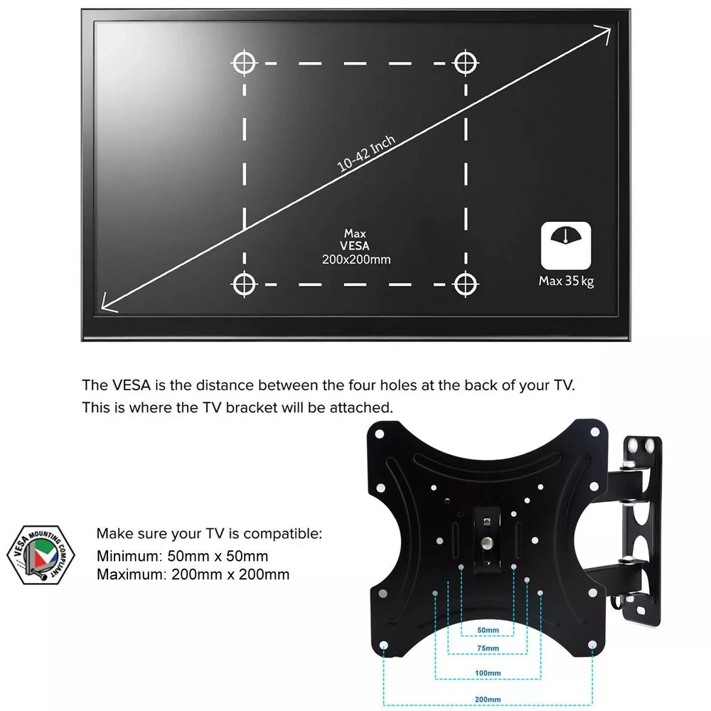 FITS MOST SCREEN SIZES 17" - 42" Screen size support used as a general guideline only. Actual fit is determined by the VESA measurements and weight capacity of this mount. VESA measurements are your mounting hole distance on the back of your TV Supports TVs up to 55lbs VESA mounting pattern max: 200 mm x 200 mm (7.8 x 7.8 inches max) TV tiles 20 degrees Swivels freely from side to side VESA mounting compliant Min/Max TV to wall distance: 2.2"/16.3 " Color: Black Single stud mountable. Cable Management