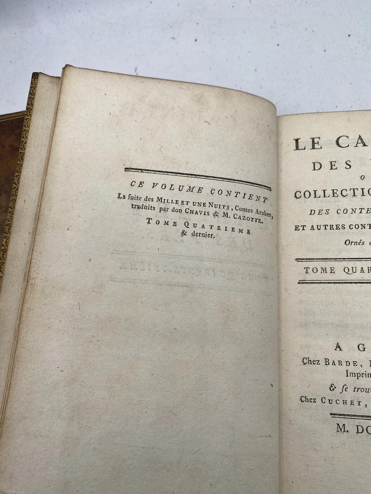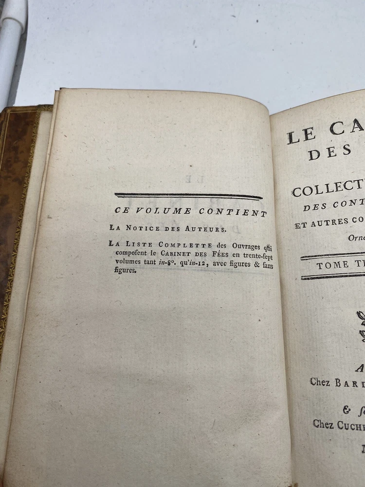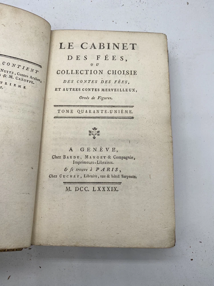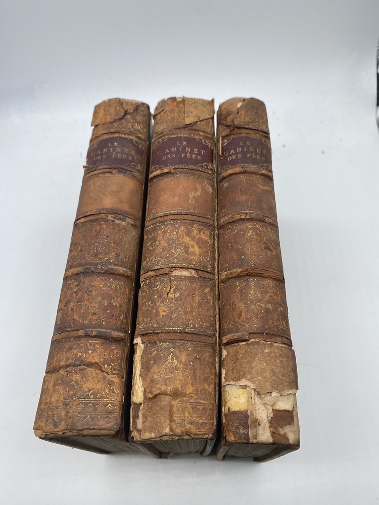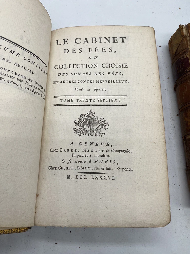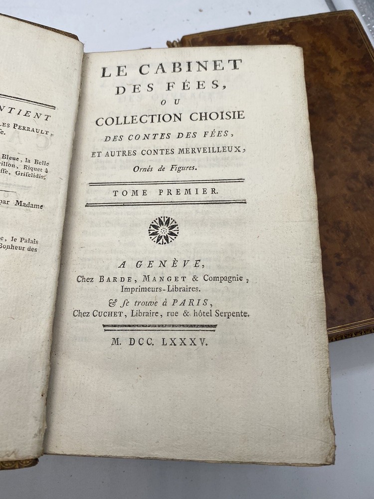 CABINET DES FÉES (Le), ou recueil choisi des contes de fées et autres récits merveilleux. Amsterdam [puis] Genève ; Paris, rue et hôtel Serpente, 1785-1789. 41 volumes in-8, veau porphyre d’époque, encadrements de triple filet doré sur les plats, dos à nerfs richement ornés, pièces de titre et de tomaison en partie manquantes, têtes dorées (reliure uniforme du temps). Édition originale de cette vaste compilation de contes, réunie par Charles-Joseph de Mayer et Charles-Georges Garnier. L’illustration se compose de 120 planches hors texte gravées d’après Marillier, en premier tirage. Les 36 premiers volumes rassemblent un ensemble considérable de contes de Perrault, Fénelon, Mme d’Aulnoy, Hamilton, Caylus, Rousseau, ainsi que Les Mille et une nuits dans la traduction de Galland. Les 4 derniers tomes contiennent une Suite des Mille et une nuits traduite par Dom Chavis et Cazotte. Le tome 37 propose une étude sur l’origine du conte merveilleux, accompagnée de notices biographiques et d’un catalogue des œuvres. Exemplaire bien complet, conservé dans ses reliures homogènes d’époque. Présence d’ex-libris masqués. Dos très altérés, coins émoussés, coiffes usées ou manquantes ; intérieur et planches en bon état de conservation. Réf. Cohen, 198. N'oubliez pas de m'ajouter à votre liste de favoris! .