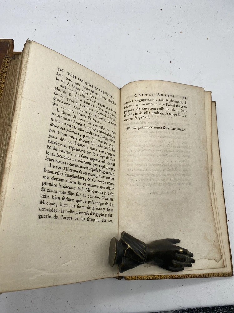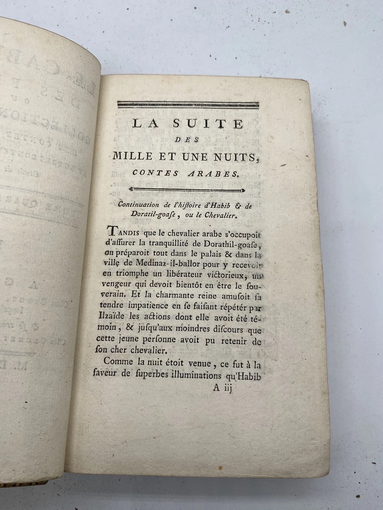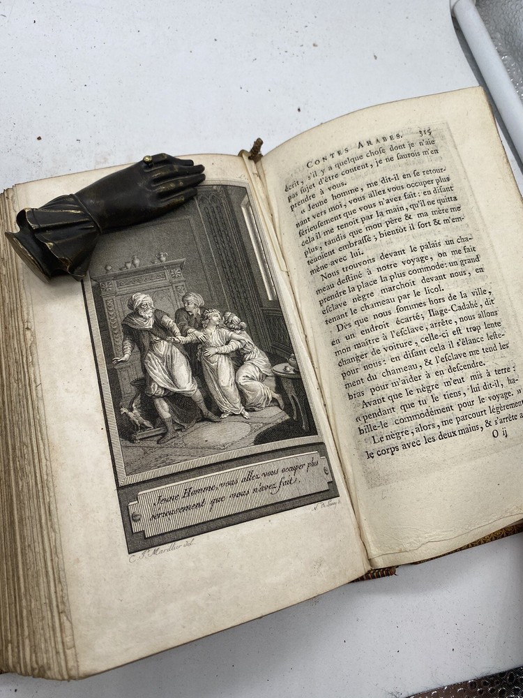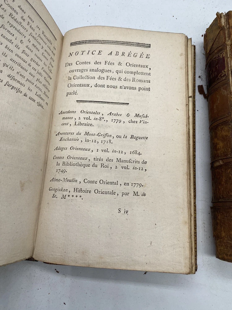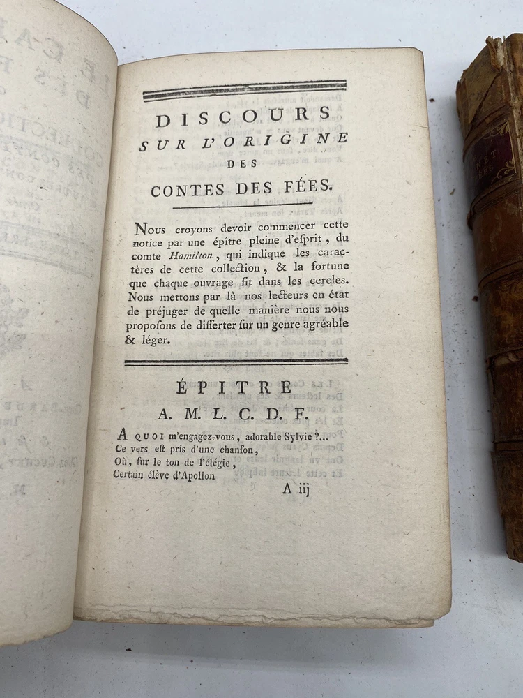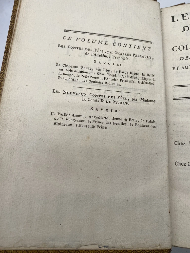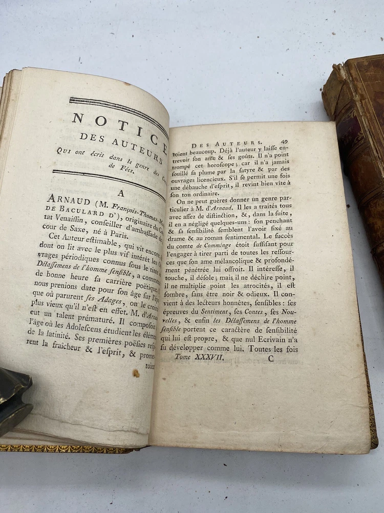 CABINET DES FÉES (Le), ou recueil choisi des contes de fées et autres récits merveilleux. Amsterdam [puis] Genève ; Paris, rue et hôtel Serpente, 1785-1789. 41 volumes in-8, veau porphyre d’époque, encadrements de triple filet doré sur les plats, dos à nerfs richement ornés, pièces de titre et de tomaison en partie manquantes, têtes dorées (reliure uniforme du temps). Édition originale de cette vaste compilation de contes, réunie par Charles-Joseph de Mayer et Charles-Georges Garnier. L’illustration se compose de 120 planches hors texte gravées d’après Marillier, en premier tirage. Les 36 premiers volumes rassemblent un ensemble considérable de contes de Perrault, Fénelon, Mme d’Aulnoy, Hamilton, Caylus, Rousseau, ainsi que Les Mille et une nuits dans la traduction de Galland. Les 4 derniers tomes contiennent une Suite des Mille et une nuits traduite par Dom Chavis et Cazotte. Le tome 37 propose une étude sur l’origine du conte merveilleux, accompagnée de notices biographiques et d’un catalogue des œuvres. Exemplaire bien complet, conservé dans ses reliures homogènes d’époque. Présence d’ex-libris masqués. Dos très altérés, coins émoussés, coiffes usées ou manquantes ; intérieur et planches en bon état de conservation. Réf. Cohen, 198. N'oubliez pas de m'ajouter à votre liste de favoris! .