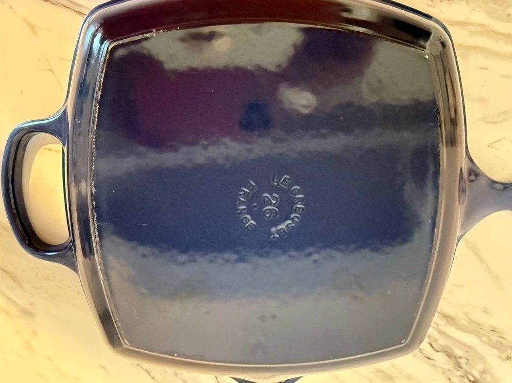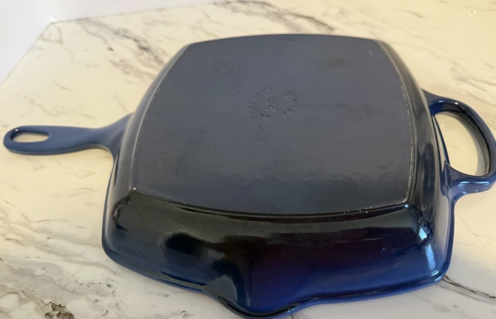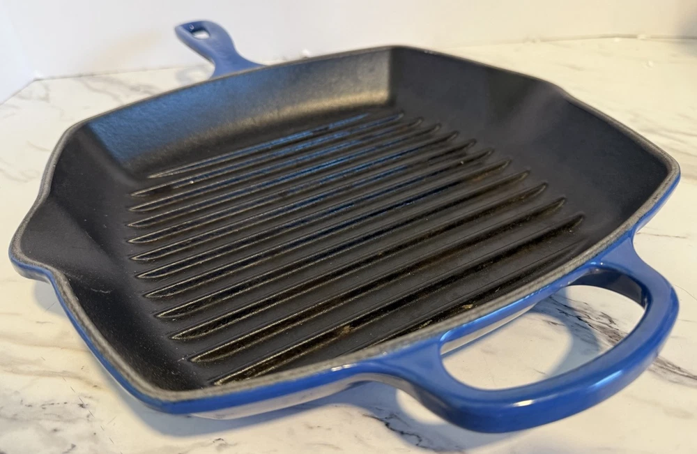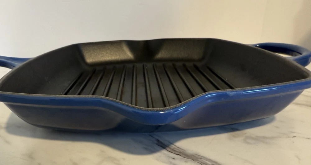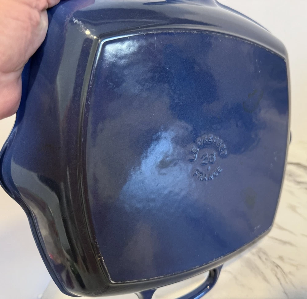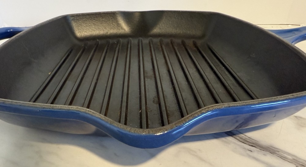 Le Creuset #26 Square GRILL Pan/Skillet Cast Iron 10.5" Double Spout- Blue Pre-Owned in very good condition. Lightly used. Some very minor scuffs on bottom around the edge. See all photos for best representation. Thank you for looking and supporting my small business!