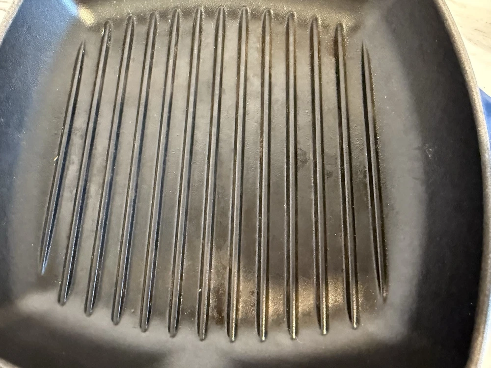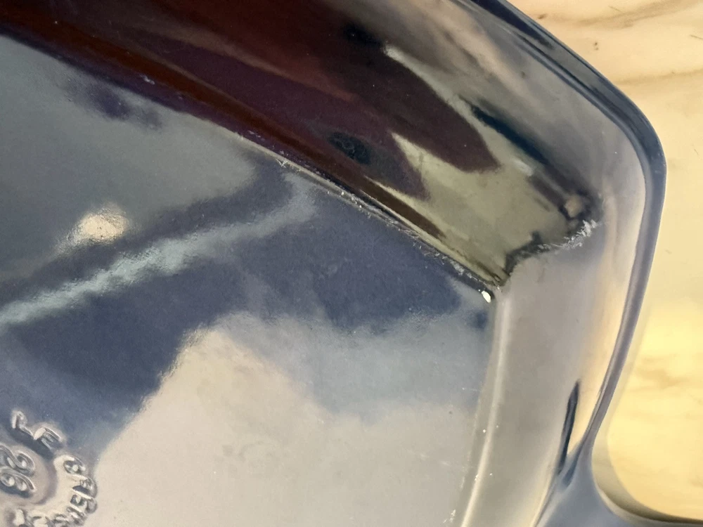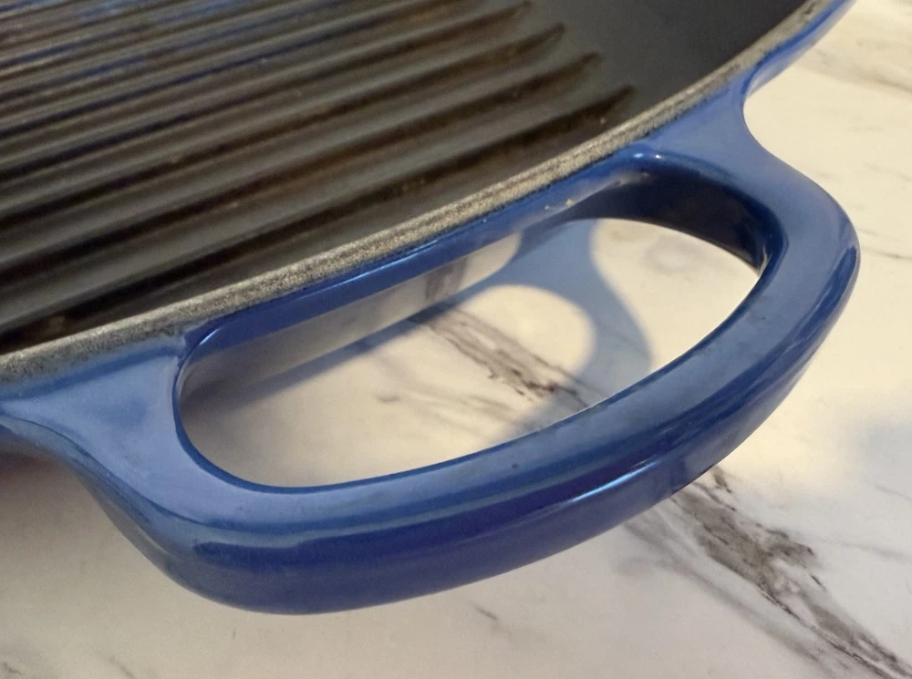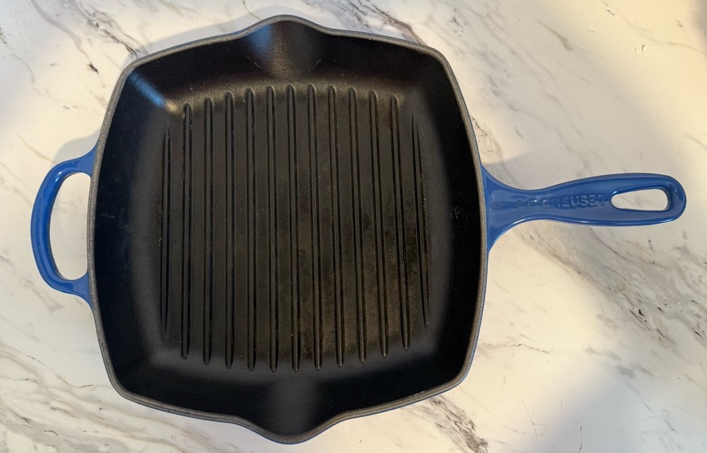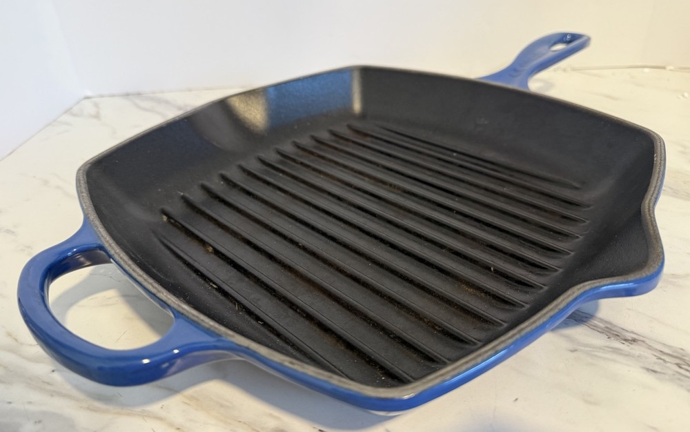 Le Creuset #26 Square GRILL Pan/Skillet Cast Iron 10.5" Double Spout- Blue Pre-Owned in very good condition. Lightly used. Some very minor scuffs on bottom around the edge. See all photos for best representation. Thank you for looking and supporting my small business!