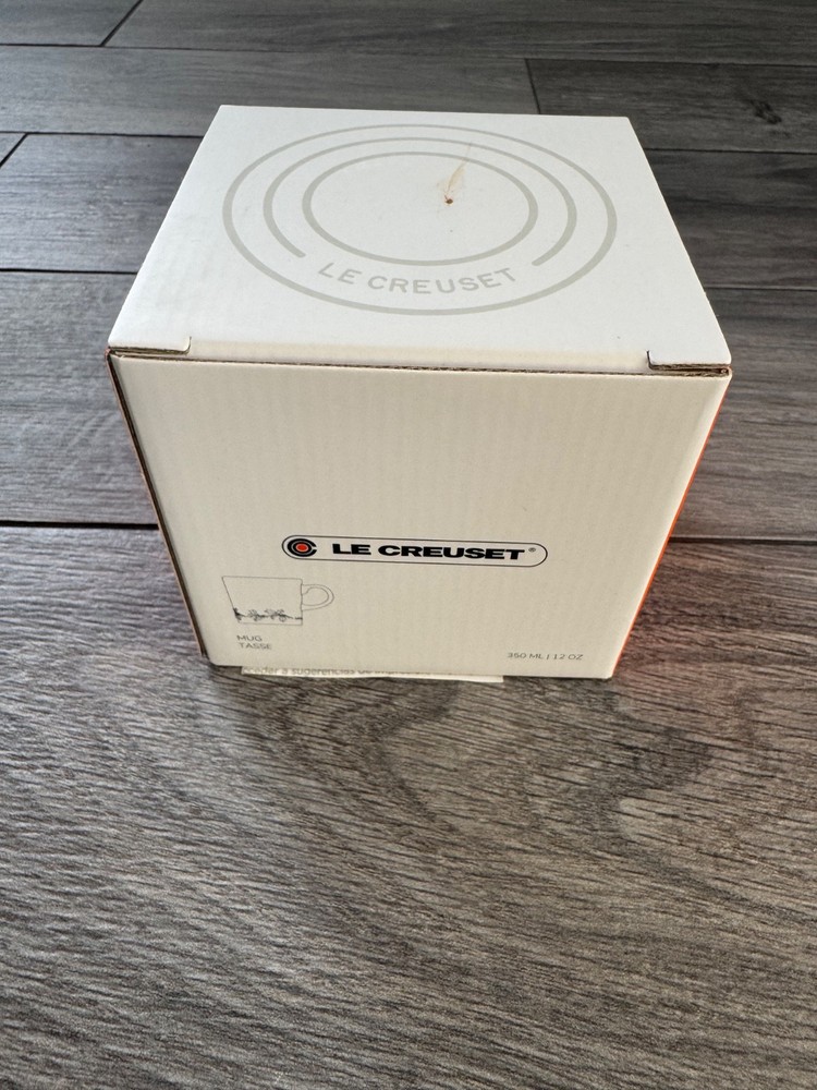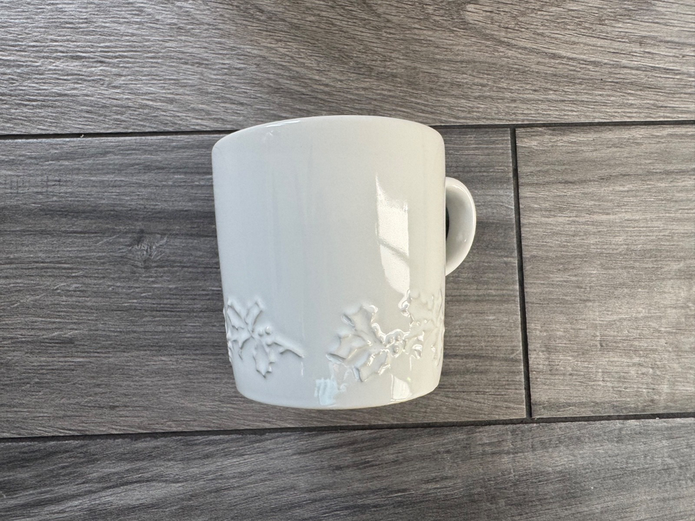 LE CREUSET HOLLY COLLECTION LONDON COFFEE MUG, WHITE, NIB, 12 OZ. This Le Creuset Holly Collection London Coffee Mug, in the color White, is brand new in box. The product description is: Le Creuset Holly Collection London Mug features embossed holly leaves and berries. With a generous 12-ounce capacity, use this mug for hot drinks or single servings of soup and dessert. The dense stoneware blocks moisture absorption and is safe for the microwave and dishwasher. The glazed surface cleans up easily, and resists chips, scratches, and stains.