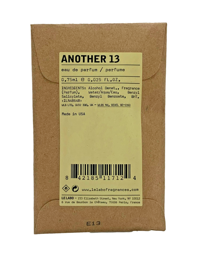 LE LABO ANOTHER 13 Eau De Parfum Sample Spray .75ml/0.025oz Composed of ambroxan, a synthetic animal musk, making AnOther 13 an addictive dirty potion blended with twelve other ingredients such as jasmine, moss and ambrette seeds absolute - which gives it spike and shine. *PLEASE NOTE: Fragrance Sample vials are filled by the manufacturer and are filled BY VOLUME. Due to regulations, products containing alcohol are partially filled by the manufacturer to allow for liquid expansion for any temperature fluctuation during transportation. Though sample vials may not appear full or appear only half-full, the vials contain the indicated net WEIGHT shown on the vial. These samples have NEVER been tested or used.