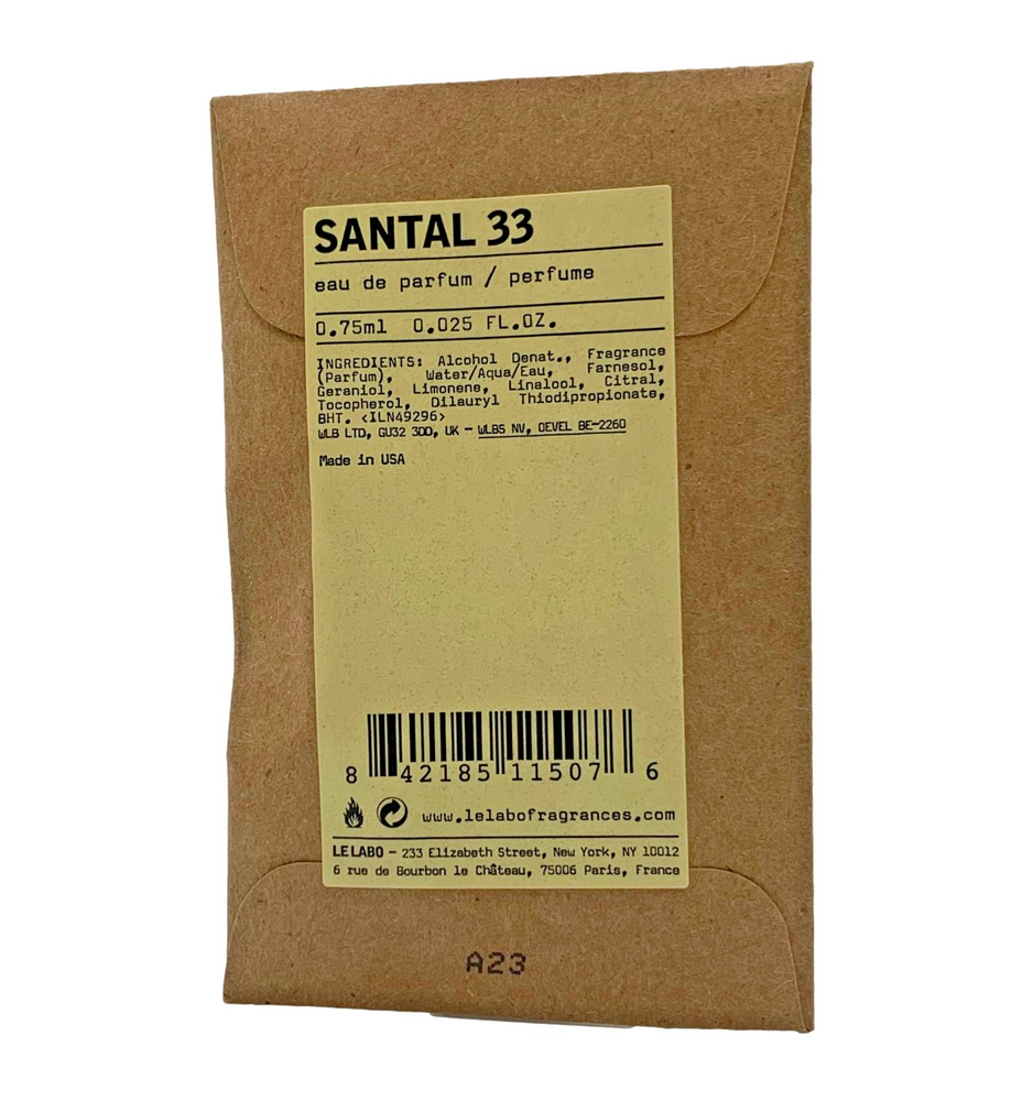 LE LABO Santal 33 Eau De Parfum Sample Travel Spray .75ml/.05oz New in Le Labo Envelope A perfume that would intoxicate a man as much as a woman. Cardamom, iris, violet, ambrox crackle in the formula and bring to this smoking wood alloy (Australian sandalwood, papyrus, cedarwood) some spicy, leathery, musky notes, and gives this perfume its unisex signature and addictive comfort. *PLEASE NOTE: Fragrance Sample vials are filled by the manufacturer and are filled BY VOLUME. Due to regulations, products containing alcohol are partially filled by the manufacturer to allow for liquid expansion for any temperature fluctuation during transportation. Though sample vials may not appear full or appear only half-full, the vials contain the indicated net WEIGHT shown on the vial. These samples have NEVER been tested or used.