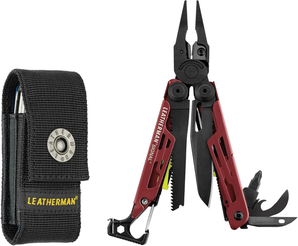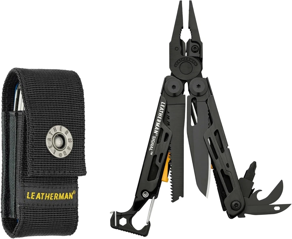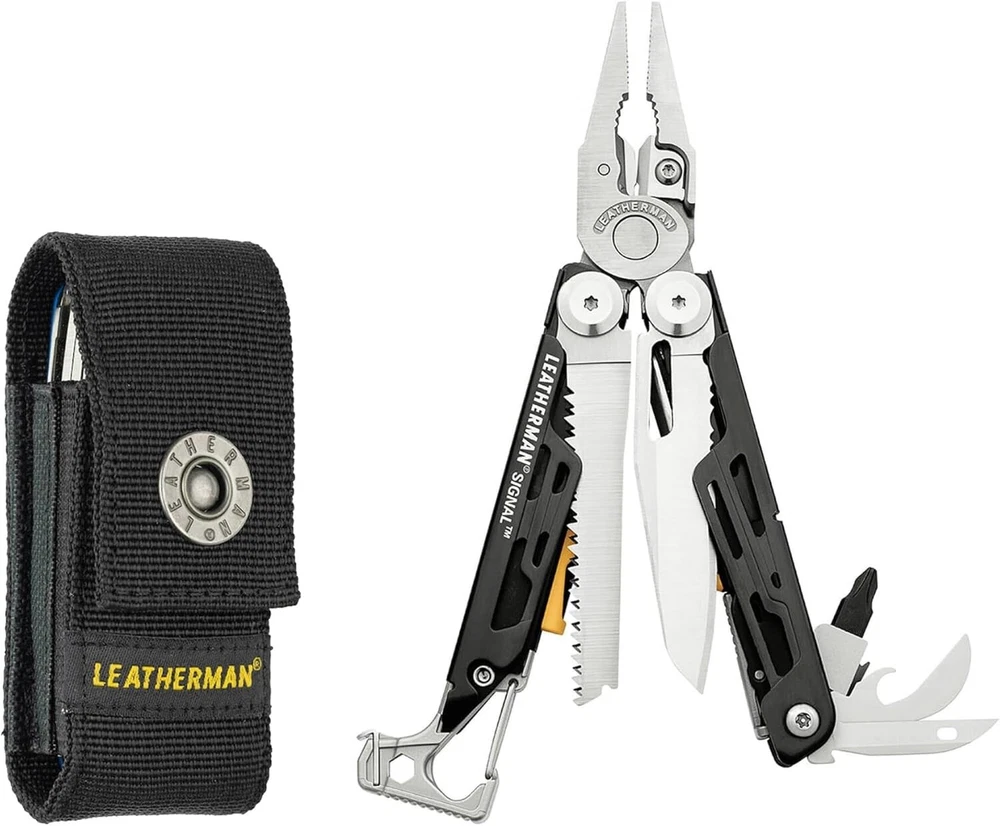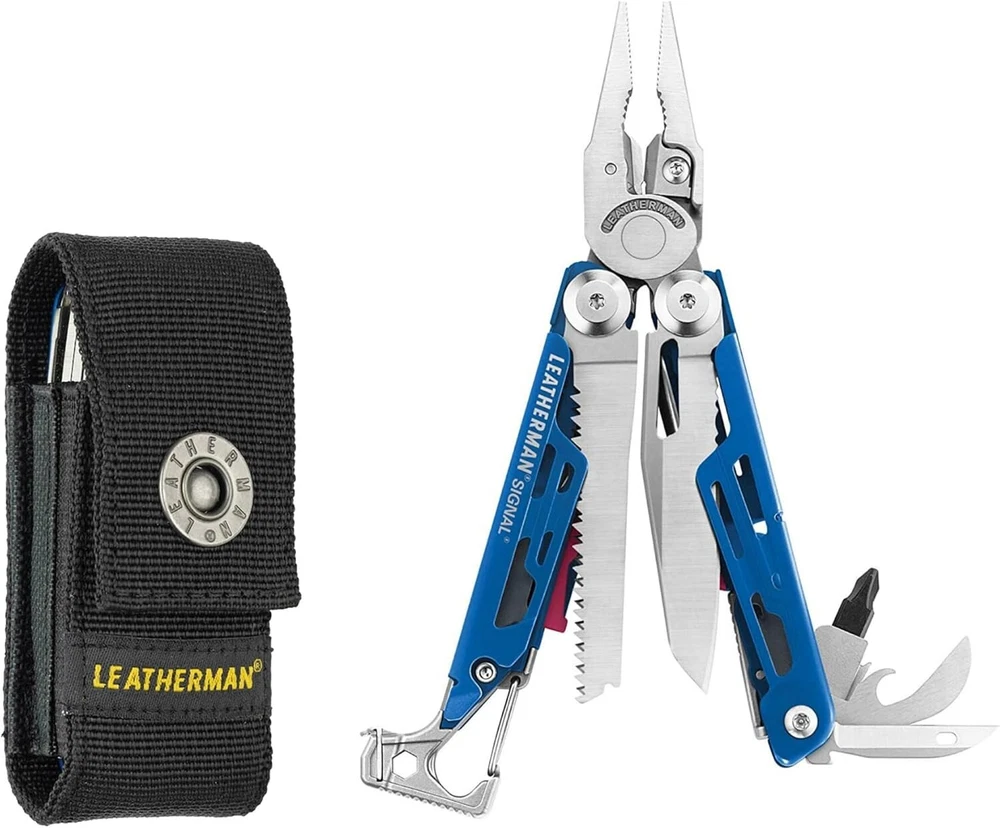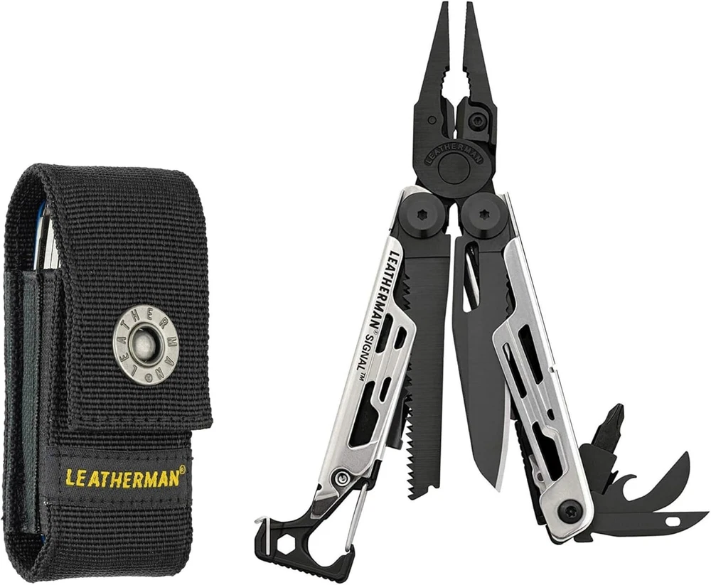 About this item A Leatherman for Everyone: For the last 40 years, Leatherman has been empowering millions to conquer the expected and unexpected, transforming everyday challenges into triumphant moments; Proudly made in the USA Engineered to Withstand: From our Portland, Oregon factory and backed by our 25-year warranty, our multi-tools are built to last a lifetime, embodying the innovation and perseverance of our founder, Tim Leatherman Outdoor Champion: The ultimate outdoor tool, Signal is designed for camping, hiking, fishing and more; A compact and portable EDC, Signal provides convenience and preparedness for the everyday Your Adventure Buddy: Designed to help you thrive in the outdoors; Includes a built-in fire starter; Anchor your tent stakes with the hammer, crimp fish hooks with the pliers or use the safety whistle to signal for help Toolbox Simplified: Combines 19 tools, including pliers, wire cutters, knife, saw, hammer, can opener and more into a compact 4.5-inch size that weighs a mere 7.5 ounces to fit in your pocket or backpack
