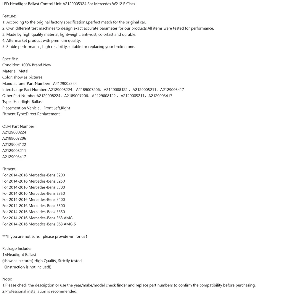 SAFE & SECURE SHOPPING 100% SATISFACTION GUARANTEED FAST SHIPPING Store Categories Store Categories Other eBay Motors Honda Toyota Ford Chevrolet Audi Mercedes-Benz Dodge Jeep You may also like Fuel Filler Hose Neck to Tank W/Clamps For Jeep TJ Wrangler 2003 2004-2006 46.99 USD Free shipping Front Bumper Lower Grill Trim 51117355238 Fit Mini F55 F56 F57 2014-2023 106.69 USD Free shipping Gloss Black Front Grille Grill Fit BMW 2 Series F44 2020-2023 Coupe M Diamond 209.69 USD Free shipping Fuel Injector Repair Seal Kit Fit Chevy Silverado Fit GMC Sierra 1500 2500 3500 46.69 USD Free shipping Door Hinge Pin Bushing Kit For Chevy 1994-2004 S10 GMC S15 93356553 2 Door USA 40.99 USD Free shipping 3PCS Gloss Black Front Grill Grille Fit Mini R55 R56 R57 R58 R59 Cooper S & JCW 195.69 USD Free shipping LED Ballast Control Unit A2129005324 For Mercedes W212 E Class #1 Product Description LED Headlight Ballast Control Unit A2129005324 For Mercedes W212 E Class Feature: 1: According to the original factory specifications,perfect match for the original car. 2: Own different test machines to design exact accurate parameter for our products.All items were tested for performance. 3: Made by high quality material, lightweight, anti-rust, colorfast and durable. 4: Aftermarket product with premium quality. 5: Stable performance, high reliability,suitable for replacing your broken one. Specifics: Condition: 100% Brand New Material: Metal Color: show as pictures Manufacturer Part Number:A2129005324 Interchange Part Number: A2129008224,A2189007206,A2129008122 ,A2129005211,A2129003417 Other Part Number:A2129008224,A2189007206,A2129008122 ,A2129005211,A2129003417 Type: Headlight Ballast Placement on Vehicle:Front,Left,Right Fitment Type:Direct Replacement OEM Part Number: A2129008224 A2189007206 A2129008122 A2129005211 A2129003417 Fitment: For 2014-2016 Mercedes-Benz E200 For 2014-2016 Mercedes-Benz E250 For 2014-2016 Mercedes-Benz E300 For 2014-2016 Mercedes-Benz E350 For 2014-2016 Mercedes-Benz E400 For 2014-2016 Mercedes-Benz E500 For 2014-2016 Mercedes-Benz E550 For 2014-2016 Mercedes-Benz E63 AMG For 2014-2016 Mercedes-Benz E63 AMG S ***If you are not sure,please provide vin for us! Package Include: 1×Headlight Ballast (show as pictures) High Quality, Strictly tested. (Instruction is not inclued!) Note: 1.Please check the description or use the year/make/model check finder and replace part numbers to confirm the compatibility before purchasing. 2.Professional installation is recommended. About Us Shipping Terms Returns Contact Us About Us VIPIH is one of the international leading distributors specialized in distribution of auto spare parts of the world’s prime auto part suppliers on a global scale with the full responsibility in procurement, shipping, sales and marketing and after sales service. VIPIH fulfills all needs of its clients completely and on a timely basis with the know-how it has built up since it was established and the comprehension knowledge of the sectors standards. The perfectionist approach in product quality, high service availability, strict principle of business follow-up, reliability and the good reputation which has gained strength as a result of customer satisfaction are the most striking components of VIPIH ’ s success. VIPIH is presently capable of supplying all demands for auto parts from the gear box to turbo hoses in a wide range. Free delivery with worldwide shipping options available. If can not locate what you need then please get in touch! Shipping Shipping Terms International Buyers – Please Note: 1. Import duties, taxes and charges are not included in the item price or shipping charges. These charges are the buyer’s responsibility. 2. Please check with your country’s customs office to determine what these additional costs will be prior to bidding/buying. 3.Buyers' Information: We strive our best to provide you the most reliable, affordable way of shipping service. But sometimes international delivery is highly depended on the courier company and local customs/duties. If you do not receive your item on time, please sent us ebay message immediately for further assistance. Thank you for your understanding. Terms We stand behind everything that we sell and will do everything possible to assure you are satisfied. When you receive your purchase if you are not 100% satisfied, please sent me ebay message and we will do our best to make you happy. If you still want to return your purchase, simply ship the item(s) back to us and we will refund your original purchase price and the original shipping charge. Buyers are responsible for the postal cost of returning the items. We must be notified of the intent to return your item within 30 days of receiving the item. Items returned must be in the same condition that they were received. How to return 1,Please ask us for return address . 2,Shipping back the package . The RMA#(Return Merchant Authorization Number = Your ebay ID) must be clearly written on the return package ,Otherwise the package will be refused. 3,Sent us the return tracking number. 4,All returns will be inspected prior to a credit being issued. Returns 1:Returns are accepted within 60 days of purchase. 2:All returned items MUST BE in the original packaging. 3:We will be happy to assist you if if any item needs to be returned or replaced 4:Please don't open a return request before contacting us first to solve, many thanks. Contact Us If you have any questions, our Customer Service staffs welcome you to sent me ebay message. We strive to answer all questions and resolve any problems as quickly as possible. Business Hours: Monday-Saturday 9:00-17:00 Copyright © 2022 Tongtool