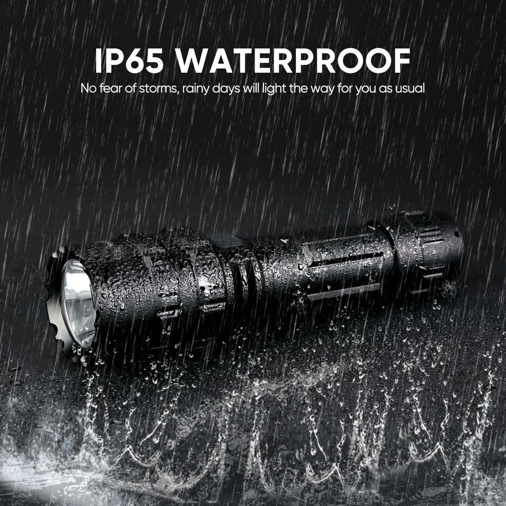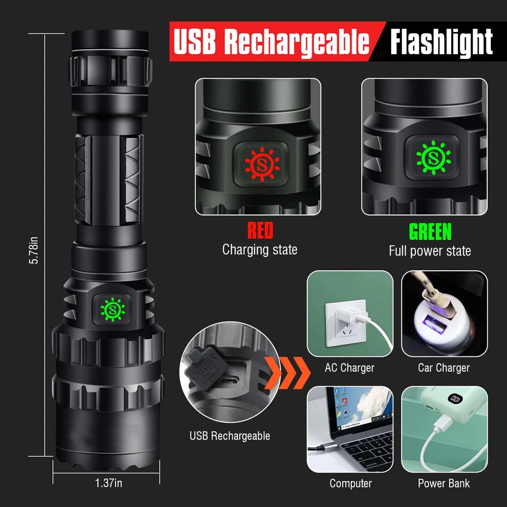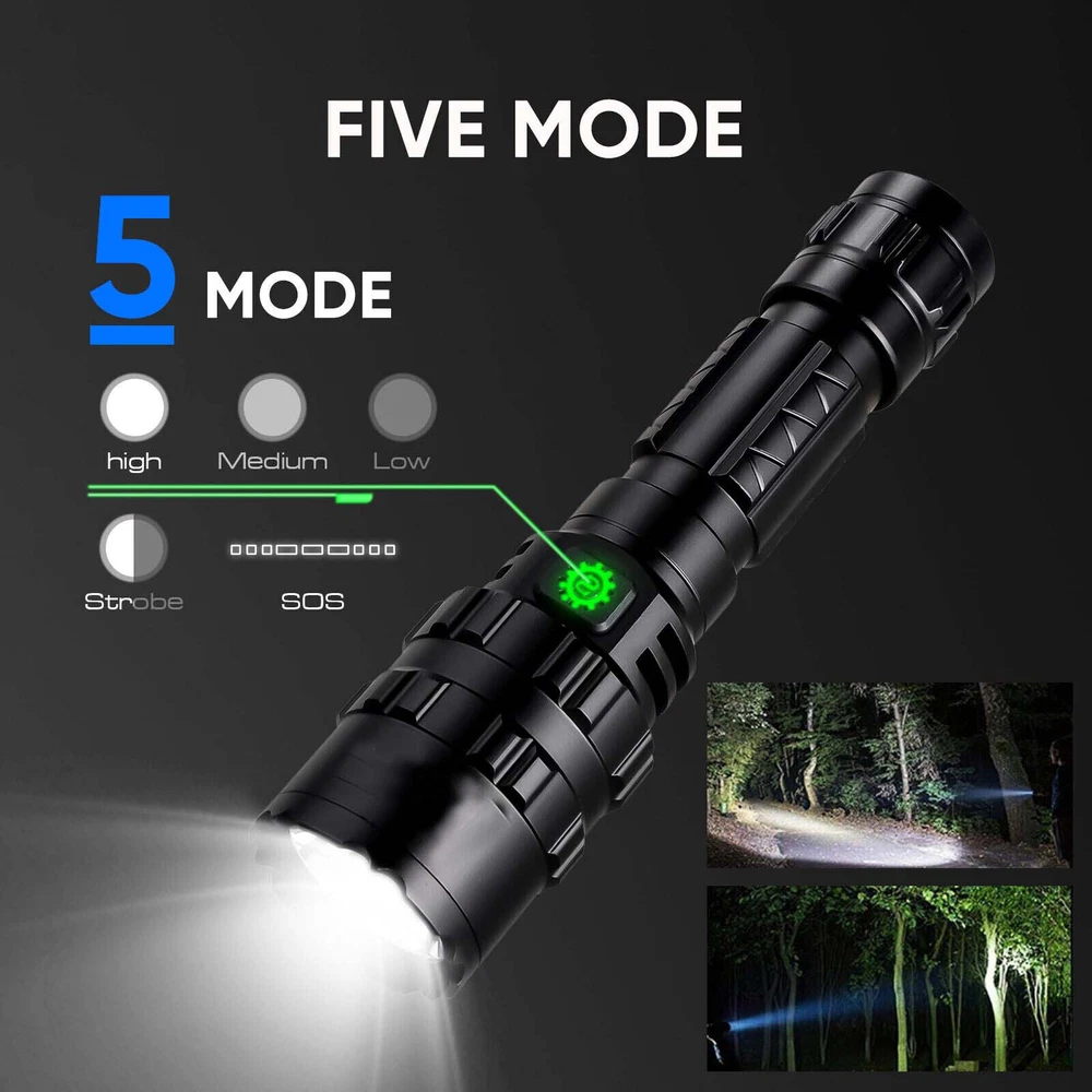 Rechargeable Tactical Flashlight,LED Flashlight 5 Modes,Waterproof, SUPER BRIGHT! Rechargeable Battery,Handheld Flashlight for Camping Hiking Biking Outdoor Activity Powerful flashlight with powerful rechargeable battery built into the flashlight!charges VIA USB cable!! Product Description 【Super Bright Flashlight】Our 200000 lumens tactical flashlight utilizes the durable LED chip,provides poweful light,2 times brighter than normal flashlight.Max beam distance up to 500 meters (1640ft).With a lifetime up to 50,000 hours.Attention:You need get it fully charged before use.please make sure the battery "+" face the inside. 【Rechargeable Flashlight】With rechargeable battery,it can be charged by usb cable(included),low light modes for 6 hours use.Power indicator above the flashlight helps you to know the statu of the battery clearly. 【5 Modes Flashlight】Features with 5 different modes:High,Medium,Low,Strobe,SOS.Easy to change modes by pressing the switch button gently.Mini size fits in your hand or pocket,backpack, survival bag,or car glove compartment. 【Waterproof & Durable】IP65 Waterproof level protect it from splashing water from any angle.Suitable for outdoor environment and adverse weather conditions.Please do not submerge in water for a long time.This flashlight is made of aluminum alloy,skid-proof, abrasion resistance,which is a sturdy tool to hit something during emergency. 【Widely Application】Convenient to operate by one hand with lanyards and compact enough to carry to anywhere in your pocket.Ideal for dog walking,hunting, boating,power outages,patrolling,camping,hiking,emergency.Perfect gift for a father, husband, wife, or college student for any occasion.If you have any question,please feel free to contact us,we promise you a refund/replace anyway. Product Features Utilized upgrade LED with a lifespan of 500,000 hours. Made by military-grade aluminum alloy, premium solid built body. Can be charged via a car/wall adapter, computer or power bank. IP65 waterproof for extreme conditions indoors or outdoors 5 Light Modes: High/Mid/Low/Strobe/SOS With power indicator light Package include : 1x LED Tactical Flashlights 1x USB Cable