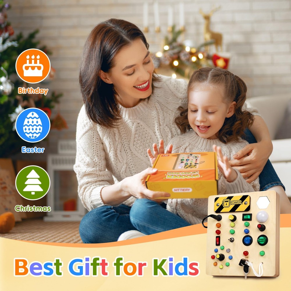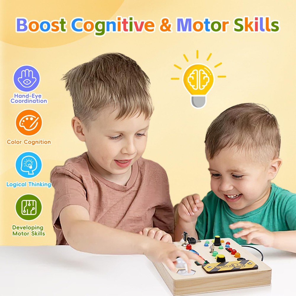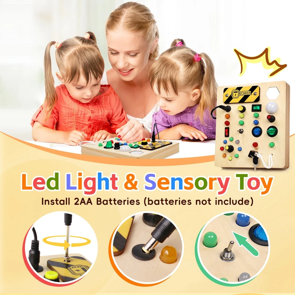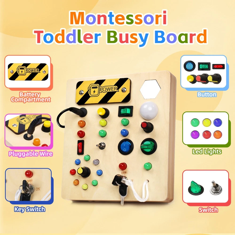 LED Busy Board Sensory Montessori Wooden STEM Toy with Lights for Toddlers 1-3 Years