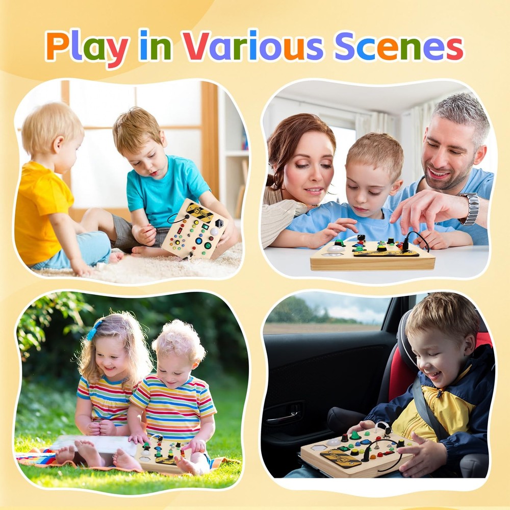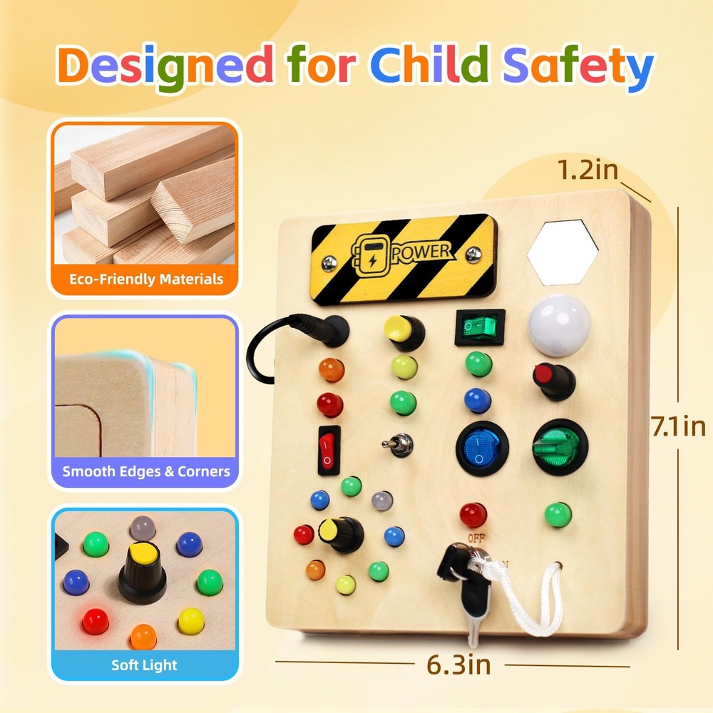 Perfect Learning activity- Fun and unique sensory boards can improve your baby's recognition and sensory activity. Exquisite Sensory toys-Improve children's motor skills and problem-solving abilities. Bring hours of entertainment with endless combinations of buttons, wires and lights. This is a very interactive game, recommended for children from 1 to 5 years old to play. Safe and high quality-Wooden busy board is made of natural wood, smooth corners, completely suitable for children's small hands, to ensure safe and independent use. A great learning toy.-This wooden busy board helps your baby develop fine motor skills, practice hand-eye coordination, distinguish colors and develop intelligence. This sensory toy is well constructed and all the buttons are perfectly sized for toddlers to press easily. Portable Travel toy -I think this baby busy board is a must-have item for kids on road/plane trips. Taking it on the road/on plane trips allows him to focus on his seat and not get bored Toddler Montessori Busy Board - This toy is designed for kids who love switches and LED lights. This wooden toys is set with 10 different switches, each corresponding to a different color or style of LED light.At the same time, this busy board also has a master switch to turn off all the lights with one click to avoid tedious operation.The board also comes with a mirror to keep your child occupied throughout the journey Educational Learning Toys - This sensory board offers a fun and interactive way for toddlers to recognize colors, improve fine motor skills, and enhance problem-solving abilities through hands-on activities High Quality Sensory Toys - Our toddler fidget toys are made of natural wood with smooth edges. All the various buttons, switches, and shifters are securely installed. The busy board with led lights is high quality and very sturdy, ensuring safety for your child. The light is soft and won't hurt children's eyes Fit Size - This product measures 7*6*1 inches.This baby busy board with a mirror for 1 2 3 year olds is suitable for different scenarios, such as at home, on the airplane, in the car, and during travel. It's a perfect travel toys to keep your baby quiet and engaged Best Gifts for Kids - This toddler busy board is the perfect birthday gift for your child. Toddlers can use it to identify different colors and sizes. Designed to turn the boring learning process into a creative and fun one. Please bring your own 2 x AA batteries before use