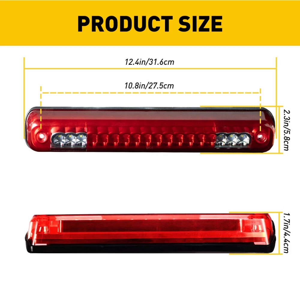 Fit for: 1988-1998 Chevy C1500/K1500/Silverado 1988-1998 GMC C1500/K1500 Specifications: Light Color:Red+White Lens color:Red+white Mode:Red Brake Light + White Cargo Light LED beads: 3LEDs on each side, 12LEDs in the middle Connect method: (Brake red light) Black connect to negative Green connect to positive (white cargo light) Red connect to negative White connect to positive Fitment Type:Direct Replacement Waterproof Rate: IP67 Service Life:more than 50000h Features: *Water-Proof: LED Car Third Brake Light Cargo For 1988 Chevy C1500/K1500/Silverado Red Shell A Fit for: 1988-1998 Chevy C1500/K1500/Silverado 1988-1998 GMC C1500/K1500 Specifications: Light Color:Red+White Lens color:Red+white Mode:Red Brake Light + White Cargo Light LED beads: 3LEDs on each side, 12LEDs in the middle Connect method: (Brake red light) Black connect to negative Green connect to positive (white cargo light) Red connect to negative White connect to positive Fitment Type:Direct Replacement Waterproof Rate: IP67 Service Life:more than 50000h Features: *Water-Proof: The rain-proof design of brake light works even under extreme conditions such as rain and snow(IP67). *High Brightness: New lighting source with the performance of high brightness,long lifetime(more than 50000h) and high realiability. *Superior Material: ABS material is used in our product for offering better quality. *Attractive Appearance: Fashionable appearance can make the whole car more attractive and beautiful. *Energy-saving: Plug-n-Play Operation,Low Power Consumption. Packaging include: Third LED brake light*1 Waterproof cushion*1 Item Specifics Light Color Red&White Certifications DOT Fitment Fits for 1988-1998 Chevy C1500/K1500/Silverado Fitment Type Direct Replacement Bulbs Included Yes Wattage 5 W Manufacturer Part Number Red Brake Light Number of Bulbs 1 Placement on Vehicle Rear California Prop 65 Warning IP67 Brand Unbranded Type Tail Light Assembly Interchange Part Number Red LED 3rd Third Brake Tail Light Manufacturer Warranty 9 Months OE/OEM Part Number 23509162 / 20979071 / 84900397 Voltage 12 V Housing Color Black Features DOT-Certified Lens Color Smoke/Tinted Fitment 2 1988-1998 GMC C1500/K1500 Finish Polished Lighting Technology LED Waterproof Rate IP67 LED beads 3LEDs on each side, 12LEDs in the middle FAQ ♥ If you have a decoding problem or any other problems, please contact us first, we will help you with it. We will reply you within 24 hours in working days. I'm a new seller, thanks a lot for your trust and convince! I will serve you with all my heart. ♥ Q1: Will this bulb fit my vehicle? A: We can match almost any vehicle to one of our bulb sizes. eBay only lets us include some vehicle fitments per listing, but if your vehicle does not show up on the compatibility table at the top of our listings, welcome you to contact us for free consulation before purchasing a product. Q2: My item has not arrived, what's taking so long? A: Sometimes items take longer than expected, especially if it’s going far or to rural area. Check with your post office to see if your item has been held up. Sometimes Royal Mail will not update a tracking number until it has arrived at its destination. If your item still don't arrive after a few days, let us know so we can double check for you and help solve it asap. Q3: My bulbs won't fit, help! A: Special bulb holder may be required. See if you can take the holder from the stock bulb. If not, let us know. The bulb size may be wrong, double check the item you received with the item you ordered. Do you have an aftermarket lighting housing? These may not be perfectly fitted for aftermarket bulbs and will require some manual modifications. Q4: Neither side lighting up? Both sides flicker, hyper flash, or work inconsistantly. A:Check the light fuses, and then check the ballast plugs to insure correct installation. If this doesn't work, there may be a voltage problem with the vehicle. You probably just need a relay or capacitor. Even though some bulbs are builtin resistors, they may still need a decoder. Pay & Ship (1). We gladly accepts payment via PayPal, We will ship your item(s) within 24 hours. (2). Before payment, please keep the consistency of Paypal address and ebay address. (3). Quantity orders are welcome! Returns (1). We offer 60 days free return policy. Please contact us within 60 days from the date you receive your order if you have any issues with the product or want return. Refund will be send after we got your resend package. (2). All returned items should be in the original packaging , return tracking information should be provided . Contact Us (1).Negative feedback will not help resolve any problems you have, please contact us via eBay messages before leaving negative feedback , our customer service will make best effort to help you with the issues. (2).We maintain high standards of excellenceand strive for 100% customer satisfaction! Feedback is very important to us. We request that you contact us immediately before you give us neutral or negative feedback, so that we can satisfactorily address your concerns. About us We're professional in car and motorcycle accessories, especially in LED bulbs. We have our own factory and R&D team. Our belief is to sell top quality items that fit your car and serve you with our heart. Anything please feel free to contact us! Our customer service is very responsibility. Come and follow us! DESCRIPTION NEW ARRIVED HOT SALE CONTACT US SAVE US Store Category Store Home Other Hot Item 4PCS RGB LED Strip Under Car Tube Underglow Underbody System Neon Light Kit 5050 USD 25.64 LED License Plate Light For 88-00 Chevy C/K 1500 2500 3500 BRIGHT WHITE Tag Lamp USD 13.99 LED License Plate Tag Lights For 2014-18 Chevy Silverado GMC Sierra 6000K White USD 14.89 5Pcs FORD F350 F150 For F250 Roof Top 1973-1997 Cab Lights Marker Amber Lights USD 27.54 1000pcs Headliner Star Light kit Roof Twinkle Ceiling Light Optic Fiber Home Car USD 72.99 New List Item 6X 9005 C