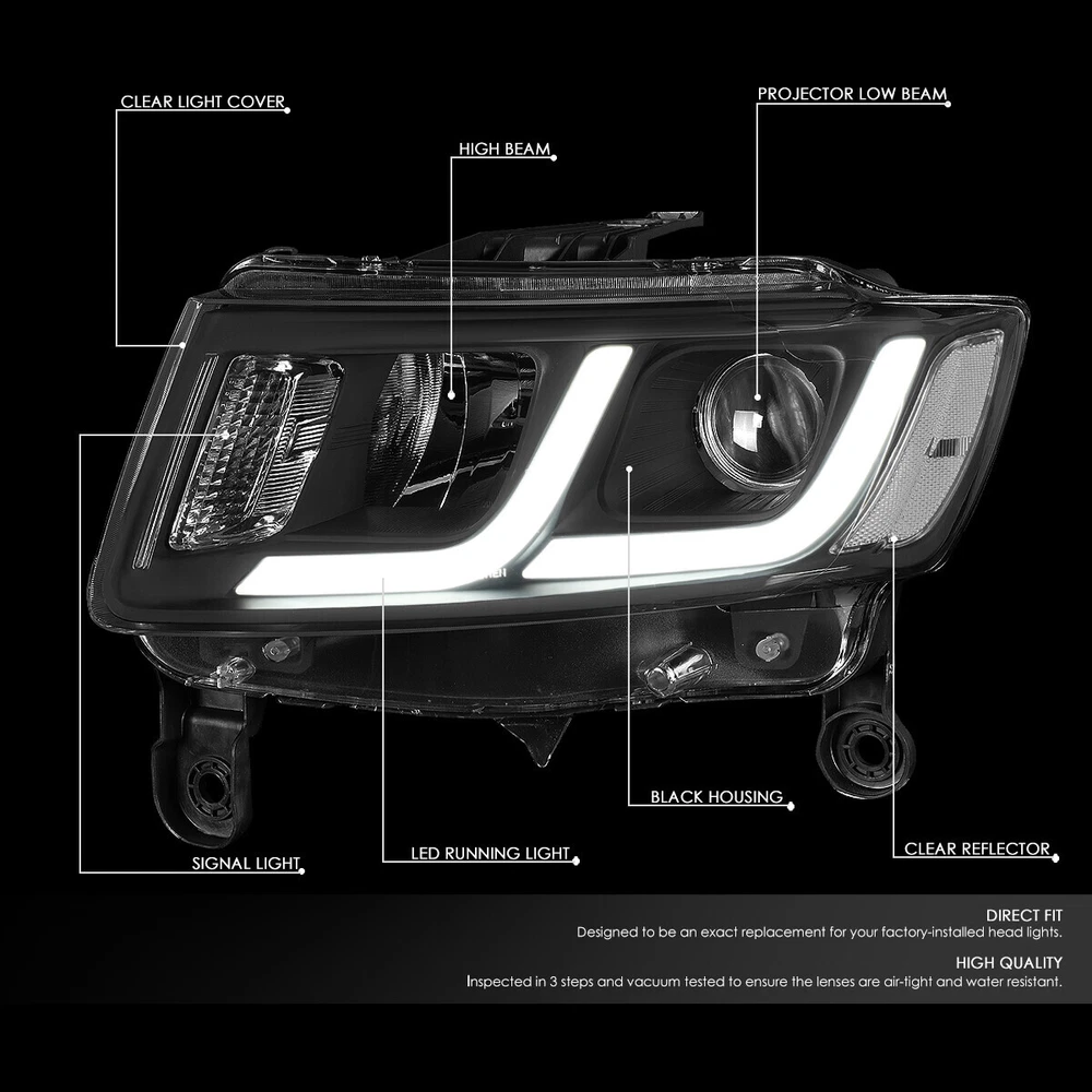 Welcome to Speed Daddy Store Home About Us Feedback Add To Favorites New Arrivals Ending Soon Contact Us [LED DRL]FOR 14-16 JEEP GRAND CHEROKEE PROJECTOR HEADLIGHT LAMPS W/BUMPER GRILLE Product Description A headlight (headlamp) is a lamp attached to the front of a vehicle to light the road ahead. Headlight performance has steadily improved throughout the automobile age, spurred by the great disparity between daytime and nighttime traffic fatalities. Headlights are one of the most important components of your vehicle; they allow you to see the road in front of you clearly during the night and in any bad weather that may arise. Our headlights upgrade the face of your vehicle with clear style and extreme range. Your car or truck's grill sets the standard of appearance for the whole vehicle when you are approaching other cars on the street. There is nothing like making the first impression when the vehicle are on the street. Grilles not only serves as the centerpiece of your vehicle, it also prevents debris and or harmful things from damaging radiators while allowing air to pass by and keep the engine running cool. Our stylish grilles aggressively enhances the appearance to make your car stand out from the crowds. They are constructed of quality materials for strength and durability. These handsome looking grilles provide a great alternative to transform your vehicle's appearance to the next level. Specifics and Features : Headlight: Plug-n-Play Operation, Direct Bolt-On OE Fitment or Replacement for the Stock Unit Comes with a Complete Set of Headlights (Driver and Passenger Side) Brings a Different Appearance to Vehicle thats Great for Show Use or to Replace Old and Worn Headlights LED Running Light Strips LED Turn Signal Lights Built In Projector Low Beam Conversion Front Grille Replacement: Custom Fitting Grilles that Will make Heads Turn on the Street Gloss Black Finish Ready for Installation Easy to Install for even Beginners Reinforced Plastic for Strength and Longevity of Use Precise Fitment Honeycomb Grille Style LED Light Bar Includes : 1 X Pair of Headlight (Left & Right) 1 X Front Grille Notes : Compatible with: 14-16 Jeep Grand Cherokee Pre Facelift Fits Models with Halogen Headlights Only 100% Brand New Professional Installation is Highly Recommended No Bulbs are Included DRL's Require Wiring into Existing Vehicle Harness Shipping Payment Returns Terms & Conditions Feedback Contact Us DOMESTIC LOWER 48 US STATES: FREE SALES TAX: CA ONLY VERY IMPORTANT: Double check shipping address. We are not responsible for incorrect or undeliverable addresses. Please use Shipping & Payments tab on top of page for shipping details for your location. Shipping to PR, HI, AK and PO Box addresses will be charged the same as shipping to Canada. GU, VI, SAIPAN will be charged the same as international shipping rate. For Canada shipping please select the lowest price. We do not offer expedited shipping. US Territories such as GU, VI, SAIPAN will be charged the same as CANADA shipping rate. Transaction will be held until a full shipping amount received. Some of the packages cannot be delivered to a PO Box. Customer is responsible to ensure PO Box address given is deliverable by the shipping company. Package will be held until a valid physical address is provided. Customer assumes shipping charges incurred in shipping to undeliverable address. International buyers are responsible for all customs duties, taxes, and other applicable fees incurred by the country's customs/border regulations. Please contact customs for more information. We ship 98% of all orders the same or next business day after payment received/cleared. Please understand that once orders are shipped, we cannot control the transit times thereafter. Most orders will ship via USPS First Class/Priority Mail or FedEx/UPS or the best suitable carrier for the specific size of the product. We are not responsible for any changes to address after item has been shipped. Item will be shipped out within 24 hours after payment cleared, except for weekends and holidays. PayPal e-check takes 3-7 business days to be processed. We will not ship until an e-check has been cleared. 30 Days Free Returns, please notify us within 30 days after you've received your order. Please email us or call us to obtain a RMA (Return Merchandise Authorization) number from us, and have the RMA number written on the return package. Items to be returned must be in resalable condition. All returns are for refund ONLY. No exchange accepted. For emissions related items, please check with your local jurisdiction for emission specific requirements before purchasing. All items do not come with installation instruction unless otherwise specified. If item is questionable, please consult your local professional/mechanic before making purchase. Shipping DOMESTIC LOWER 48 US STATES: FREE SALES TAX: CA ONLY VERY IMPORTANT: Double check shipping address. We are not responsible for incorrect or undeliverable addresses. Please use Shipping & Payments tab on top of page for shipping details for your location. Shipping to PR, HI, AK and PO Box addresses will be charged the same as shipping to Canada. GU, VI, SAIPAN will be charged the same as international shipping rate. For Canada shipping please select the lowest price. We do not offer expedited shipping. US Territories such as GU, VI, SAIPAN will be charged the same as CANADA shipping rate. Transaction will be held until a full shipping amount received. Some of the packages cannot be delivered to a PO Box. Customer is responsible to ensure PO Box address given is deliverable by the shipping company. Package will be held until a valid physical address is provided. Customer assumes shipping charges incurred in shipping to undeliverable address. International buyers are responsible for all customs duties, taxes, and other applicable fees incurred by the country's customs/border regulations. Please contact customs for more information. We sh