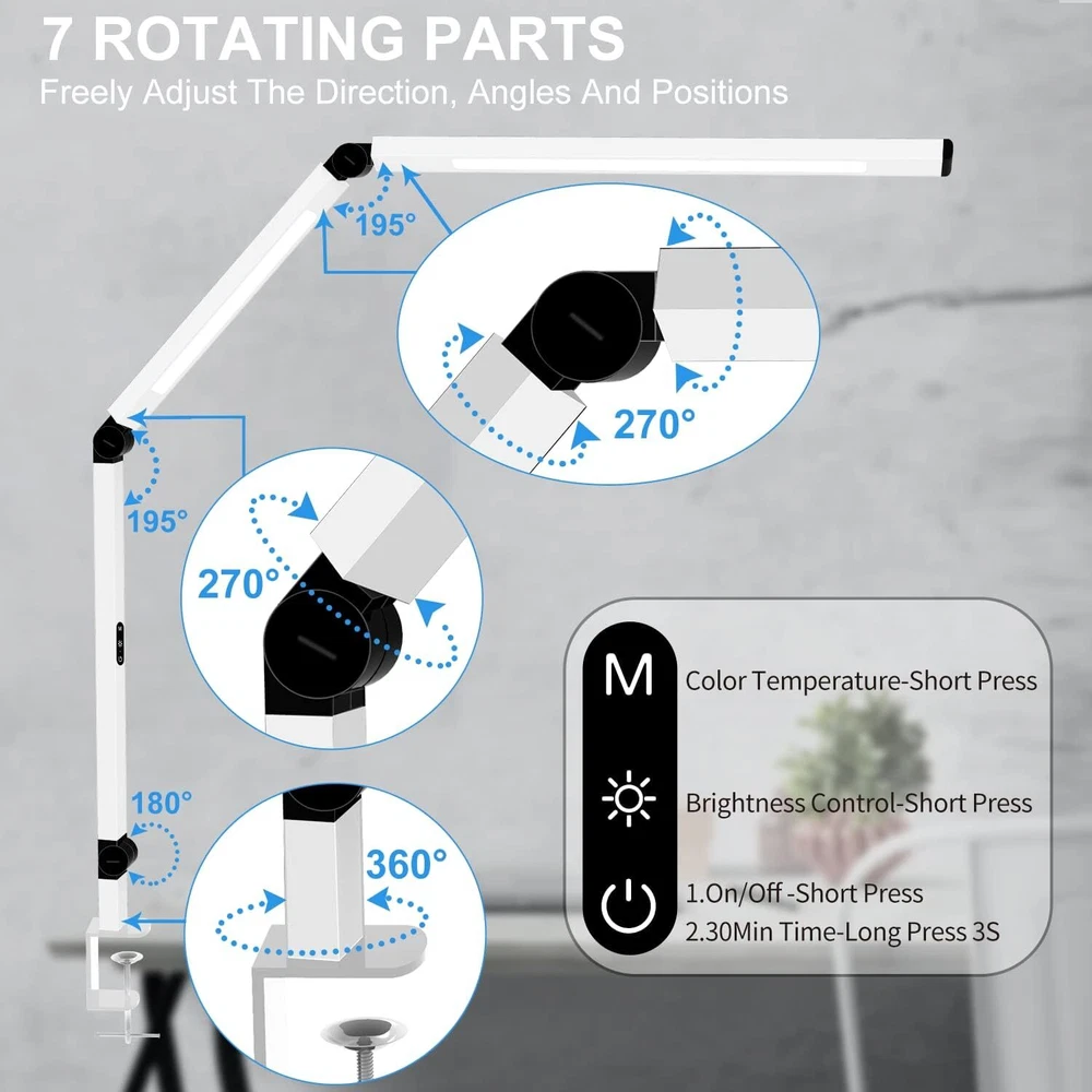 Product Description LED Desk Lamp for Home Office, Architect Clamp Desk Lamp with Remote Control, Adjustable Swing Arm Clamp on Desk Light Clip-on Dual Light 5 Brightness Levels & 4 CCT Modes Table Light 【Dual Light Source Design, CRI=95】 swing arms led desk light with dual light source, which can evenly illuminate the entire desktop workbench. The desk lamp offers a nature and soft light colse to the sunlight, CRI=95. No flicker, no glare, less blue light hazard. You won't get tired with prolonged use. 【7 Rotating Parts】The office lamp body has 7 rotatable parts, which can be freely adjust the direction, angles and positions(you can check our videos for details), and can be clipped to various scenes such as desktops, bookshelves, sofa sideboards, shelves, and bedheads. 【Ultra-Wide Metal Clamp & All-Aluminum Lamp Body】The clamp light is equipped with an ultra-wide strong metal clamp with silicone pad, which supports the maximum thickness of the desktop edge up to 2.5". Please insert the metal clamp completely into the tabletop, tighten it, and keep the desk top and bottom flat; The lamp body is all made of high-quality aluminum, which has superior heat dissipation performance, prolongs the service life of clamp lamp, and has good texture. 【Eye-Friendly Technology and 5 Brightness Levels & Adjustable Color Temperature】LED desk lamp for home office offers you 4 different Color Temperature choices(warm white, nature white,cool withe, daylight)5 brightness levels for each color mode, which can be easily controlled by the touch sensitive switch on the table lamp or the remote controller, perfect for studying, reading, working, drawing, crafting. 【Timing & Memory Function】 table clamp have built-in automatic delay-off function in the led lamp. It can be set 30 minutes before sleeping, then it will turn off automatically. It is not necessary to worry about getting out of the warm bed to turn off the light. The office table lamp supports power off memory function, it will return your last setting when you turn it on next time. About Us We are a reputable seller with many years of experience selling on eBay. Our goal is to provide high-quality products and excellent customer service. Payment 1.We accept PayPal only. 2.All major credit cards are accepted through secure payment processor PayPal. 3.Payment must be received within 7 business days of auction closing. 4.We ship to your eBay or Paypal address. Please make sure your eBay and Paypal address is correct before you pay. Feedback will be left automatically after we receive your feedback. Please contact us before leaving a Negative feedback or Neutral feedback. We would try our best to help you solving any problem. Shipping Items will be shipped within 1-3 business days when we received payment. (Orders are not processed on weekends & holidays) Tracking information will be sent once item is shipped. Delivery time depends on destination and other factors Item is shipped to ebay address. Leaving correct address can minimize delay. For international shipping and shipping to Guam, Hawaii and Alaska, Please contact us before placing the order. International buyers please note: Import duties, taxes and charges are not included in the item price or shipping charges. These charges are buyer’s responsibility. We will try our best to reduce the risk of the custom duties. Local pick-up is unavailable at the moment. Returns For any issues with Defects, Return, Item Exchange request, please contact us first and send us a message first before opening any type of case or request. We devote ourselves making EVERY CUSTOMER in 100% Satisfactory and resolve any problem. We highly value and appreciate your business. Thank you. No returns will be accepted without an RMA number. Please contact us for the RMA number. Return is acceptable within 30 days of delivery. Return for replacement or money back is optional. Returned items must be in the brand new, unaltered and resalable condition. Seller is not responsible for any labor cost, expense in a dealer store, or damage due to wrong installation. Contact Us We reply any email messages within 1 business / working days(off-duty at weekend). If you do not get a response from us, then please check your junk or spam mailbox. Our Business hours: Mon-Fri 9:00-18:00, UTC/GMT +8 hours. Please contact us either by clicking "contact seller" in the "purchase history" section or simply click "ask a question" at the bottom of this page. If you are unsatisfied with our item or service, please contact us before leaving any feedback. We are committed to resolve all issues in a friendly and satisfactory manner. powered by