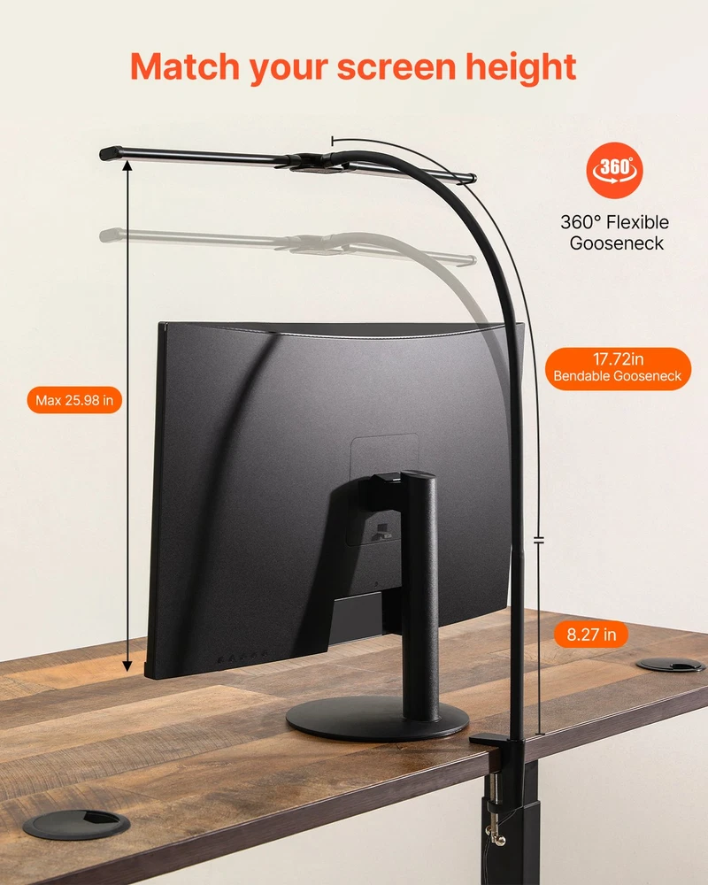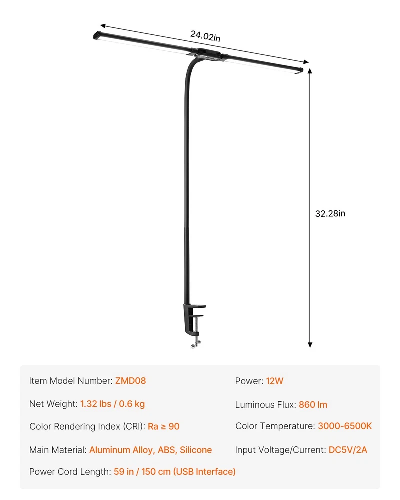 LED Desk Lamp with Clamp Double Head Desk Lamp with 360° Adjustable Gooseneck Soft, Even Lighting Adjustable Brightness & Color Temperature Timer & Memory Functions 360° Flexible Gooseneck Easy Installation Ideal for Home Office Power Cord Length: 59 in / 150 cm (USB Interface),Color Rendering Index (CRI): Ra ≥ 90,Color Temperature: 3000-6500K,Item Model Number: ZMD08,Input Voltage/Current: DC5V/2A,Net Weight: 1.32 lbs / 0.6 kg,Power: 12W,Main Material: Aluminum Alloy, ABS, Silicone,Luminous Flux: 860 lm