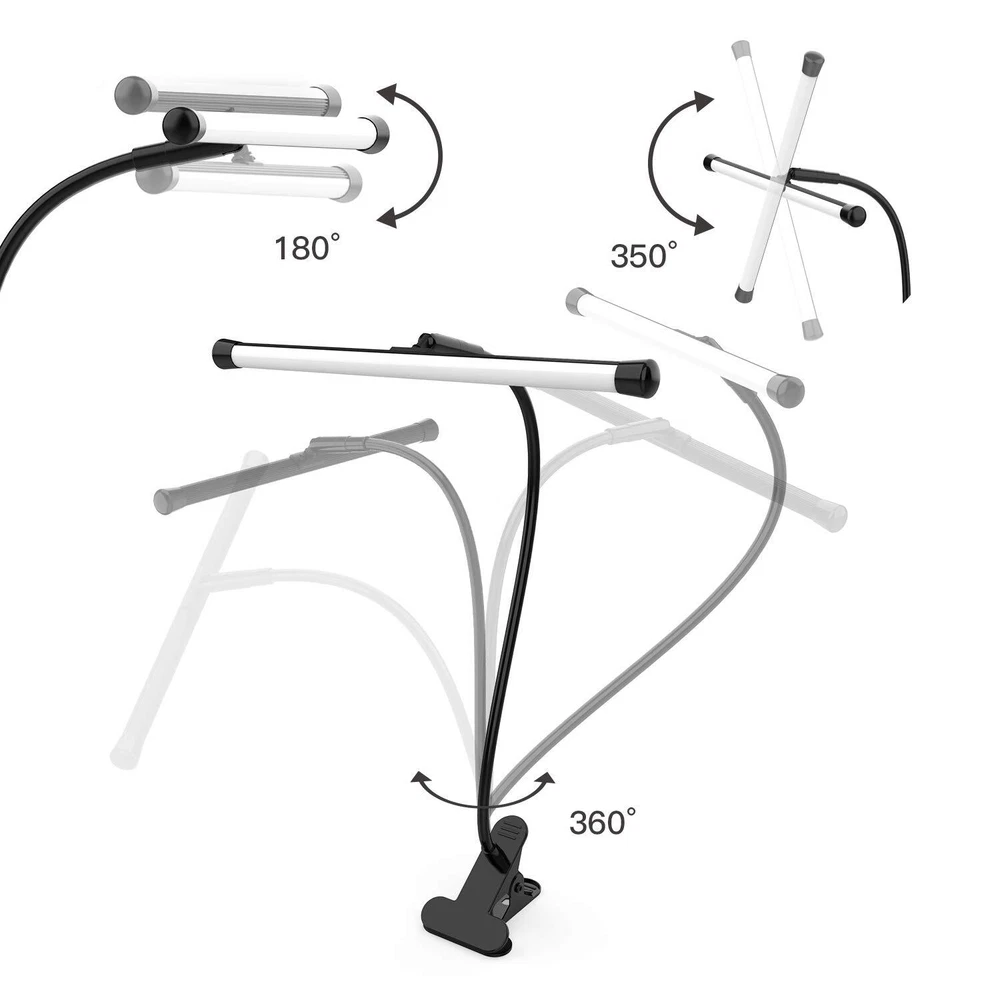 [Flexible Gooseneck Design] The video conference lights with a flexible neck and head can be adjusted up and down 180 degrees and rotated 350 degrees for easy positioning and setting of perfect lighting directions as needed. [Dimmable] 10 Brightness Levels - Press the brightness button can allows you to easily adjust the brightness level between 10% and 100% to achieve the perfect lighting. easily find the perfect lighting for your project. 3 color temperatures optional - Reading lamp have 3000K-4000K-6500K (3 color temperatures) to satisfy your different lighting needs. [USB Powered & Memory Function] This desk lamp come with an adapter. Insert the USB Cable to power adapter, computer or other USB devices to power the clip lamp. Brightness memory will memory your current brightness when turning off the light. (Note: if you cut off the power supply instead of turning off the switch, it will release all settings.) [Desk Lamp Clamp Easy to Install] The clip on light with strong metal clamp can be clipped on any flat surface that the thickness is less than 2.4"/6cm(max) thick. [Professional Eye Protection] Adopting diffusion translucent material, close to daylight illumination, emitting soft light without ghost, glare or flicker. led task lamp suitable for bedside, reading, music stand, drawing, work, study, etc.