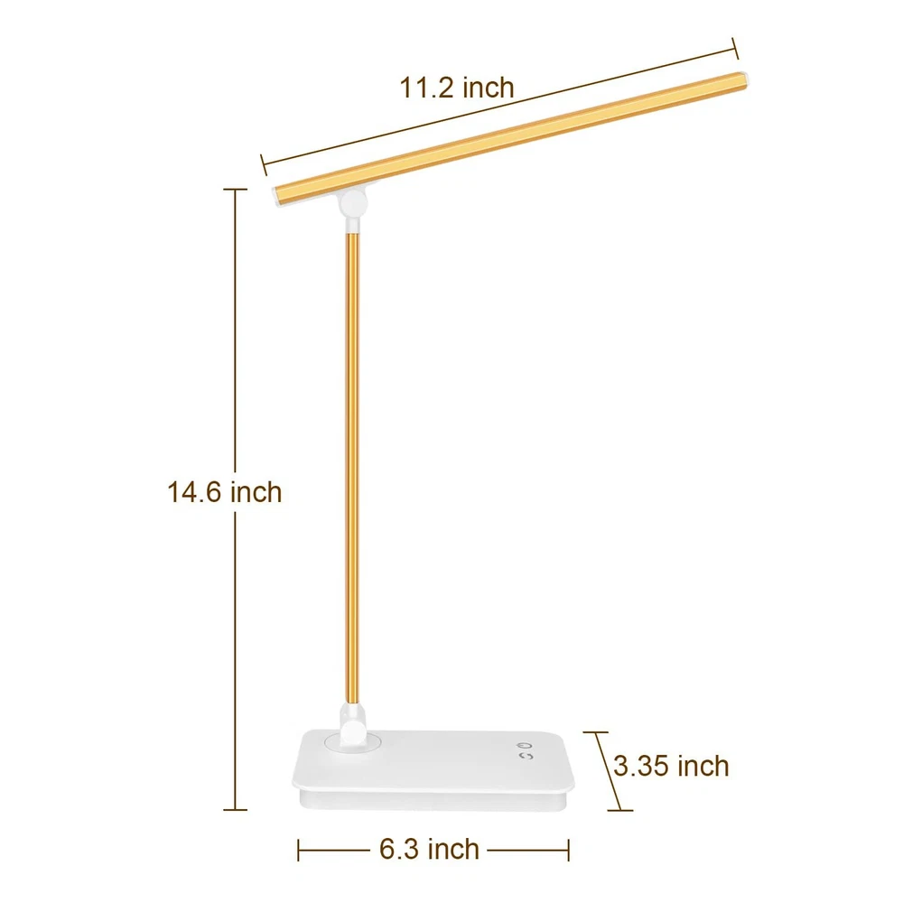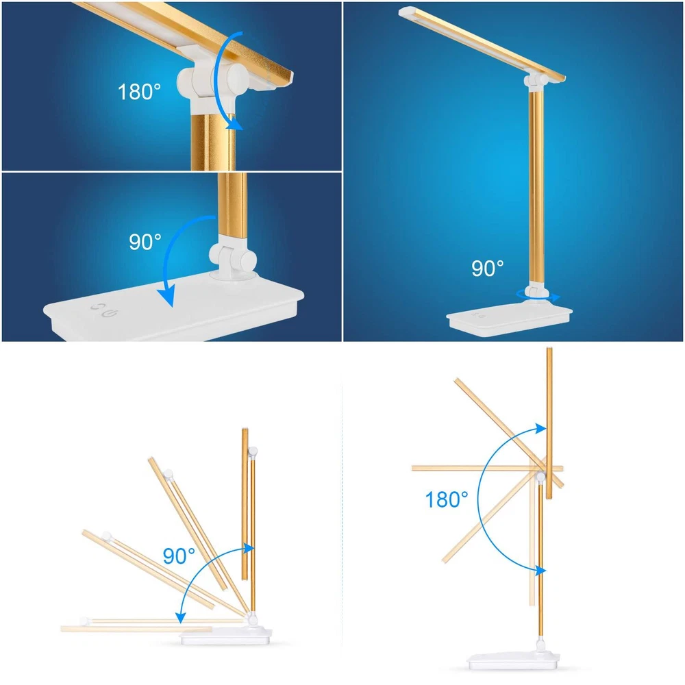 Eye-friendly: 3 different lighting options with multiple brightening settings. You may choose the favorite brightness you want for nail tech, reading, studying and working. Color temperature is 2800-6500K, eye caring soft light, non-flickering Modern Design: The desk lamp is in folding design with 180 degree adjustable head lamp and 90 degree rotatable base, portable to use anywhere Sturdy Material: The lamp body is aluminum and base is ABS. Lightweight but sturdy. Enough strong to use in any indoor condition, no worry to break. It is a good desk lamps for bedrooms too Extra Function: The cute desklamp comes with an USB cable and a power adapter. Additionally, there is USB charging port in backside to charge your smartphone Feature: The brightness is 400 lumens. Input 110 Volts. The desk lamp doesn't take much space. Great for small desk