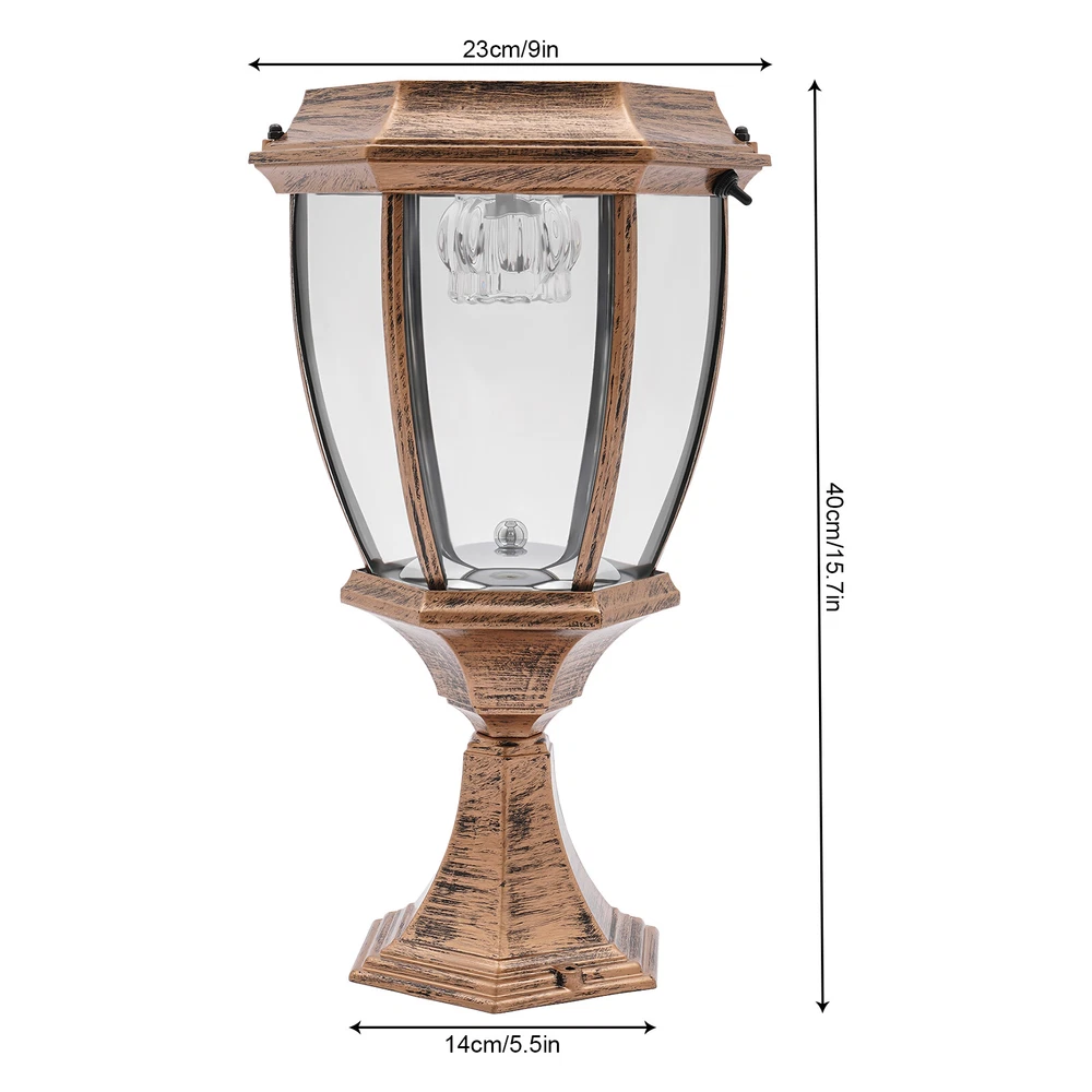 Welcome Material: Aluminum and glass Color: bronze Rated power : 5 W Protection class: IP55 Brightness: 55-60 lumens Light emitting parts: transparent glass Solar parameters Protection class: IP44 Rated power: 0.3 W Voltage: 2.4V Sunshine time:6-8 (h) Battery life: 3000 (h) Light source: LED Sensing distance: about 3-5 square meters. Solar panels: 1W Power (included): 1 pcs 2 200MAh nickel-metal hydride batteries (can work on rainy days or night ) Size:(L)X(W)X(H) 200 X160 X 350mm/7.87''X6.30''X13.78"(appr.) Features Brand New and high quality. Energy saving, waterproof, anti-pressure,environmental and will never rust. Can absorb solar energy and storage power during the day through the battery,the lights can automatically light up when the evening is coming. Perfect for Lawn, garden, bungalow, villa, courtyard ,town, house, community, entrance ,passageway, balcony ,walkway, etc. Package included: 1 Pcs Solar Lamp 1 Pcs 2200mah nickel-metal hydride batteries Notice: Please allow 1-3cm error due to manual measurement and make sure you do not mind before ordering. Please understand that colors may exist chromatic aberration as the different placement of pictures. Payment Delivery details Terms of sales About us Contact us Payment We accept ebay payment 。 Fees such as import duties, taxes are not included in the item price or shipping costs. These charges are the buyer's responsibility. Delivery details Shipping: 2-9 working days to: USA Terms of sales We maintain high standards of excellence and strive for hundred percent customer satisfaction. Feedback is very important to us. We hope that you contact us immediately before you give neutral or negative feedback, so that we can address your concerns. It is impossible to address issues if we do not know about them! About us Your satis faction is our ultimate goal. We work hard to earn your trust and future business. Our certified technicians have tested each item before shipping. The unit comes with 1 year limited warranty on all manufacturing defects. a) If you receive a defective item, you may return it or ask for a discount. Please contact us within 14 days after you receive the package. b) What you returned must be intact and in its original packaging as re? u. Customer is responsible for shipping costs of the returned item. c) We will cover the cost of shipping back t with the shipping rate indicated in the registration page. We will send you a new unit or refund the full payment you paid. Thank you. Contact us Business Hour Business Hour: Monday To Friday: 8:30 AM to 5:00 PM (Beijing China time) Due to time zones, our reply to your questions may not be immediately. But within above working time, we will reply your email within 24 hours. If it's non-workdays, please kindly be patient and wait till Monday. Please contact us with ebay message. Please feel free to contact us if you have any questions. Monday To Friday: 8:30 AM to 5:00 PM (Beijing China time) Due to time zones, our reply to your questions may not be immediately. But within above working time, we will reply your email within 24 hours. If it's non-workdays, please kindly be patient and wait till Monday. Please contact us with ebay message. Please feel free to contact us if you have any questions. Energy Star n/a EC Range n/a Protection class IP65 Sensor Type Light Type LED Pillar Light Brand Unbranded MPN Does Not Apply Bundle Listing Yes Material Aluminum and glass Color bronze Sunshine time 6-8 (h) Battery life 3000 (h) Light source LED Power Source 1pcs 2200MAh nickel-metal hydride batteries Lighting Technology Solar Lamp Installation Area Outdoor Features Energy saving, waterproof, anti-pressure Number of Lights no Theme Solar Lamp Number of Settings 2 Pcs Solar Lamp Mounting Ground Light Color White Finish Golden Style Modern Power Consumption 5 W Size 7.87''X6.30''X13.78" Control Style Solar Lamp LED String/Strip Type Solar Lamp UPC Does not apply