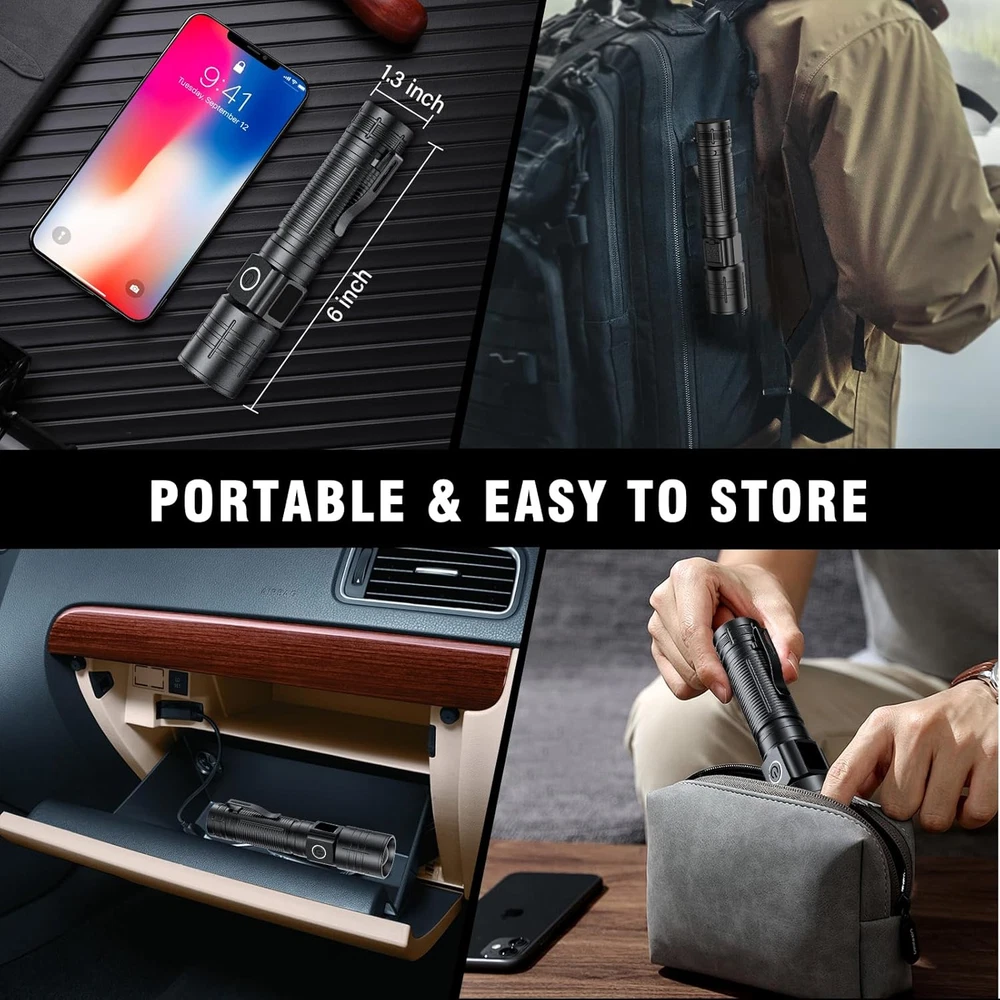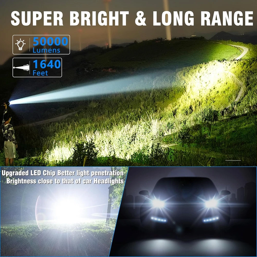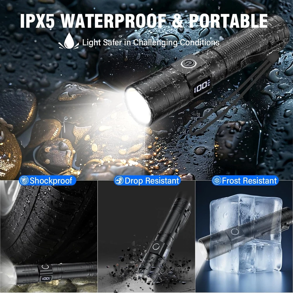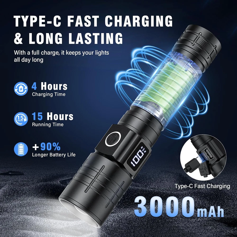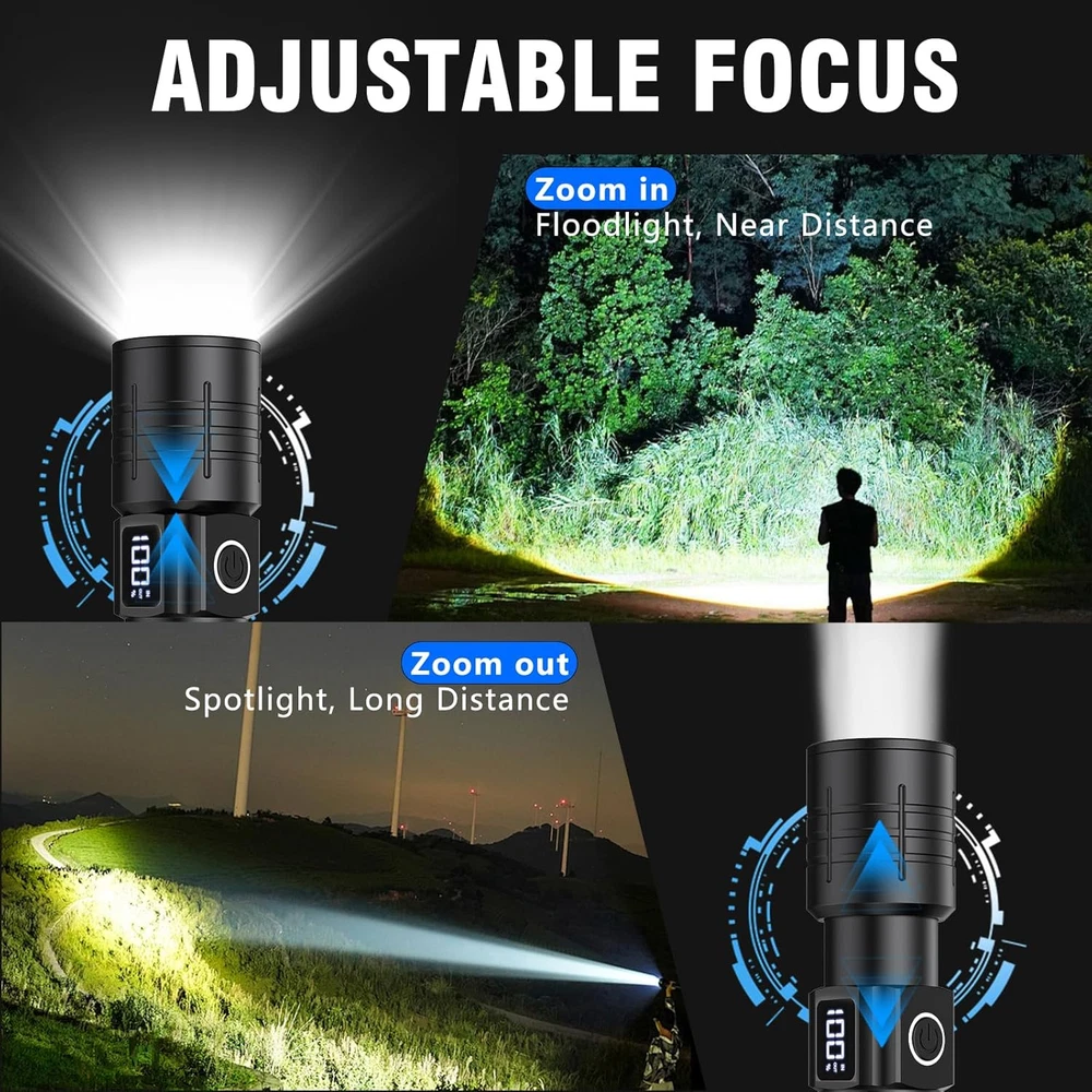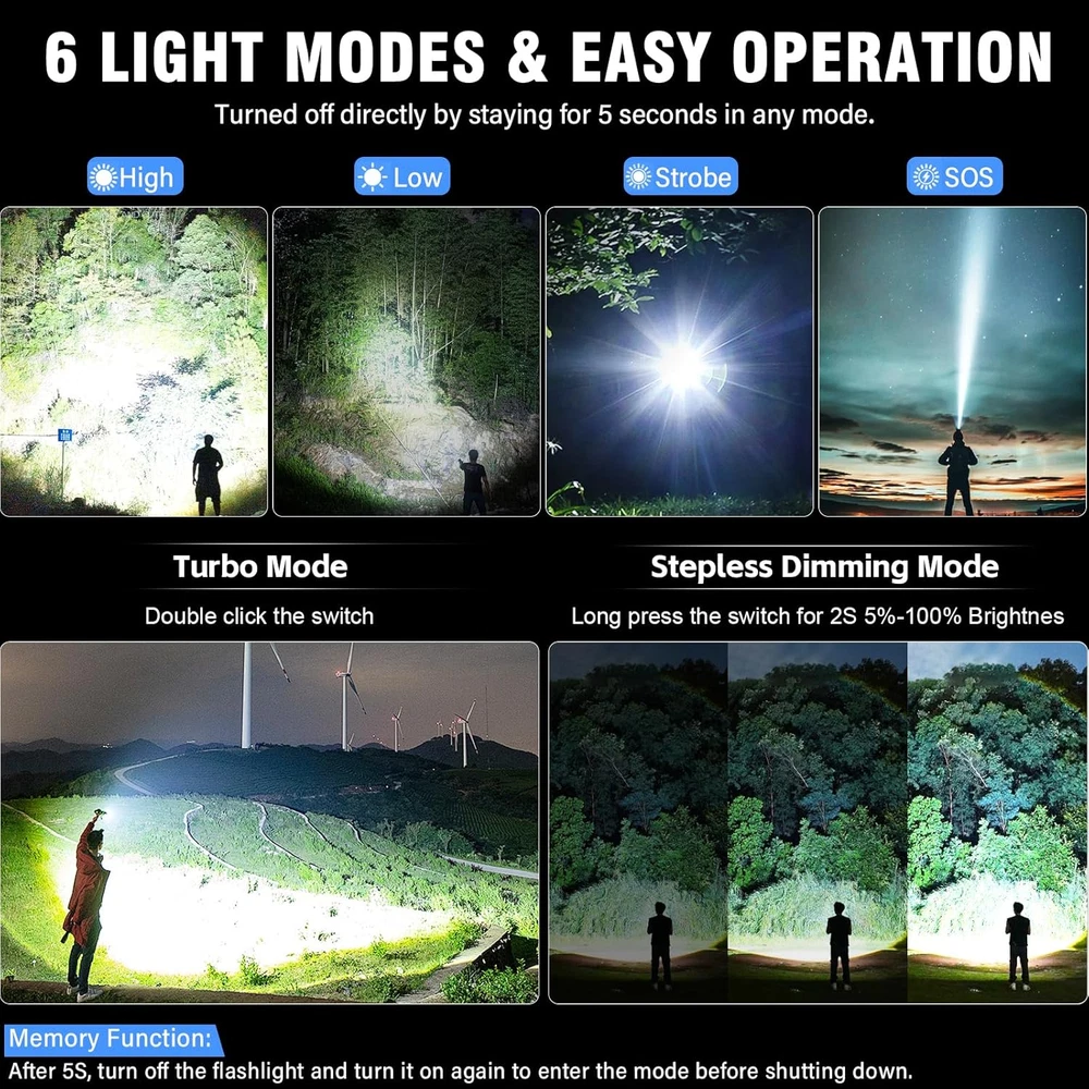 SUPER BRIGHT 50000 LUMENS: Experience unmatched brightness with our upgraded LED flashlight, delivering an incredible 50,000 lumens. This powerful flashlight illuminates objects up to 500 meters away, easily lighting up spaces as large as 120 square meters. Ideal for outdoor adventures like hiking, camping, fishing, and night walks, as well as emergencies. Compact yet powerful, it’s a must-have for home backup and all your outdoor activities 6 LIGHT MODES & ADJUSTABLE BEAM: Tailor your light output with the adjustable beam. Simply push/pull the head to switch between floodlight (for close-up use) and spotlight (for distances up to 500 meters). Choose from 6 modes: High, Low, Strobe, SOS, Stepless Dimming, and Turbo. The SOS mode is especially useful for emergency situations. The High mode lasts 4 hours, while the Low mode extends up to 15 hours TYPE-C FAST CHARGING & LONG-LIFE & POWER DISPLAY: Charge your flashlight quickly in just 4 hours via the convenient built-in TYPE-C interface, compatible with USB sockets, laptops, and other USB devices. Enjoy up to 15 hours of consistent brightness, ensuring you’re never left in the dark. The intuitive LED display shows real-time battery levels, you will know how long it will last and charge it in time DURABLE & WATERPROOF& COMPACT: The powerful flashlight is made of aluminum alloy, with the metal body, it is durable, shockproof, waterproof, can work in raining day, snow day, storm day or other bad weather. As a compact handheld size, the sturdy pocket clip ensures easy portability and store. it is ideal for home backup,night reading or sudden blackout.It is also perfect for hiking, camping, dark walk, emergencies or other outdoor activities TURBO MODE & MEMORY FUNCTION: Activate Turbo mode with a double-click for maximum brightness, ideal for extreme situations. The built-in memory function automatically restores the last used mode, making it easy to use the flashlight consistently. Whether at home, in tactical settings, or on an adventure, you can count on this tactical flashlight to deliver reliable, long-lasting performance Product Description 1 ZOOM OUT 2 ZOOM IN 1 REPAIRING 2 CAMPING 3 READING 4 WALKING 5 GIFTING