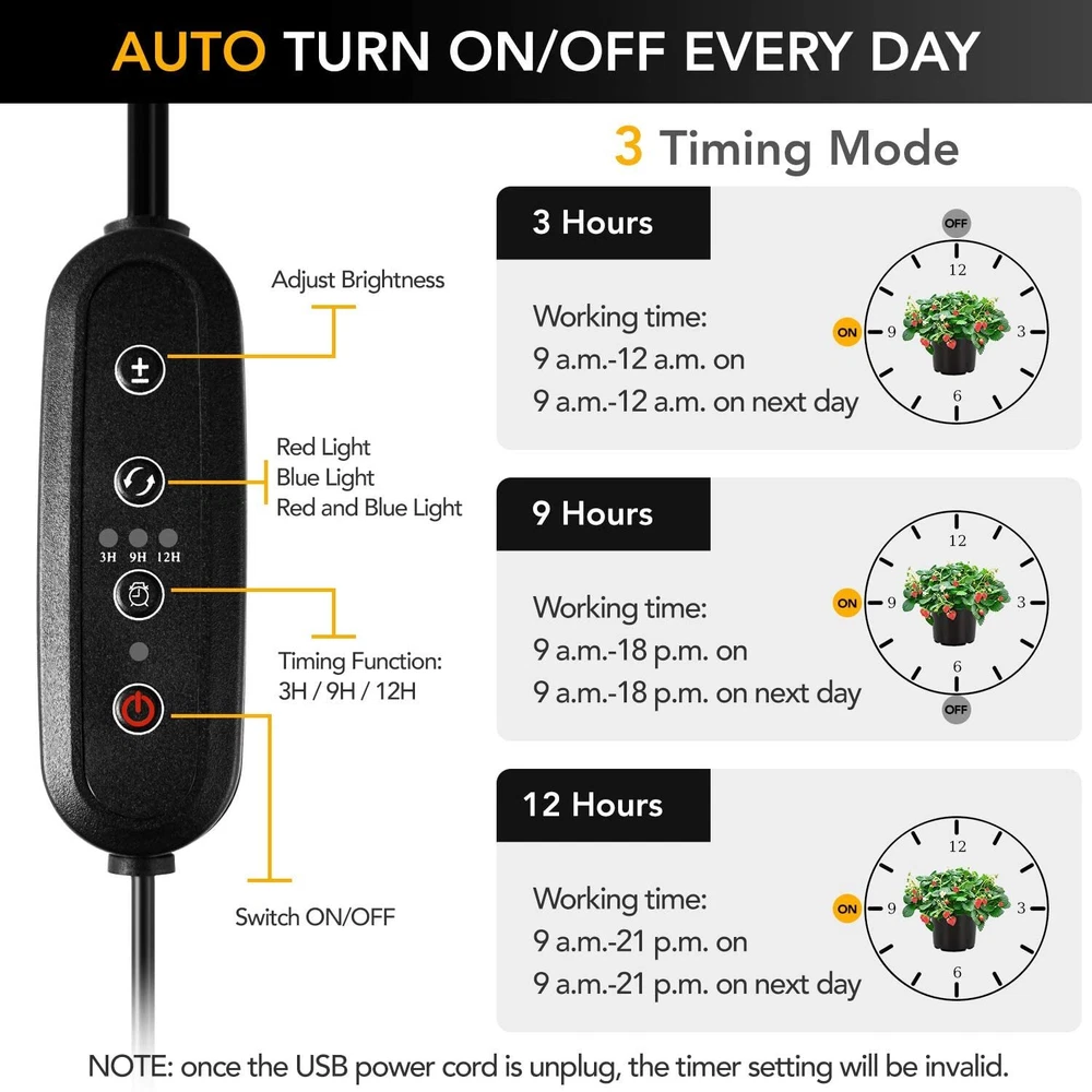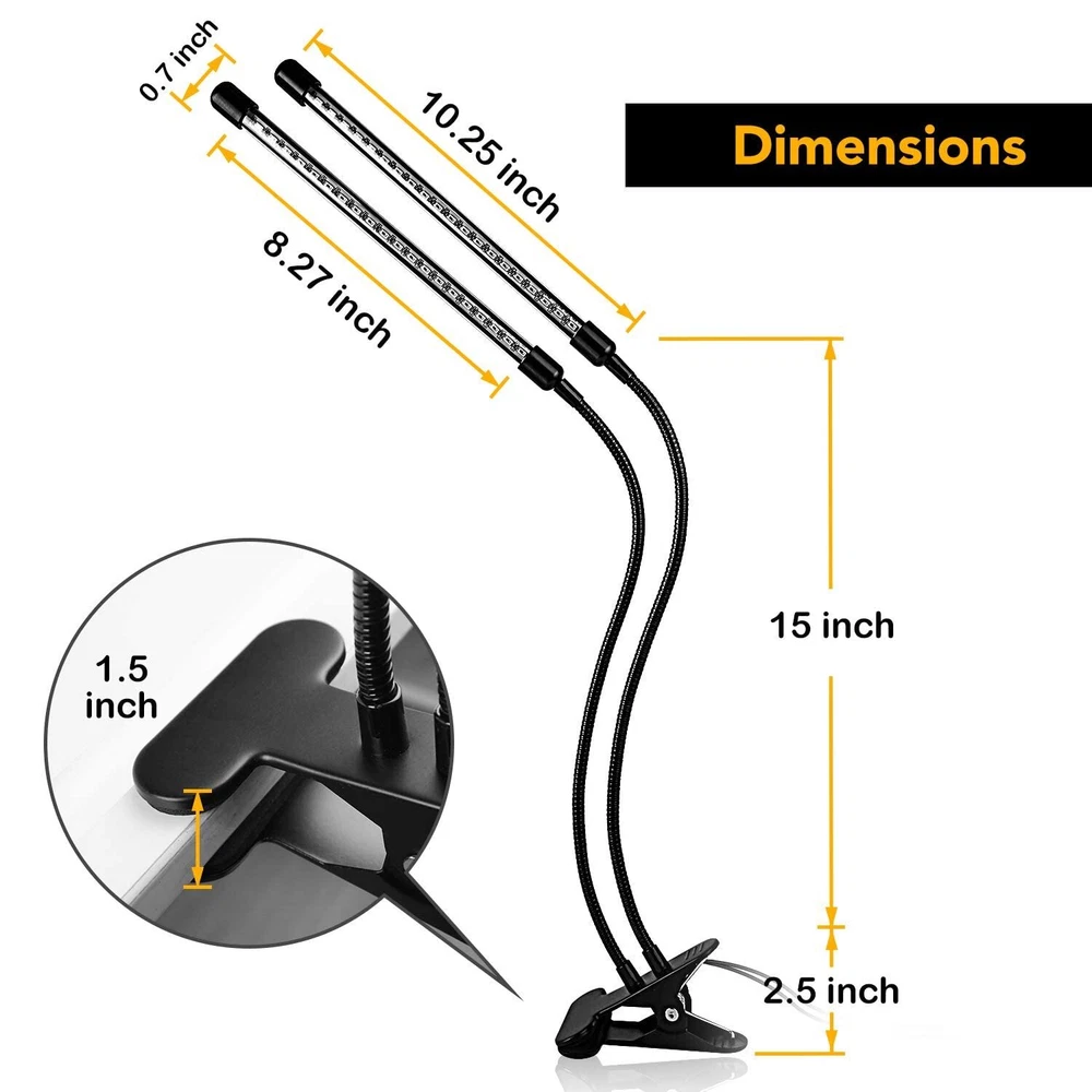 About this item The red and blue spectrum adjustable gooseneck lamp provides the optimal wavelengths for chlorophyll absorption and photosynthesis, promoting healthy plant growth and increasing yields. The grow light is suitable for a variety of indoor growing setups, including hydroponics, aeroponics, and soil-based systems, making it a versatile and adaptable choice for indoor gardening enthusiasts. The auto ON/OFF function with timing options ensures that your plants receive the appropriate amount of light each day, without the need for manual intervention. The 11 dimmable levels allow you to create a customized lighting schedule for your plants, ensuring that they receive the ideal amount of light at each stage of their growth cycle. The dual head LED grow light has a compact and lightweight design, making it easy to install and move around as needed. The grow light suitable for a number of potted landscape and indoor garden plants that include: flowering plants: roses, chrysanthemum, peony, tulip and many others. greens: like tomatoes, chili, choy, herbs etc. succulents: ball cactus, burros tail, ball cactus, and others. 360° Flexible Goosenecks Three 360° independent adjustable gooseneck ,which can be rotated to any angle according to your requirements. Sturdy Non-slip Clip Non-slip clip that can be attached anywhere for more efficient lighting for plants 40 LED Beads Equipped with 26 Red + 14 Blue LEDs, the growing light is similar to the full-spectrum sunlight at noon, that is professionally designed for indoor garden plants. USB Adapter The led growing light has a USB connector which makes it convenient to connect. 5 Brightness Levels ROM 10%-100%. Adjust grow light intensity for different stage of plant growing. Line-in Controller 3 Lighting Modes 6000K Red&Blue Light: The growing light is similar to the full-spectrum sunlight at noon, that is professionally designed for indoor garden plants. Red light, Blue lights or Mix lights can be controlled. Auto Cycel Time Function Please keep both the "time button" and "power button" on 3Hous working time: 9 a.m.-12 p.m. on (every day) 9Hous working time: 9 a.m.-18 p.m. on (every day)12 12Hous working time: 9 a.m.-21 p.m. on (every day) When keeping power, it can automatically turn on and off every day according to your settings, no more manual operation for you.