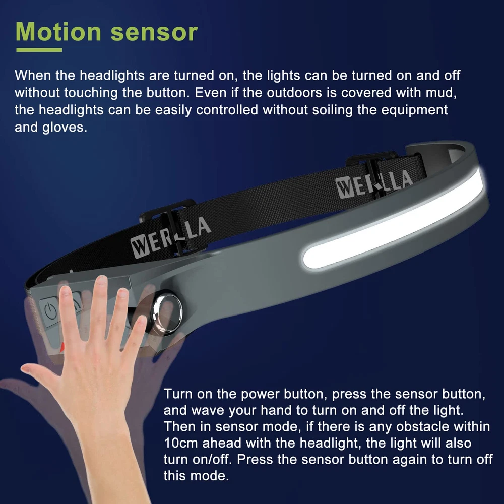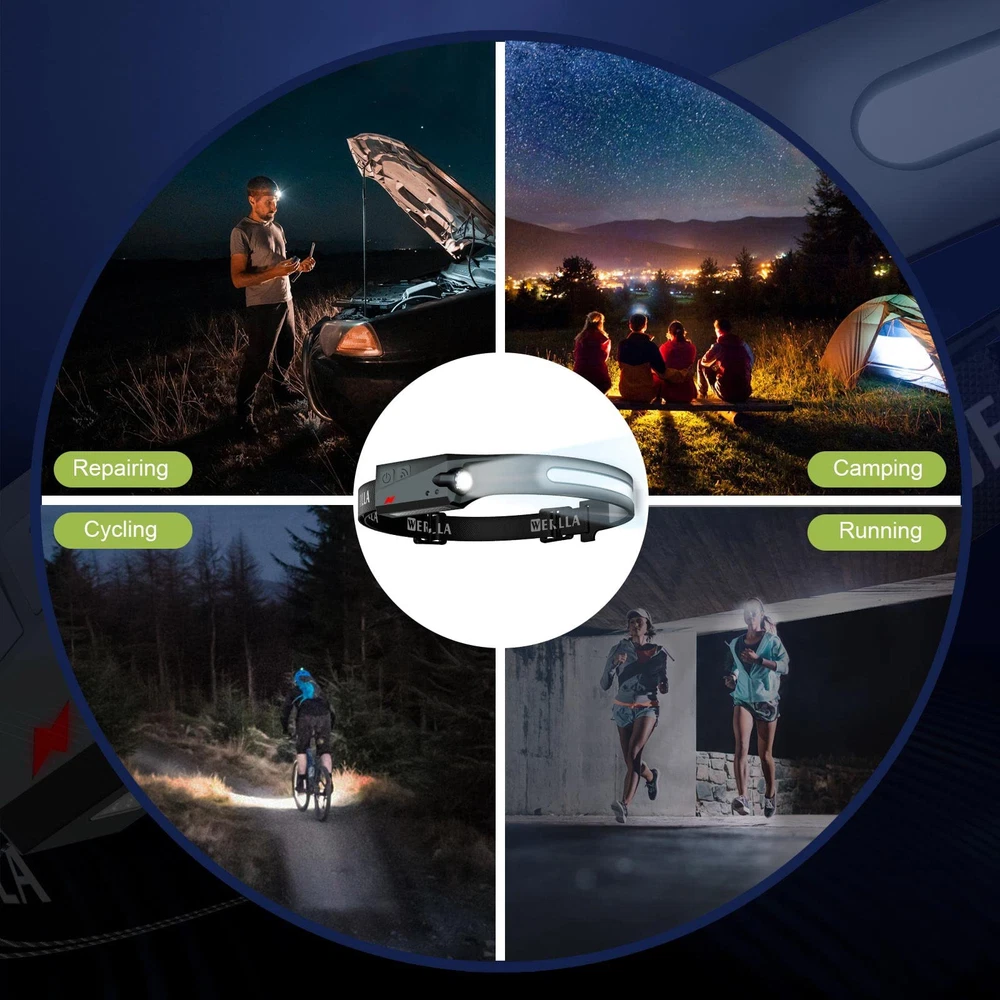 【Bright 230° Wide Beam & Spotlight】Offers high bright COB and XPE spotlights source, this led headlamp rechargeable have an excellent vision at night for walking, running and biking. Without moving your head, illuminate front the desired area with a wider range, to meet the needs of your different scenarios, such as camping, running, cycling, work and maintenance. 【5 Light Modes & Motion Sensor】The headlamps for adults rechargeable has 5 Light Modes, XPE LED: high (100%)/low (40%), COB: high (100%)/low (40%), Strobe: Press and hold mode; Using motion sensor design, you can easily control the headlight even when wearing gloves. When the light is on, short press the sensor key to make it enter the sensor mode (the indicator light changes from red to yellow), and then wave your hand within 10cm before receiving the sensor. Lights on/off. 【ADJUSTABLE COMFORTABLE WEAR】The head flashlight for adults fits all adult head sizes, consists of soft silicone and an adjustable elastic headband, and weighs only 2.47 ounces, even if you wear it all day, you won't feel it. It provides optimal comfort to your head. IPX4 water resistance means it's protected from splashes from all angles, so you don't need to worry if it rains or snows suddenly. 【USB-C convenient charging and long-term use】The head lights led is equipped with a USB-C rechargeable lithium battery and a Type-C USB input port, which can be fully charged for 2 hours. Working time is 3-8 hours in different light modes. If you need to illuminate for a long time, it is recommended to carry two at a time for emergencies. 【Perfect after-sales guarantee】Our outdoor running headlamp have undergone repeated tests and market research to meet the needs of different scenarios, such as outdoor running, mountain climbing, work and maintenance, and have been liked by the market and many customers. We have zero tolerance for quality. If you are not satisfied with the purchased product, please notify us immediately and we will refund you.