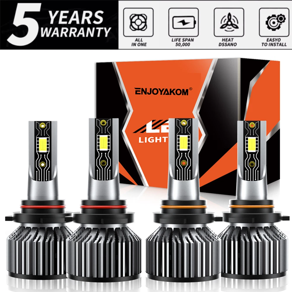 Number of Bulbs: 4 EAN: Does not apply Placement on Vehicle: Front, Left, Right Wattage: 150W Other Available Type: Foglight Kit Application 1: For Headlight High Low Beam/led bulbs car headlights UPC: 161400256357 Application 2: led headlights for car &led bulb light bulbs Feature 2: light bulbs & leds/Light Bulbs Combo Kit Voltage: 9V-36V Lumens: 26000lm Country/Region of Manufacture: United States Lighting Type: Specialty Head Light Bulb More LED Kit We Have 2: H4/9003/HB2 9004/HB1 9007/HB5 9008/H13 D1/D1S D2/D2S D3S D4S Interchange Part Number: 9005 High beam + 9006 Low beam More LED Kit We Have 1: 9005 9006 HB3 HB4 H11/H8/H9/H16 9012/HIR2 H1 H7 Chips Type: CSP LED Chips, Super Bright OE/OEM Part Number: 6500K LED Headlights Size: the same as the car original light Other Part Number: HB3 high beam + HB4 low beam gtin13: Does not apply Features: CAN bus Compatible, road Legal, Rust-Resistant Light Color: Cold White Performance Part: Yes Suitable For: High Beam, Headlight, Low Beam MPN: ENJOYAKOM-Headlamp Bulb Manufacturer Warranty: 5 Year Lighting Technology: LED Manufacturer Part Number: 9005+9006 Fit 1: Car, Motorcycle, Motorbike, van, truck, pickup, SUV, vehicles Superseded Part Number: Replacement Halogen Xenon Led Light Bulbs Bulb Life Hours: Up to 50000 Hours More LED Kit We Have 3: 9005/9145/H10/9140 5202/2504 880/892/893/899 881/898/889/894 H3 Model: LED Headlight Conversion Kit Fit 2: Easy Installation, Heat Resistant, Higher brightness/Super Bright White To Fit: Headlight Vintage Part: Yes Brand: ENJOYAKOM Type: Headlight Kit Sealed Housing: IP68, Shockproof, Dustproof & Waterproof Ballast Included: Yes Bulb Fitment Code: 9005/HB3 + 9006/HB4 Fitment Type: Direct Replacement Material: Aviation 6063 aluminum profile Color Temperature: 6500K Universal Fitment: Yes