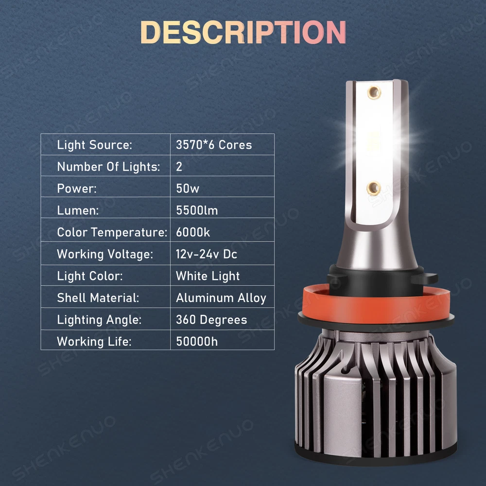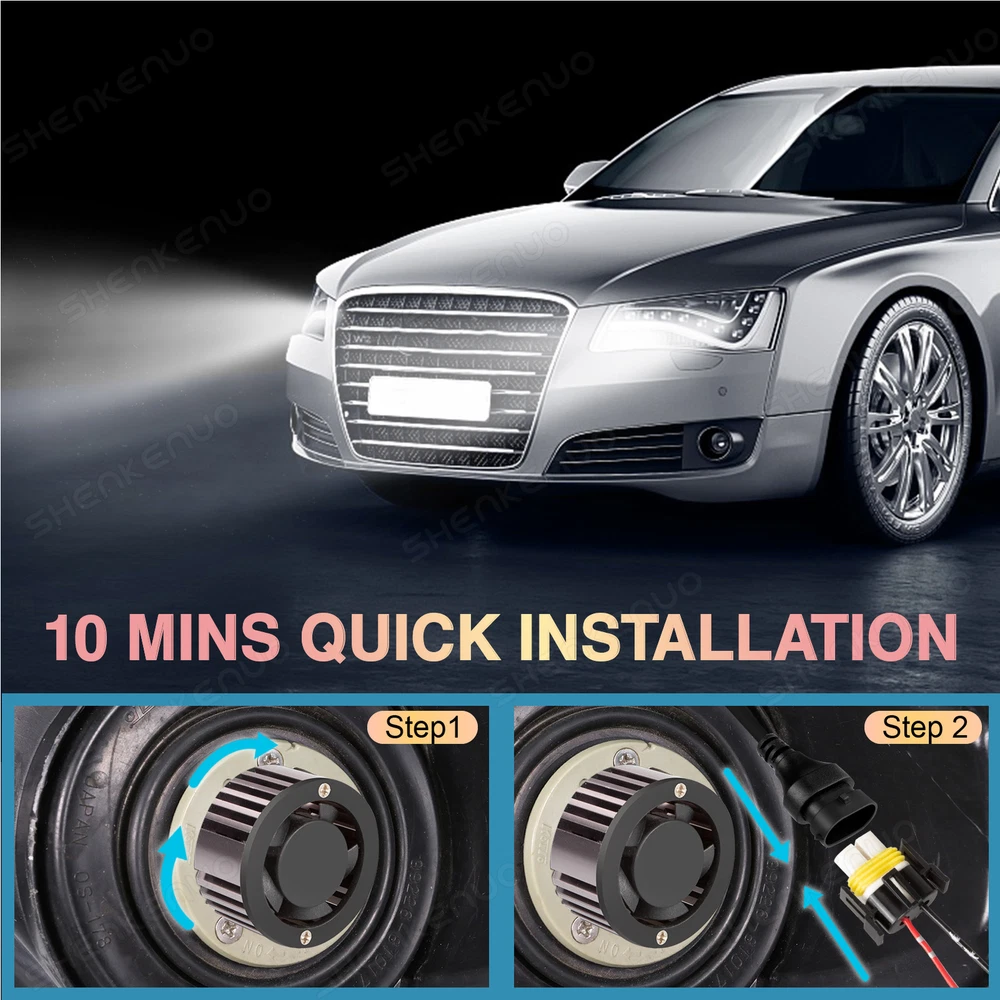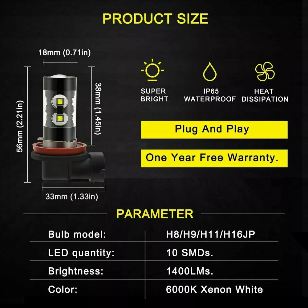 This package includes 9005 High Beam Headlight + H11 Low Beam Headlight + H11 Fog Light Bulbs. LED Headlights Bulbs: 9005/H11 LED replacement bulbs are engineered for superior performance, exceptional looks, and increased safety. Especially designed for upgrading the Headlight bulb Bulb Size: 9005(=HB3), H11(=H8) Beam Type: High Beam / Low Beam Color Temperature: 6000K - White Wattage: 50W Lumens: 5500LM Working Voltage: DC 9V to 36V Waterproof Level: IP68 Material: Aluminum alloy Lifespan: > 50,000 Hours Product Advantages: High brightness: The latest cob with 6000K cool white LED chip; 300% brighter than the existing halogen headlights. Advanced technology ensures perfect beam patterns without any black spots. Glow on all sides: 360 degree no dead angle lighting, use more clear and bright at night Strong heat dissipation: equipped with highly silent heat dissipation fan, speed up to 12000/min, heat dissipation efficiency, can avoid temperature accumulation on the beads, prolong the service life of the beads. IP68 waterproof: using integrated radiator and aluminium body self-cooling, waterproof and heat-proof. Even in extreme cases, the enclosure of the rainproof driver can work properly. Automatic short circuit protection. Simple Installation: Installation only takes 10 minutes. No relay. There is no capacitor. No additional wiring. Plug and play. LED Fog Lights Bulbs : Bulb Size: H11(=H8) Voltage: DC 9V to 36V Color Temperature: 6000K Wattage: 50W Lumens: 5500LM Color: White Lifespan: >50, 000 hrs This new product has high luminous efficiency, low power consumption and long service life. Easy installation, Direct plug in and play. Best used for Fog/ Driving lights/ Daytime Running Light DRL Faster on/ off response time Energy saving, environmental protection, Stable performance, through strict test, Use safer driving Why Use LED Headlight Bulb? If you find this listing, you are must looking for brighter white headlight bulbs with an excellent beam pattern for upgrade. Congratulations, you find what you want now! LED headlight bulbs is a successful replacement for Halogen bulbs, it is brighter and more reliable, perfect for high-beam (and also low beam, fog, & driving lights) use. With it, you will get much better night driving, and also, much better seen during the day. Package Included: 2 x LED High Beam Bulbs 2 x LED Low Beam Bulbs 2 x LED Fog Light Bulbs New and old packaging will be shipped randomly!! Install Caution 1. As a safety precaution, make sure that the car has had time to cool down properly before starting the installation process. 2. Put the vehicle into park or make sure it is securely in gear. 3. Make sure to have the ignition turned off and the keys removed. 4. Be careful to avoid burns, especially when turning on or off the vehicles lighting. 5. Be careful to avoid crushing or cutting the bulbs. Also make sure to not touch the bulbs with your fingers, as this will cause blotting. 6. Fully examine the connection of the contact points, ports and the wires as faulty connections can cause lighting problems. 7. Make certain that the end of the bulb does not come in contact with the interior light shield of the headlight when adjusting the bulb. 8. Please install car headlight dust cover to ensure the normal operation of the lamp (to prevent dust and small ribbons to reduce the chances of bulb cooling fan broken to ensure the normal operation of the cooling system) Note After installation, dust prevention measures must be done, LED lamp life depends on the cooling performance is good or bad. The lamp heat mainly active cooling (fan-cooling based, supplemented by the whole aviation aluminum heat dispassion ) as the main cooling method, the life of the fan in lamp bulb directly affects the life of LED lights On Nov 21, 2024 at 02:31:40 PST, seller added the following information: