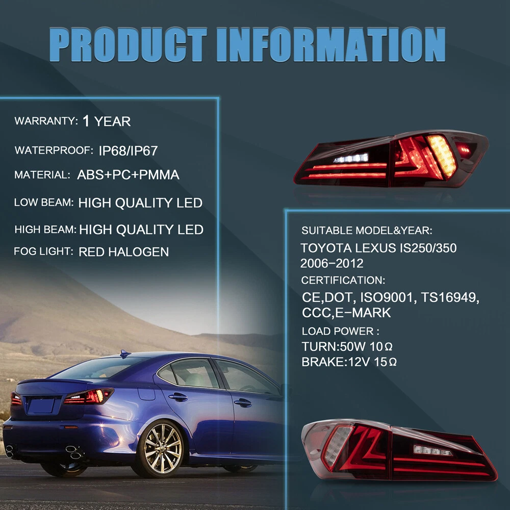 Full LED Headlights & Tail Lights For Lexus IS250 350 ISF 2006-2013 2 Pairs Headlights Unfortunately, your browser does not support videos. Taillights Unfortunately, your browser does not support videos. Compatibility Fitment: For 2006-2013 LEXUS IS250 IS350 Sedan 4-Door For 2008-2015 LEXUS IS F Sedan 4-Door Specifics & Features ☑ Product Condition : 100% brand new in original box ☑ P ackage Includes: 1 set 4pcs(driver & passenger side) ☑ Installation: plug & play, easy to install by yourself. (professional installation is recommended) ☑ Bulbs: all bulbs are built-in, no extra bulbs needed. ☑ Functions: LED DRL, LED turn signal, Sequential turn signal. ☑ Color: Headlights: Amber Reflector; Taillights: Red ☑ Accessory Pack : Headlights: User manual*1; ACC Wire*1 Taillights: User manual*1 Warranty Quality Warranty: One year. Please feel free to contact us if you have any problems before leaving negative feedback, we will try our best to figure your problem out & make you satisfied. Note Please confirm whether these car lamps can fit your car before you purchase, if you are not sure, please contact us. Using your factory-supplied connector/harness will avoid cutting or modifying any wires. Benefits of LED making you safer on the road for other road users to see. On Nov 11, 2024 at 02:14:40 PST, seller added the following information: On Nov 12, 2024 at 03:50:54 PST, seller added the following information: On Nov 13, 2024 at 00:54:45 PST, seller added the following information: