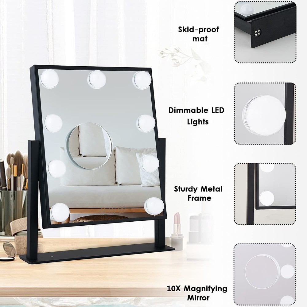 Perfect Size: The makeup mirror (11.8" L x 10" H) allow you to get your entire face in view at once. Large tabletop mirror is large enough to be used for makeup, grooming and even dressing. 360 degree rotation can be fixed in any position, providing you with a perfect perspective Natural & Bright Lighting: Lighted makeup mirror surrounded by 9pc LED bulbs with day light / cool light / warm light settings, adjustable brightness is meet to your personal makeup requriement Smart Touch Control & Memory Function: Simply turn on/off the vanity mirror, touch the sensor switch on the screen to adjust the brightness. Memory function makes this lighted vanity makeup mirror return to the same brightness it was on before being switched off Metal Frame & High Quality LED Bulbs: The Tabletop Vanity Mirror Made of top materials, sturdy and durable. The pre-installed LED bulb has a life span of up to 50,000 hours, soft light protect your eyes Great Vanity Mirror: The Hollywood Style Makeup Cosmetic Mirrors with Lights can add elegant decoration to your bedroom and dressing table area. Make it the best mirror for makeup lovers