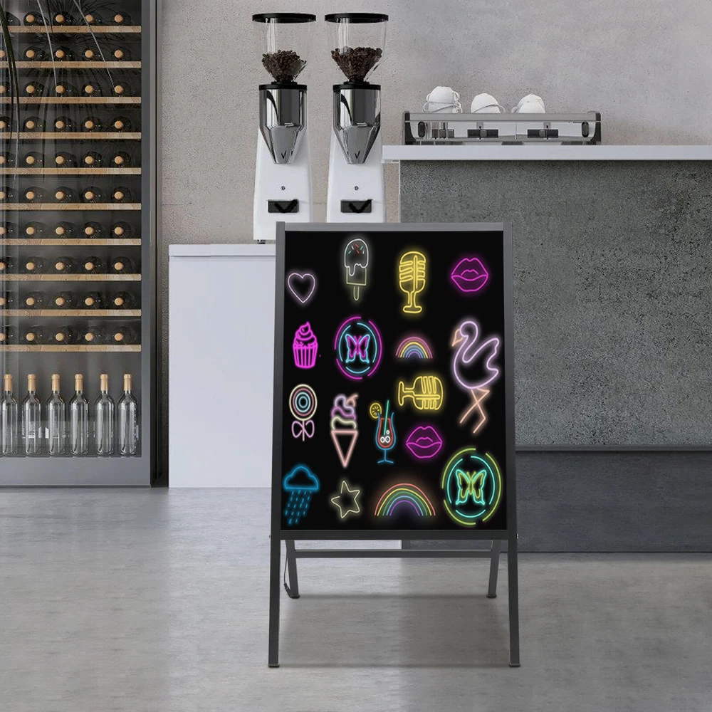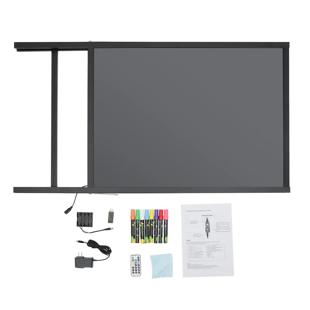 LED Message Writing Board Illuminated Erasable Lighted Chalkboard Menu Sign New Description Show your unique tagline for your store with this LED message writing board! It is a one-piece design, so it can be used without assembly requirements. With 8 color fluorescent markers, you can DIY the display contents freely. Besides, it comes with a controller and a remote control, which makes it easy to control and easy to adjust and combine the light effect among 7 light colors and 11 flashing modes, making your signs and logos more eye-catching and attractive. Key Features Made to Last: The product made of high-quality tempered glass and aluminum alloy with a welding process is strong, durable, and resistant to corrosion, deformation, and abrasion. Attention Catcher: The 23.62*31.5-inch writing surface is ideal for writing your notes, messages, memos, calendars, menus, reminders, and more. The combination of various fluorescent colors, 7 light colors, and 11 flashing modes will display your message in a vivid and eye-catching way and attract the attention of passers-by. Dual Power Types: It comes with a 6.56ft long power cord so that you can install it with more flexibility, or you can also choose to use the battery box which needs 8 AA batteries(not included) to use it without wire length limits. Two Control Methods: The product consists of a controller with a button to control the light color and a remote control to change the light color and flashing mode from a distance. You are free to choose the way you like. Easy to Carry: The lightweight(12.79 lbs) and foldable stand make it easy to be carried from one place to another. Simple Clean-up: The tempered glass writing panel and the equipped soft cloth make it convenient and easy for you to clean this product. One-piece Design: It allows you to use it directly after receiving it without assembly requirements, which saves you effort and time. Protective Package: To prevent the product from being damaged during transportation, we packed it with foam to protect your products to the maximum extent possible. Customer Service: We aim to provide quality products and services. If you have any problems, please feel free to contact us. We will reply and solve the problem for you as soon as possible. Details 8 Fluorescent Markers: These fluorescent markers with different colors allow you to freely create your favorite drawings, advertising writings, or daily menus on the boards and let your creativity run wild. Sturdy Feet: With four sturdy feet and a strong connection, the product can hold the board stably and prevent it from toppling. Application It is suitable for homes, weddings, restaurants, hotels, retail stores, shopping malls, supermarkets, clubs, nightclubs, bars, businesses, classrooms, cafes, special promotional decorations and special events, etc. It is a good substitute for party decorations, menu boards, electronic message boards, wedding decorative boards, digital signage, and so on. Specifications Color: Black Style: Modern Shape: Rectangular Material: Tempered Glass, Aluminum Alloy Process: Welding Assembly Required: No Mount Type: Free Standing Plug Type: US Standard Power Source: Battery Powered/Power Corded Battery Type: 8*AA Batteries(Not Included) Power Cord Length: 2m/6.56ft Panel Size: 60*80cm/23.62*31.5inch Product Overal Height: 120cm/47.24inch Packaging Size: 116*68.5*5.5cm/45.67*26.97*2.17inch Gross Weight: 6.3kg/13.89lbs Net Weight: 5.8kg/12.79lbs Package Included 1*LED Message Writing Board 8*Fluorescent Markers 1*Battry Box 1*Adapter 1*Remote Control 1*Controller 1*Soft Cloth 1*English Manual Notes Please check the size carefully before ordering. Please clean the marks with a dry cloth. Please allow the slight color difference caused by the shooting light and 1-3cm error due to manual measurement, and make sure you do not mind before you order. Payment Delivery details Terms of sales About us Contact us Payment We accept ebay payment 。 Fees such as import duties, taxes are not included in the item price or shipping costs. These charges are the buyer's responsibility. Delivery details Shipping: 2-9 working days to: USA Terms of sales We maintain high standards of excellence and strive for hundred percent customer satisfaction. Feedback is very important to us. We hope that you contact us immediately before you give neutral or negative feedback, so that we can address your concerns. It is impossible to address issues if we do not know about them! About us Your satis faction is our ultimate goal. We work hard to earn your trust and future business. Our certified technicians have tested each item before shipping. The unit comes with 1 year limited warranty on all manufacturing defects. a) If you receive a defective item, you may return it or ask for a discount. Please contact us within 14 days after you receive the package. b) What you returned must be intact and in its original packaging as re? u. Customer is responsible for shipping costs of the returned item. c) We will cover the cost of shipping back t with the shipping rate indicated in the registration page. We will send you a new unit or refund the full payment you paid. Thank you. Contact us Business Hour Business Hour: Monday To Friday: 8:30 AM to 5:00 PM (Beijing China time) Due to time zones, our reply to your questions may not be immediately. But within above working time, we will reply your email within 24 hours. If it's non-workdays, please kindly be patient and wait till Monday. Please contact us with ebay message. Please feel free to contact us if you have any questions. Monday To Friday: 8:30 AM to 5:00 PM (Beijing China time) Due to time zones, our reply to your questions may not be immediately. But within above working time, we will reply your email within 24 hours. If it's non-workdays, please kindly be patient and wait till Monday. Please contact us with ebay message. Please feel free to contact us if you have any questions. Brand Unbranded MPN N/A Typ