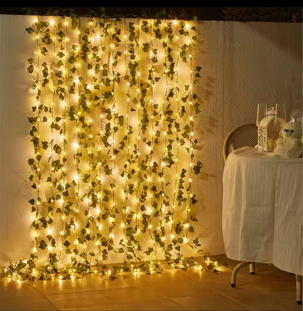 The Fake Green Leaf Ivy Vine with LED Lights is a decorative piece suitable for indoor use in various rooms such as the bedroom, living room, and kitchen. The vine features yellow and green LED lights that emit a soft and flexible glow, making it perfect for occasions like Christmas, birthdays, weddings, and other special events. Powered by batteries, this artificial vine adds a touch of nature-inspired ambiance to your space, creating a warm and inviting atmosphere. Ideal for adding a whimsical touch to your home decor or special celebrations.