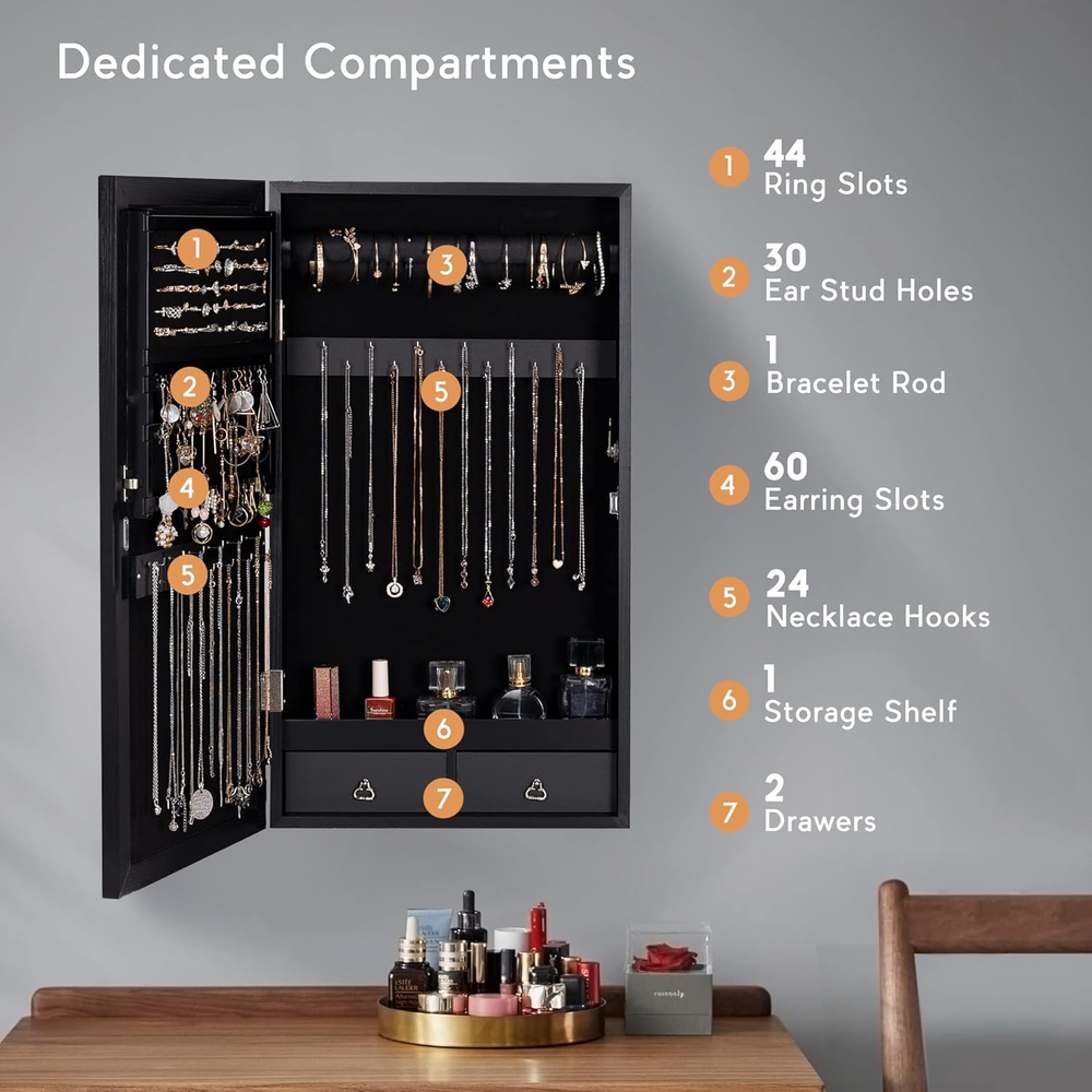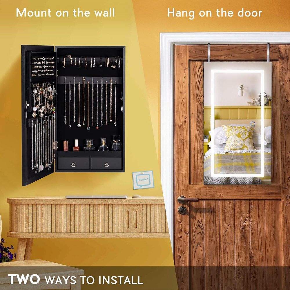 Store New Arrivals Add to Favorite View Feedback Contact Jewelry Armoire with LED Lighted Mirror, Wall/Door Mounted Frameless Mirror with 3 Color Lights, Lockable Jewelry Cabinet Hanging Jewelry Organizer with 2 Drawers - Black Description Item model number WGSSG007-Whi Style Modern Number of Items 1 Country of Origin China Batteries Included? No Jewelry Storage Type Jewelry Armoire Batteries Required? No Number of Compartments 1 Special Feature Jewelry Organizer Product Dimensions 3.35"D x 14.57"W x 26.38"H Material Engineered Wood, Glass Number of Drawers 2 Closure Type Key Lock Item Weight 14.3 pounds Occasion Wedding, Birthday Special Features Jewelry Organizer Target Audience Women Part Number WGSSG007-Bla Mounting Type Wall Mount Color Black Inner Material Engineered Wood Shape Rectangular Recommended Uses For Product Face Makeup 2-in-1 Design - It is not only a jewelry armoire, but also a frameless mirror that brings you a clearer and wider view. It allows you to wear jewelry or check your makeup before going out or attending a party. Chic frameless design adds elegance to your room and helps to make full use of limited space. 3 Color Lights - The LED lights are controlled by the round touch switch. Touch to switch on and press and hold to adjust brightness between cold, natural, and warm light to meet your practical or romantic needs. Lights are powered by an adapter and leave you no worry about changing batteries. Large Storage Space - This jewelry armoire is specially designed for securing and organizing your precious jewels. Comes with 60 earring slots, 30 ear stud holes, 44 ring slots, 24 necklace hooks,1 bracelet bar, 1 interlayer, and 2 small drawers. Fully functional compartments allow you to find what you want in no time. High Quality & Safe - P2 grade material features a smooth, bend-resistant, and a durable MDF surface. Soft velvet lining protects your jewels against scratches and damage. Our jewelry organizer also comes with a lock and keys for stopping naughty kids or pets from messing with your precious jewels. Space-saving Storage - Our jewelry armoire is already assembled. Just install the enclosed hooks on the back of door or on the wall and hang the jewelry organizer up. No sophisticated operations nor large area is required. Chic and stylish design fits very well in your home, bedroom, living room, and entryway decoration, and ensures you a convenient and organized life. Product Description Specifications Material: P2 grade MDF, glass, flannelette Color: black Product Size: 26.4 × 14.57 × 3.9 in Product Weight: 14.3 lbs Package Weight: 17.6 lbs Package Size: 29 × 16.8 × 6.6 in Jewelry Armoire with LED Lighted Mirror A must-have piece for your daily makeup and elegant life! Lavievert jewelry armoire is designed with a frameless full length mirror which features a chic, concise, and elegant look. It not only serves as your practical jewelry organizer, but also adds your room with elegance. From now on you have to worry about neither your messy jewels, nor no place to store all your jewelry. Our jewelry armoire may organize and store all your jewelry together. Best choice to save time and ensure a simple life. You may live a delicate life form now! Fashionable & Stylish Design Cold white, natural, and warm yellow light modes are available. Dedicated compartment design makes it easy to pick out what you want. 2 height options are available to hang on the door and meet varying heights of people. No matter you want it a present to friends or a treat to yourself, it is an ideal choice. Fully Functional Compartments Thanks to the spacious and reasonable partitions, you may sort and store your jewels like professionals. Soft Lining Black velvet lining protects your jewelry against abrasion and scratches. Touch Button Touch the switch button to switch between 3 light colors; touch and hold to do adjustments. Lockable Design Designed with keys and a lock to protect your jewelry against naughty pets and kids. Space-saving You may mount it on the wall or hang it on the door to save space. Ideal for small apartments or bedrooms. Powered by Adapter Unlike batteries, our adaptor is more friendly and features a 59 in long cable. ABOUT US We offer the best prices around on high quality products. Our E-store includes media such as books, movies, music and games while offering electronics, toys, sporting apparel, clothing, tools, general home, garden items and more. SHIPPING We are always working hard to ensure your package arrives as soon as possible. Please understand that some factors like weather, high postal traffic, and the performance of shipping companies are outside of our control. We offer free shipping to the lower 48 states and ship within 2 business days of payment, usually sooner. We do not accept P.O. Boxes. Please provide a physical address. For shipping outside of the continental USA, we only use eBay's Global Shipping Program.The item is shipped to KY and then sent to the rest of the world. International customers are responsible for all duties and taxes. Continue to check out in order to calculate costs for shipping the item to your country. Messages regarding eBay's Global Shipping Program MUST be directed at eBay EXCLUSIVELY. RETURNS We offer a 30-Day Return Policy on items which you are not completely satisfied with. You have the option for a full-refund or an exchange of the item. No returns are available on items shipped outside of the USA. PAYMENT We accept PayPal. CONTACT US This page content is yet to come Please ad us to your favorite seller and visit again later Thank You CUSTOMER SATISFACTION We try our very best to make sure every customer is completely satisfied. If there's a problem, message us! We're happy to help. WE ACCEPT Copyright © 2021 AutoDS. | All Rights Reserved