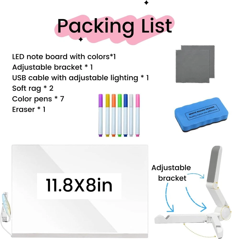 1. 【10 Dynamic LED Light Modes & Vibrant Colors】 Elevate your space with 7 dazzling colors and 10 lighting effects! This LED light board creates mesmerizing doodle glow displays for parties, offices, or home decor. Switch between static/fade/flash modes to set the perfect ambiance—ideal for highlighting memos, menus, or creative artwork 2. 【Professional-Grade Acrylic Dry Erase Surface】 Engineered for high-traffic use! The acrylic dry erase board features a scratch-resistant, crystal-clear surface that erases flawlessly—no ghosting or stains. Perfect for daily task lists, project planning, or collaborative brainstorming in busy offices 3. 【All-in-One Message Center for Modern Spaces】 Your ultimate communication hub! This led message board shines in offices (meeting reminders), homes (grocery lists), and venues (event signage). Its eye-catching glow ensures no note goes unnoticed, blending function with stylish decor 4. 【Eco-Friendly & Stress-Free Cleaning】 Maintain perfection in seconds! New marks? Erase instantly with the included tool. Dried stains? Lightly spritz water, then wipe with a damp cloth + dry towel. No chemicals needed—this magic board stays pristine for years 5. 【Versatile Decor & Functional Gift】 Transform spaces effortlessly! Use as a glowing menu board in cafes, motivational quote display in workspaces, or party welcome sign at events. Packaged as a sophisticated gift set loved by professionals and creatives alike Product description The video showcases the product in use. The video guides you through product setup. The video compares multiple products. The video shows the product being unpacked. LED Light Up Message Board Merchant Video