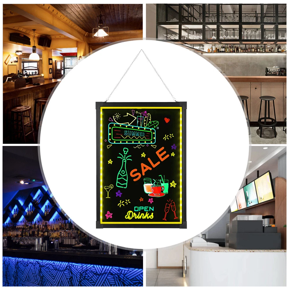 Illuminated LED Message Writing Board Specification Material: Tempered Glass, Aluminum Alloy, PP Color: Black Light Source: LED(5050) Plug: US Standard Power: 0.36W Voltage: AC110-240V DC12V 1A Power Supply: Plug-in/8*AA Batteries(Not Included) Light Colors: Red, Green, Purple, Yellow, Pink, Blue, White Fluorescent Colors: Red, Green, Purple, Yellow, Pink, Blue, White, Orange Number of Light Effects: 18 Length of Power Cord: 2m/6.56ft Working Temperature: -40~60℃/-40-140℉ Product Size: 50*70cm/20*28in 40*60cm/16*24in 60*80cm/24*32in Package Included 1x Led Writing Board 8x Fluorescent Pens 1x Remote Control 1x USB Controller 1x Cloth 1x Clear Chain 1x Power Cord with Plug 1x English User Manual LED Light Up Writing Board Flashing Illuminated Message Menu Sign Board 3-Size Description Description This LED message writing board with 7 color variations and 18 combinations of light effects can attract customers' attention with its eye-catching highlighter and brilliant light effects to bring excellent promotional effects. Such an innovative and unique promotion assistant is a must-have for milk tea stores, bars, and restaurants. Specification Material: Tempered Glass, Aluminum Alloy, PP Color: Black Light Source: LED(5050) Plug: US Standard Power: 0.36W Voltage: AC110-240V DC12V 1A Power Supply: Plug-in/8*AA Batteries(Not Included) Light Colors: Red, Green, Purple, Yellow, Pink, Blue, White Fluorescent Colors: Red, Green, Purple, Yellow, Pink, Blue, White, Orange Number of Light Effects: 18 Length of Power Cord: 2m/6.56ft Working Temperature: -40~60℃/-40-140℉ Type Middle Size Small size Large Size Size 50*70cm/20*28in 40*60cm/16*24in 60*80cm/24*32in Package Size 77.8*59*5.5cm/30.62*23.22*2.16in 66*48.5*5.5cm/25.98*19.09*2.16in 86.5*59*5.5cm/34.05*23.22*2.16in Gross Weight 4kg/7.71lbs 3kg/6.61lbs 5.5kg/12.12lbs Net Weight 3.5kg/7.71lbs 2.5kg/5.51lbs 5kg/11.02lbs Package Included 1x Led Writing Board 8x Fluorescent Pens 1x Remote Control 1x USB Controller 1x Cloth 1x Clear Chain 1x Power Cord with Plug 1x English User Manual Key Features High-quality Materials : This LED message writing board is made of a white translucent tempered glass panel, aluminum alloy frame, and PP back panel. These high hardness and impact-resistant materials make the product sturdy and durable. Convenient and Harmless : The included highlighter will be wiped clean easily without dirt and dust keeping you away from the harmful chalk dust of traditional chalk, which is more healthy and convenient. Impressive and Attractive : The product features 7 colors of light and 18 combinations to bring you a dynamic, colorful and attention-catching display to attract more customers' attention for you. The black PP back panel contrasts with the colorful highlighter and light effect, presenting a visual feast. Energy-saving and Environmental Friendly : The product's power of only 0.36 watts makes it more energy-saving and environmentally friendly as it does not consume too much power even for long-time use. The long-life, recyclable LED light source is more eco-friendly. DIY Fun : Equipped with eight colors of highlighters and an easy-to-wipe glass panel, the message writing board is also an ideal tool for drawing and doodling. Travel with your child to the ideal kingdom of imagination and color! Large Area : The enlarged LED message writing board (3 sizes) provides you with enough space to write slogans, prices, products, and other content to attract customers. And the larger layout with gorgeous lighting is more eye-catching. Simple Operation : The product is equipped with a remote control that allows you to adjust the light color and combination of light effects with just one click, which is very convenient and flexible. Dual Power Supply : The product can be powered by both a power cord and battery to suit different scenes indoors and outdoors. Multi-functional : This LED message writing board is a good substitute for conventional blackboard, teaching board, party decoration, electronic message board, light-up whiteboard, wedding decoration board, digital signage, etc. Protective Packaging : The product is carefully packed in cardboard boxes to avoid damage during transportation. The protective packaging allows the product to reach you intact. Customer Service : We aim to provide quality products and services. If you have any problems, please feel free to contact us. We will reply and solve the problem for you as soon as possible. Details Hooks : Both sides of the product are equipped with hooks to allow you to hang it horizontally and vertically to present different effects. Anti-collision Corners : The four corners of the product are equipped with anti-collision protectors to effectively prevent collisions. Transparent Chain : Transparent chain with hooks allows you to hang the writing board easily. Controller : Connect the controller to the LED board, and adjust the light by pressing the button above. When using the remote control, you can adjust the light and switch by pointing at the controller. Application This product is used for decoration, billboards, blackboards, etc. at home, in shops, bars, restaurants, etc. How to Use the Fluorescent Pen 1. Cover the pen with the cap and shake it up and down several times to make the ink flow more smoothly. 2. Press the pen tip up and down against the contact surface. 3. The pen is ready to write when the ink comes out. 4. Please remember to cover the pen after use to prevent staining elsewhere. Notes Wiping with a towel dipped in water is not recommended. Please use the included cleaning cloth. Please read the user manual carefully before use. Please note that the batteries are not included because of aviation safety policy, you need to prepare eight AA batteries. Please allow the slight color difference caused by the shooting light and 1-3cm error due to manual measurement. Please make sure you do not mind before you order. Welcome to the yiyiukmall ! We are committed to 