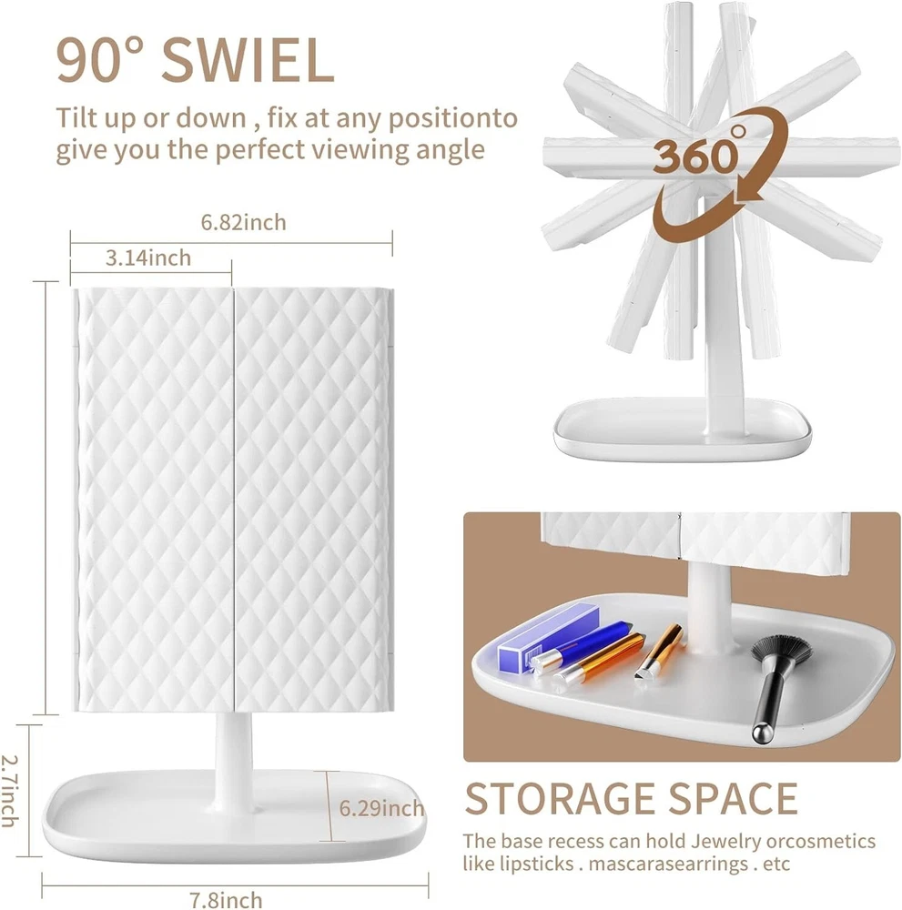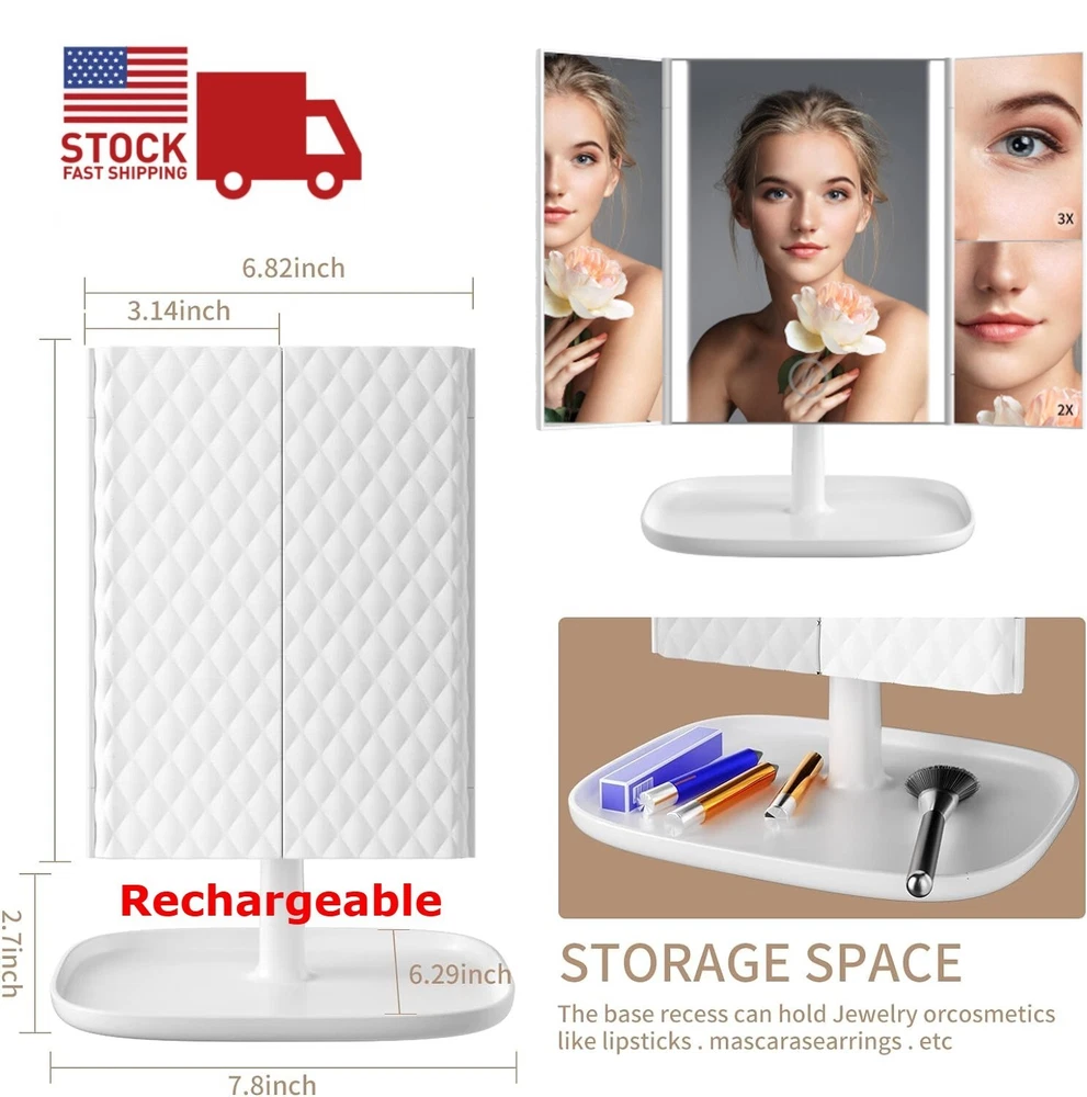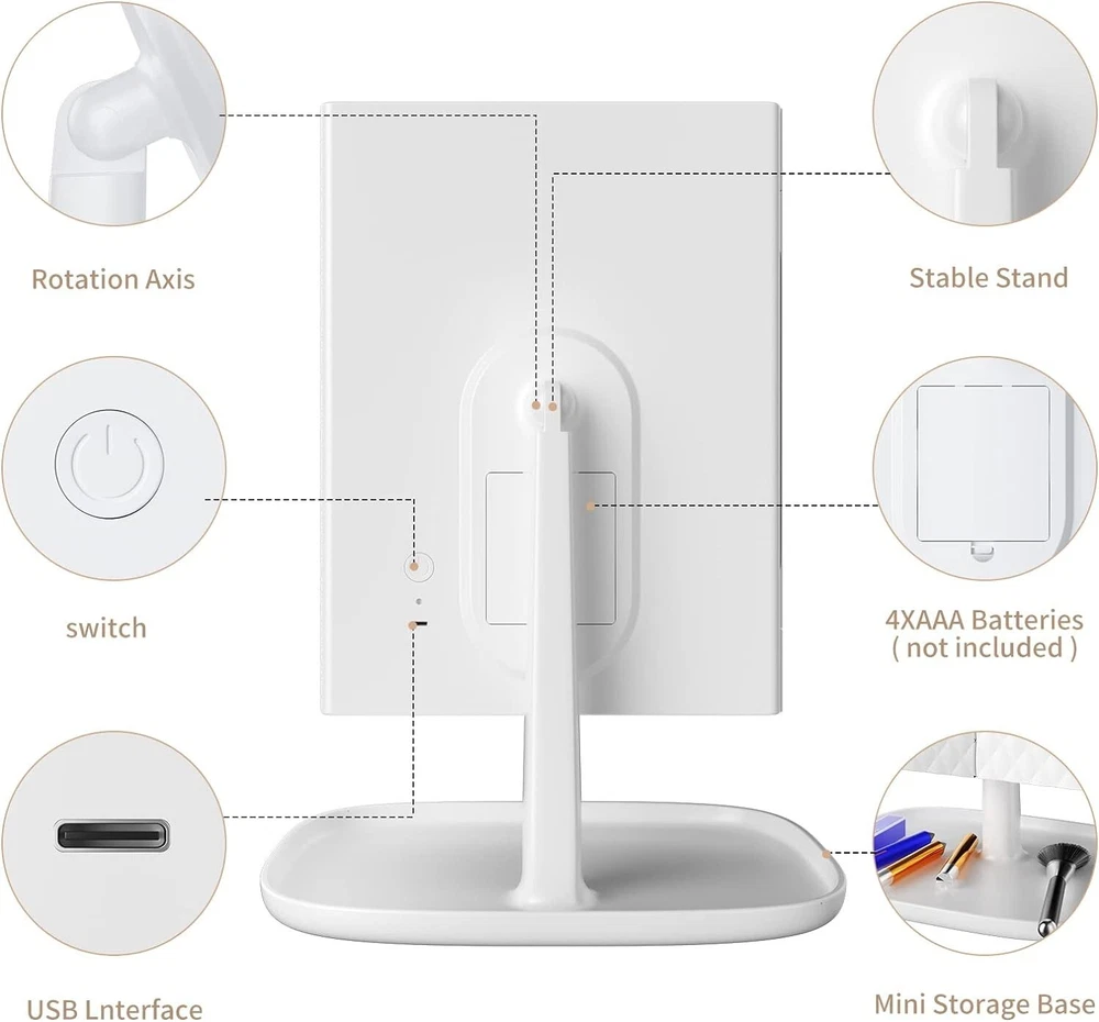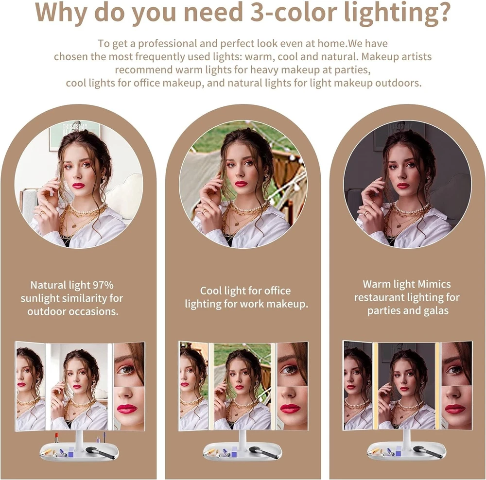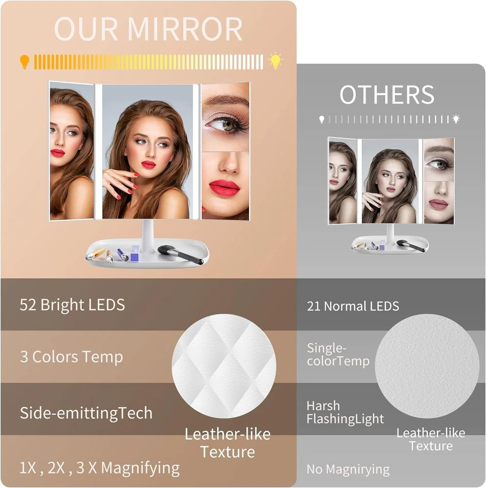 Dual Power Supply Makeup mirror with light is powered by USB charging cable or 4 AAA batteries; USB cable included, charger and batteries not included. High quality UV coating is used to make the mirror shiny and smooth, thus preventing surface scratches, fingerprints and oil stains. 360 Degree Swivel and Tri-Fold The dresser mirror can be adjusted up and down 360 degrees and then fixed to ensure a perfect and comfortable viewing angle. The foldable design saves valuable dresser space, and the folded mirror decorates your dresser with a delicate leather texture. 1X/2X/3X Magnification HD Mirror Illuminated makeup mirror has 3 panels for magnification and wide angle viewing; see your face clearly for a flawless makeup look, perfect for desktop makeup and handheld use. The illuminated makeup mirror offers a wide angle view, creating an ultra clear view of your skin. About this item Abs 52 LED & 3Color Lighting Modes- The makeup mirror brightness can be adjusted by touching the sensor switch. On/off button on the back of the mirror. Very suitable for use in dimly lit areas. The light is natural and soft, bright but not dazzling, protecting your eyes. The base recess can hold Jewelery cosmetics, watch, earrings, bracelets, etc.to meet our daily needs. 1X/2X/3X Magnification HD Mirror - Illuminated makeup mirror has 3 panels for magnification and wide angle viewing; see your face clearly for a flawless makeup look, perfect for desktop makeup and handheld use. The illuminated makeup mirror offers a wide angle view, creating an ultra clear view of your skin, making your outfit easier and perfect, perfect for applying eyeliner, mascara, grooming eyebrows and trimming. Dual Power Supply - Makeup mirror with light is powered by USB charging cable or 4 AAA batteries; USB cable included, charger and batteries not included. High quality UV coating is used to make the mirror shiny and smooth, thus preventing surface scratches, fingerprints and oil stains. This compact mirror with light is not only great for your bedroom but also makes a great travel lighted mirror for your daily out and about. 360 Degree Swivel and Tri-Fold - The dresser mirror can be adjusted up and down 360 degrees and then fixed to ensure a perfect and comfortable viewing angle. The foldable design saves valuable dresser space, and the folded mirror decorates your dresser with a delicate leather texture. Perfect gift for women - Birthday gift, Valentine's Day gift, Mother's Day gift, Christmas gift for teenage girl, family, wife or girlfriend, or other special day gift. This compact mirror with light is not only suitable for your bedroom, but also a perfect travel lighted mirror for your daily outings. Thanks to the detachable design, it can be easily carried everywhere.