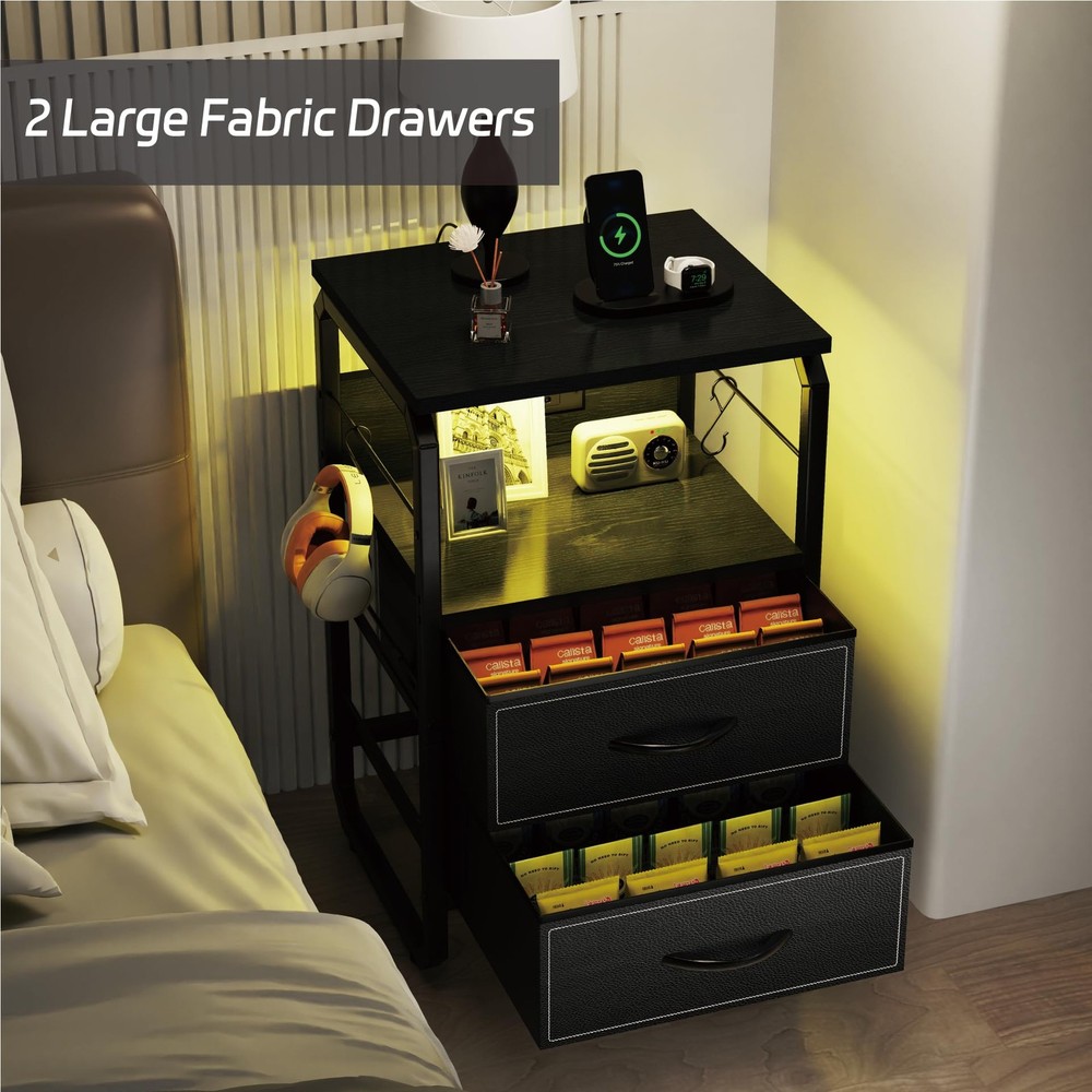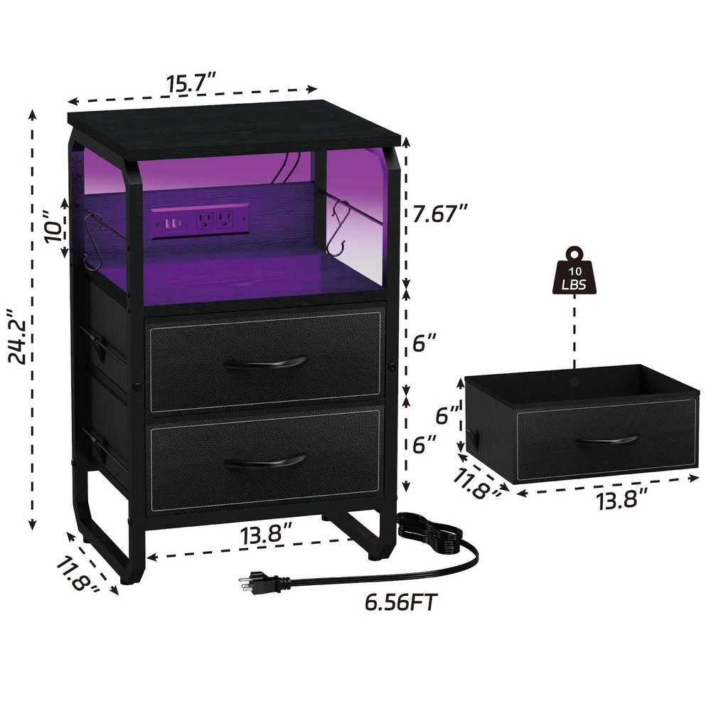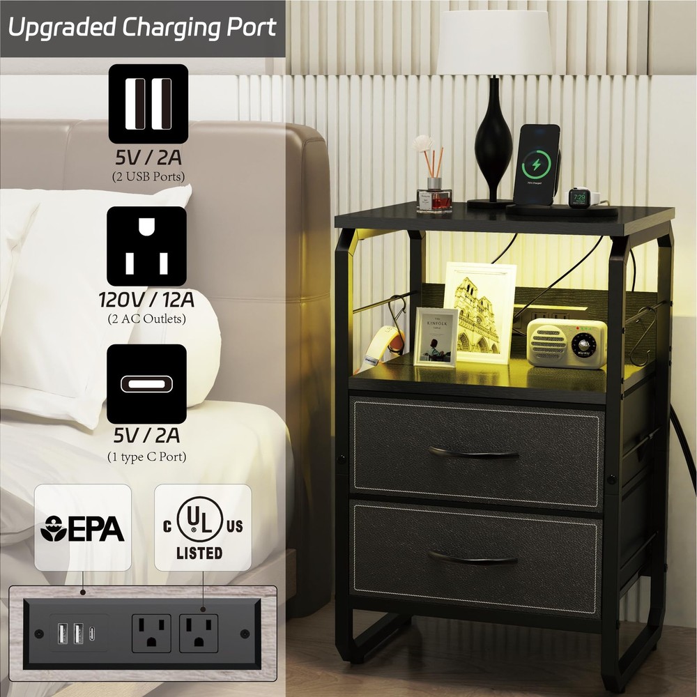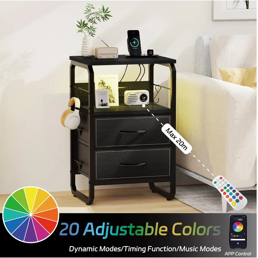This Nightstand with Charging ports is a quick and simple way to update your home!Our nightstand with charging station has four colors and style to choose, Placed on your bedside, put on a little warm lamp, read a book before sleep, what a wonderful moment. Use our bedside table, get a blissful sleep.Multifunctional end table:Charging Station: 2 power outlets and 3 USB ports are enough to charge your phone, lamps, and smart speaker.Long power supply cord: 6.6ft long power supply cord support allows you to place your end table in most placesTight and stable structure: The reinforced metal frame and high-quality MDF board offer a large weight capacity. The top shelf can hold up to 100lbs.Large drawer with storage space: This nightstand has large drawer and 2 wooden shelves, the large storage space can meet all your demand.All the necessary accessories are together with our package.This night stand is great for bedroom, living room, entryway, etc Charging is a Breeze: With a built-in outlet including 1 Type C port, 2 AC outlets, and 2 USB ports, daily charging need would be satisfied. It adapts to phone, tablet, laptop, and more electronics Enjoy a Light Show: Light with 20+ RGB colors and 20+ dynamic modes would be a surprising bonus for your home setting. Freely adjust the brightness and color temperature by using the APP or the remote control. Create your best light show with this mesmerizing LED night table! Storage Helper: 2 fabric drawers offer sufficient storage space for your essentials or clothes. Keep tidy in your bedroom, living room, home office, closet, or dorm with this fabulous bed side table Explore Vertical Storage: Extra bars were added on the table side, and 2 hooks are provided for hanging keys or headphone. Build up a vertical storage space by hanging more stuff on the flank area of the night table Quality & Service Commitment: The fabric drawers of nightstand with an extra hard bottom can load up to 15 lbs. Thick wooden board and metal tube make a sturdy LED night stand. Assembly would be super easy with clear instructions and handy tools. Feel free to contact us if you need extra support, we will reach you within 24 hours