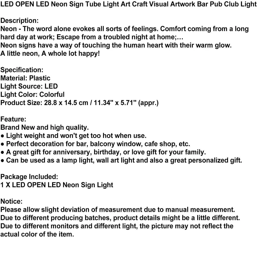 You may also like BAR LED Neon Sign Lights Bedside Night Light Children Room USB Powered 23.85 USD Free shipping LED Rainbow Neon Sign Light LOVE 3D Bedside Night Light Wedding Party Decoration 22.85 USD Free shipping BAR Neon Sign Light LED Juice Letter Neon Lamp Tube Party Night Light Lamp 47.85 USD Free shipping 1~3Pcs Toilet Night Light LED Motion Activated Sensor Bathroom Bowl Lamp 8 Color 11.85 USD Free shipping Lantern Stove Check Valve & Air Stem Assembly Part Accessories 200 6381 ZCL 14.85 USD Free shipping LED OPEN LED Neon Sign Tube Light Art Craft Visual Artwork Bar Pub Club Light Description: Neon - The word alone evokes all sorts of feelings. Comfort coming from a long hard day at work; Escape from a troubled night at home;… Neon signs have a way of touching the human heart with their warm glow. A little neon, A whole lot happy! Specification: Material: Plastic Light Source: LED Light Color: Colorful Product Size: 28.8 x 14.5 cm / 11.34'' x 5.71'' (appr.) Feature: Brand New and high quality. ● Light weight and won't get too hot when use. ● Perfect decoration for bar, balcony window, cafe shop, etc. ● A great gift for anniversary, birthday, or love gift for your family. ● Can be used as a lamp light, wall art light and also a great personalized gift. Package Included: 1 X LED OPEN LED Neon Sign Light Notice: Please allow slight deviation of measurement due to manual measurement. Due to different producing batches, product details might be a little different. Due to different monitors and different light, the picture may not reflect the actual color of the item. -About US Founded in 2012, VIPJQ have professional development and sales, and are involved in various products, providing customers with various high-quality products. Since its establishment, VIPJQ has always adhered to the service concept of "customer first" and the management concept of "pursuit of quality", and is committed to providing customers with high-quality original designs. We commit to provide you the best innovative, quality products & professional services with competitive prices. We value every customer, and we look forward to providing solutions for your business needs to help your business achieve its goals, please contact us immediately! We are all about you! We are a Japanese seller,but with large warehouse in USA. We are profesional on Auto Parts,Car Parts,Motorcycle Parts,3C,other hot sale items and so on. We aim to provide to customers high quality product and best service. -About Shipment&Returns The item usually will be dispatched within 3 days after you ordered.All are free shipping. And it usually takes 3-10 working days to delivery depends on buyers' address or other majeure on the way. If you are not satisfied with the items and want to return the item,we hope you could message us first,we will give you the return details, we think we could give you the best service to save your time and money.Thank you. -About Feedback&Customer Service If you are enjoy your shopping here,not only enjoy the items but also the service,we are appreciate you could give us a 5-star feedback. If you are not satisfied with the item,before you give us the negative feedback,we hope we could give you the best solution through our commutication. We think we could do it if you give us the chance.Thank you.